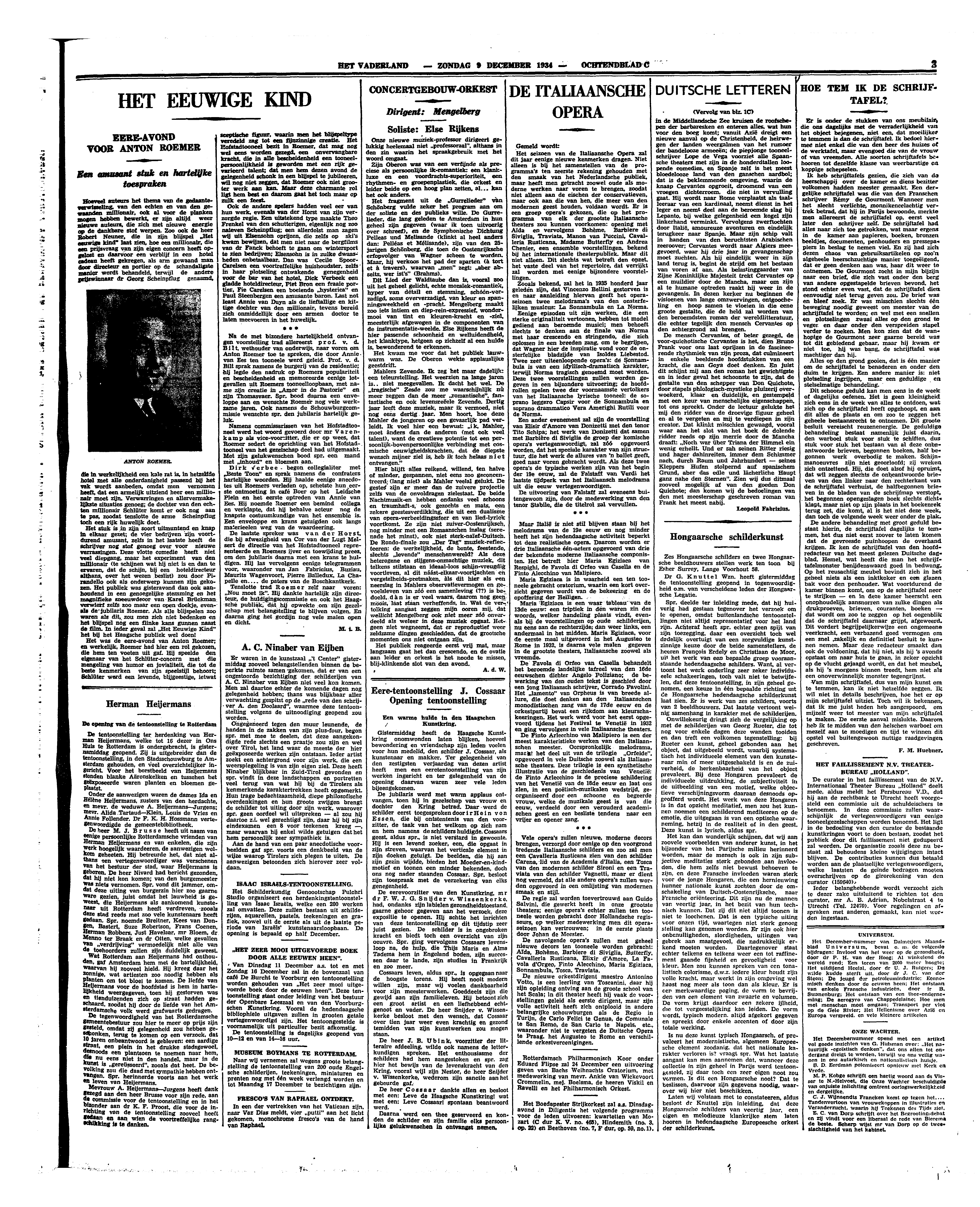 Het stuk is in zijn soort uitmuntend en knap in elkaar gezet; de vier bedrijven zijn voortdurend amusant, zelfs in het laatste heeft de schrijver nog stof genoeg over voor nieuwe verrassingen. Deze vlotte comedie heeft niet veel diepgang, maar het experiment van den millionair (te schijnen wat hij niet is en dan te ervaren, dat de schijn, bij een hoteldirecteur althans, over het wezen beslist) zou door Pirandello ook als onderwerp kunnen zijn gekozen. Het publiek was gisteravond dan ook aanhoudend in een genoegelijke stemming en het magnifieke sneeuwdecor van Karel Brückman verwierf zelfs zoo maar een open doekje, evenals de jubilaris Roemer. Als alle blijspelen zoo waren als dit, zou men zich niet bedenken en het blijspel nog een flinke kans gunnen naast de film. In ieder geval zal ‘Het Eeuwige Kind’ het bij het Haagsche publiek wel doen!