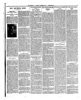 Hoeveel auteurs het thema van de gedaanteverwisseling, van den echten en van den gewaanden millionair, ook al voor de planken mogen hebben bewerkt, er zijn altijd weer nieuwe auteurs, die zich met nieuwe energie op de dankbare stof werpen. Zoo ook de heer Robert Neuner, die in zijn blijspel ‘Het eeuwige kind’ laat zien, hoe een millionair, die een prijsvraag van zijn eigen concern heeft opgelost en daarvoor een verblijf in een hotel cadean heeft gekregen, als arm gewaand man door directeur en portier op de schandaligste manier wordt behandeld, terwijl de andere prijswinnaar dr Georg Scheinpflug genaamd, die in werkelijkheid een kale rat is, in hetzelfde hotel met alle onderdanigheid passend bij het vak wordt aanbeden, omdat men vernomen heeft, dat een armelijk uitziend heer een millionair moet zijn. Verwarringen en allervermakelijkste situaties genoeg; de dochter van den echten millionair Schlüter komt er ook nog aan te pas, zoodat tenslotte de arme Scheinpflug toch een rijk huwelijk doet.