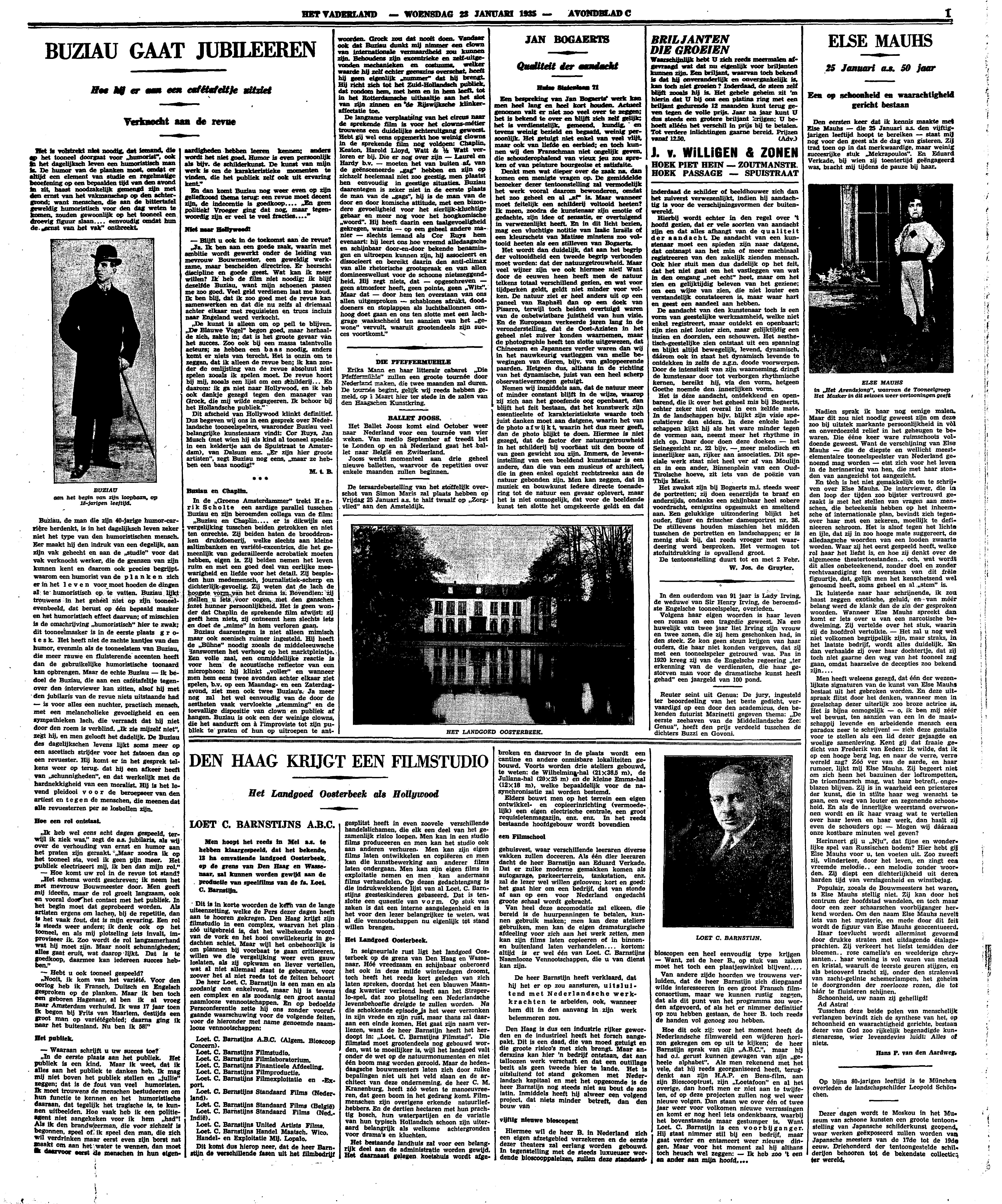 ‘Ja. Ik ben aan een goede zaak, waarin met ambitie wordt gewerkt onder de leiding van mevrouw Bouwmeester, een geweldig werkzame, maar bescheiden directrice. Er heerscht discipline en goede geest. Wat kan ik meer willen? Ik heb de film niet noodig; ik blijf dezelfde Buziau, want mijn schoenen passen me zoo goed. Veel geld verdienen laat me koud. Ik ben blij, dat ik zoo goed met de revue kan samenwerken en dat die nu zelfs al driemaal achter elkaar met requisieten en trucs incluis naar Engeland werd verkocht.