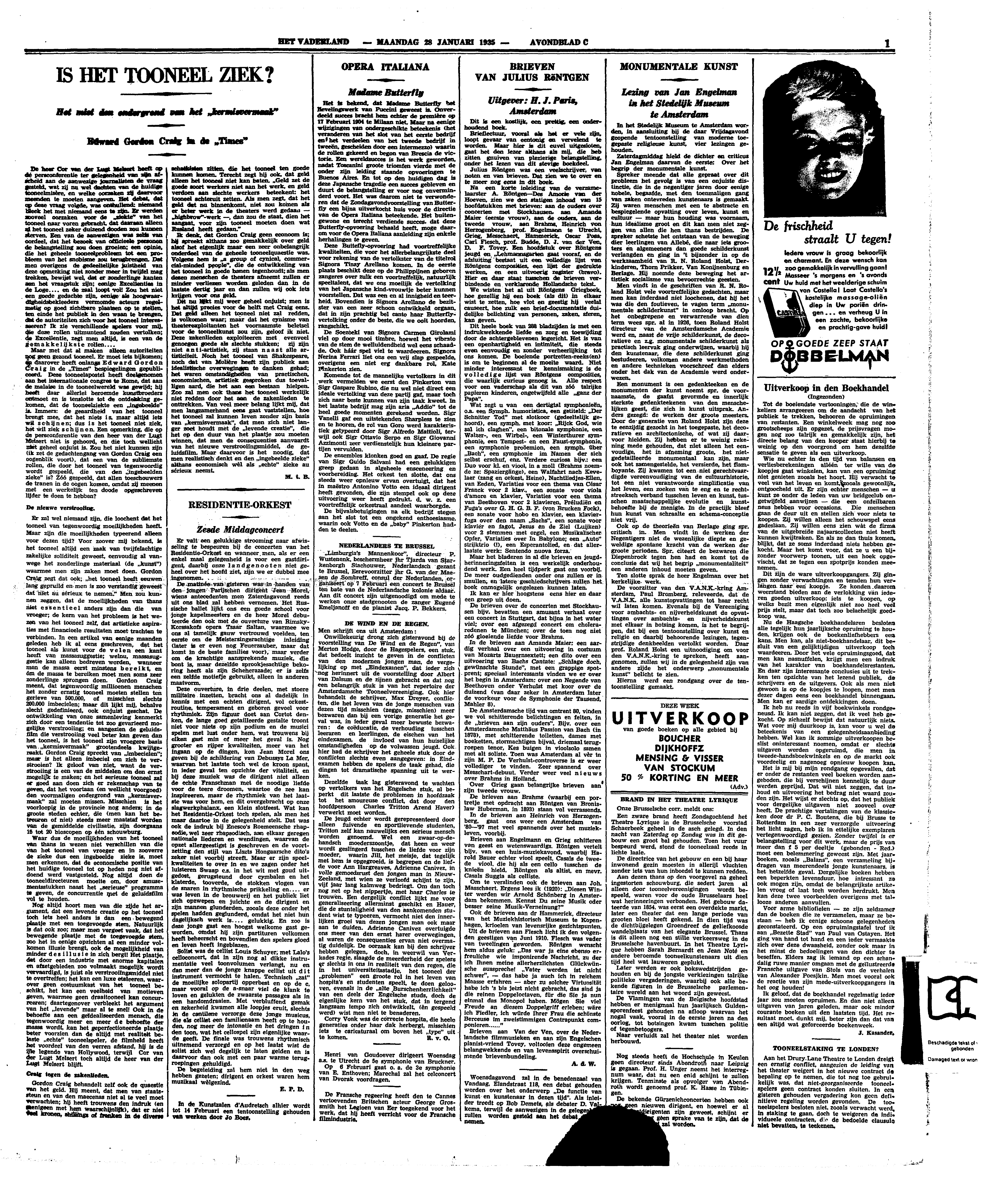 Maar met dat al maken alleen autoriteiten nog geen gezond tooneel. Er moet iets bijkomen; en daarover heeft onlangs Edward Gordon Craig in de ‘Times’ bespiegelingen gepubliceerd. Deze tooneelapostel heeft deelgenomen aan het internationale congres te Rome, dat aan de malaise in de tooneelwereld was gewijd; hij heeft daar allerlei beroemde kunstbroeders ontmoet en is tenslotte tot de ontdekking gekomen, dat de tooneelziekte een ‘ingebeelde’ is. Immers: de geaardheid van het tooneel brengt mee, dat het niets is, maar altijd iets wil schijnen; dus is het tooneel niet ziek, het wil ziek schijnen. Een opmerking, die op de persconferentie van den heer van der Lugt Melsert niet is gehoord, en die toch wellicht niet geheel onjuist is. Zou het niet kunnen zijn (ik zet de gedachtengang van Gordon Craig een oogenblik voort), dat een van de subliemste rollen, die door het tooneel van tegenwoordig wordt gespeeld, die van den ‘ingebeelden zieke’ is? Zóó gespeeld, dat allen toeschouwers de tranen in de oogen komen, omdat zij meenen met een werkelijk ten doode opgeschreven lijder te doen te hebben?