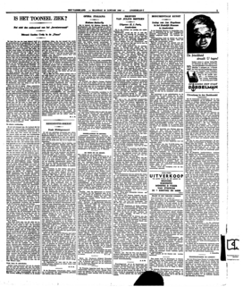 De heer Cor van der Lugt Melsert heeft op de persconferentie ter gelegenheid van zijn afscheid aan de aanwezige journalisten de vraag gesteld, wat zij nu wel dachten van de huidige tooneelmisère, en welke oorzaken zij daarvoor meenden te moeten aangeven. Het debat, dat op deze vraag volgde, was onthullend: niemand bleek het met niemand eens te zijn. Er werden zooveel oorzaken voor de ‘ziekte’ van het tooneel naar voren gebracht, dat daaraan alleen al het tooneel zeker duizend dooden zou kunnen sterven. Een van de aanwezigen was zelfs van oordeel, dat het bezoek van officieele personen de belangstelling zou doen groeien; een opinie, die het geheele tooneelprobleem tot een probleem van het snobisme zou terugbrengen. Dat men overigens de gedeeltelijke juistheid van deze opmerking niet zonder meer in twijfel mag trekken, bewijst wel, dat er zonderlinge kanten aan het vraagstuk zijn; eenige Excellenties in de Loge.... en de zaal loopt vol! Zou het niet een goede gedachte zijn, eenige als hoogwaardigheidsbekleeders vermomde acteurs regelmatig op goed zichtbare plaatsen op te stellen, ten einde het publiek in den waan te brengen, dat de autoriteiten zich voor het tooneel interesseeren? Ik zie verschillende spelers voor mij, die deze rollen uitmuntend zouden vertolken; de Excellentie, zegt men altijd, is een van de gemakkelijkste rollen....