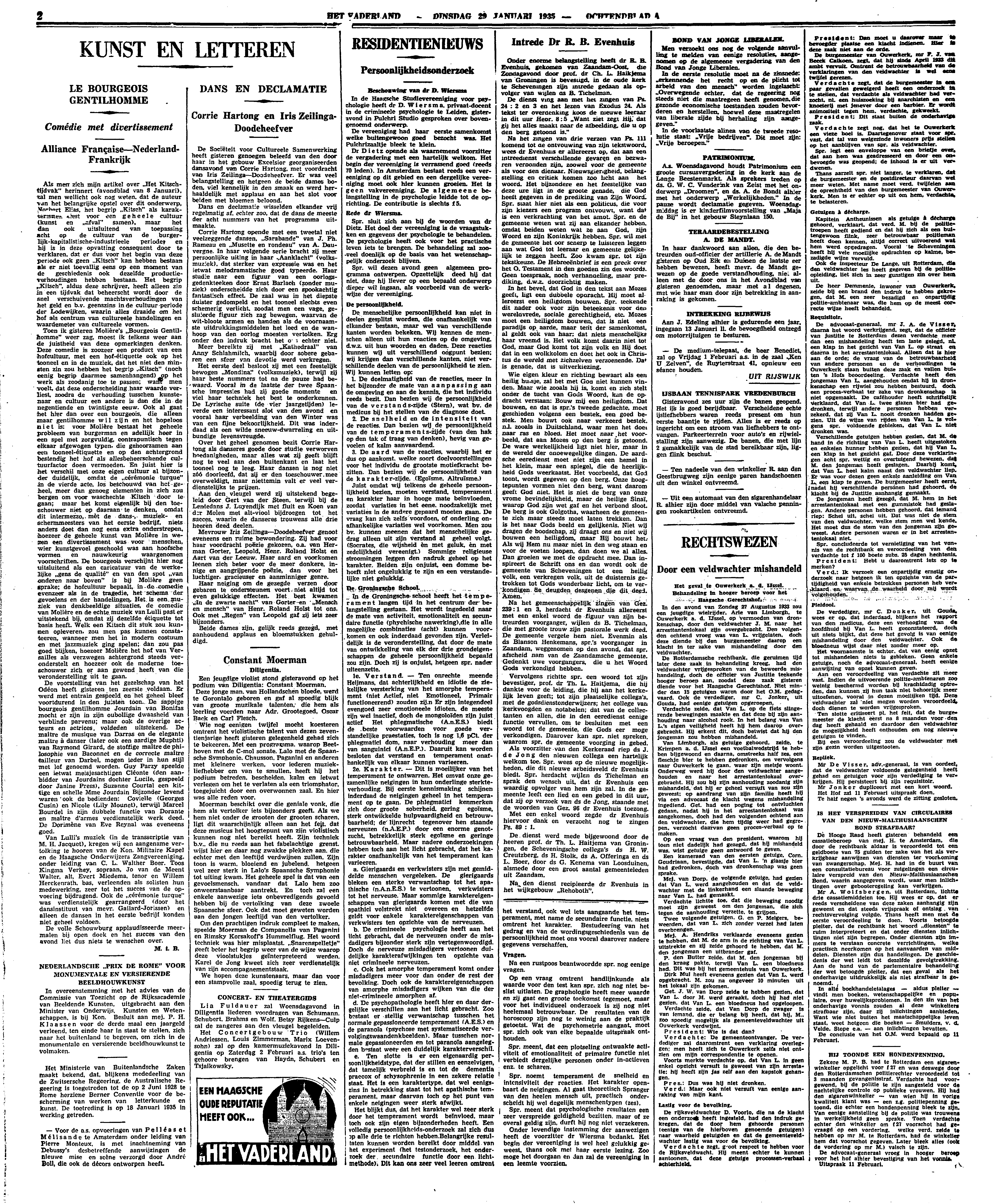 De voorstelling van het gezelschap van het Odéon heeft gisteren ten zeerste voldaan. Er werd met entrain gespeeld en het geheel bleef voortdurend in den juisten toon. De sappige bourgeois gentilhomme Jourdain van Bonifas mocht er zijn in zijn oubollige dwaasheid van verblinde parvenu; maar ook de overige acteurs en actrices, voldeden uitstekend. De maître de musique van Darras en de elegante maître â danser (later ook een aardige Muphti) van Raymond Girard, de stoffige maître de philosophie van Baconnet en de correcte maître tailleur van Darbel, mogen ieder in hun stijl met lof genoemd worden. Guy Parzy speelde een ietwat meisjesachtigen Cléonte (den aanbidder van Jourdains dochter Lucile, gespeeld door Janine Press), Suzanne Courtal een kittige en schelle Mme Jourdain. Bijzonder levend waren ook de bedienden: Covielle (Georges Cusin) en Nicole (Lily Mounet), terwijl Marcel Bourdel in zijn dubbele functie van Dorante en maître d'armes verdienstelijk werk deed. De Dorimène van Eve Reynal was eveneens goed.