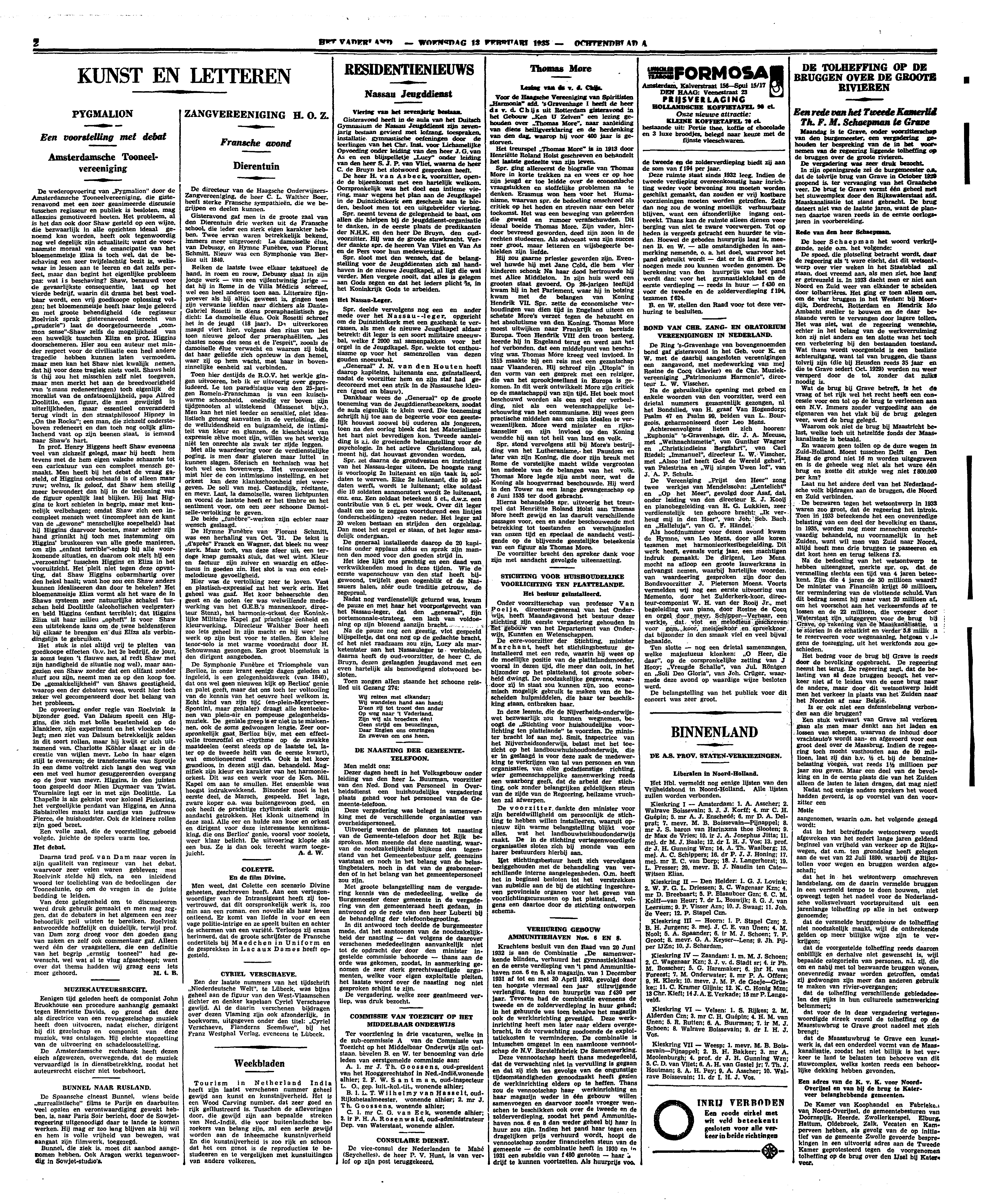 De wederopvoering van ‘Pygmalion’ door de Amsterdamsche Tooneelvereeniging, die gisterenavond met een zeer geanimeerde discussie tusschen regisseur en publiek is besloten, mag alleszins gemotiveerd heeten. Het probleem, al is het dan ook door Shaw gesteld op een wijze, die bezwaarlijk in alle opzichten ideaal genoemd kan worden, heeft ook tegenwoordig nog wel degelijk zijn actualiteit; want de voornaamste moraal van de emancipatie van het bloemenmeisje Eliza is toch wel, dat de beschaving een zeer twijfelachtig bezit is, weliswaar in lessen aan te leeren en dat zelfs perfect, maar dan begint het eigenlijke probleem pas: wat is beschaving? Shaw, benauwd voor de gevaarlijkste consequentie, laat op het vierde bedrijf, waarin dit drama het best voelbaar wordt, een vrij goedkoope oplossing volgen; het bloemenmeisje heeft haar lesje geleerd en met groote behendigheid (de regisseur Roelvink sprak gisterenavond terecht van ‘pruderie’) laat de doorgefourneerde ‘common sense’-Shaw zelfs de mogelijkheid van een huwelijk tusschen Eliza en prof. Higgins doorschemeren. Hier zou een auteur met minder respect voor de civilisatie een heel andere tragedie hebben kunnen laten vermoeden, maar men kan het Shaw niet kwalijk nemen, dat hij voor deze tragiek niets voelt. Shaws held is (hij zou het misschien zelf niet toegeven, maar men merkt het aan de breedvoerigheid van 's mans redeneeringen) toch eigenlijk de moralist van de onfatsoenlijkheid, papa Alfred Doolittle, een figuur, die men gewijzigd in uiterlijkheden, maar essentieel onveranderd terug vindt in den straatphilosoof Hipney in ‘On the Rocks’; een man, die zichzelf ondersteboven redeneert en dan toch nog oolijk glimlachend vast op zijn beenen staat, is iemand naar Shaw's hart.