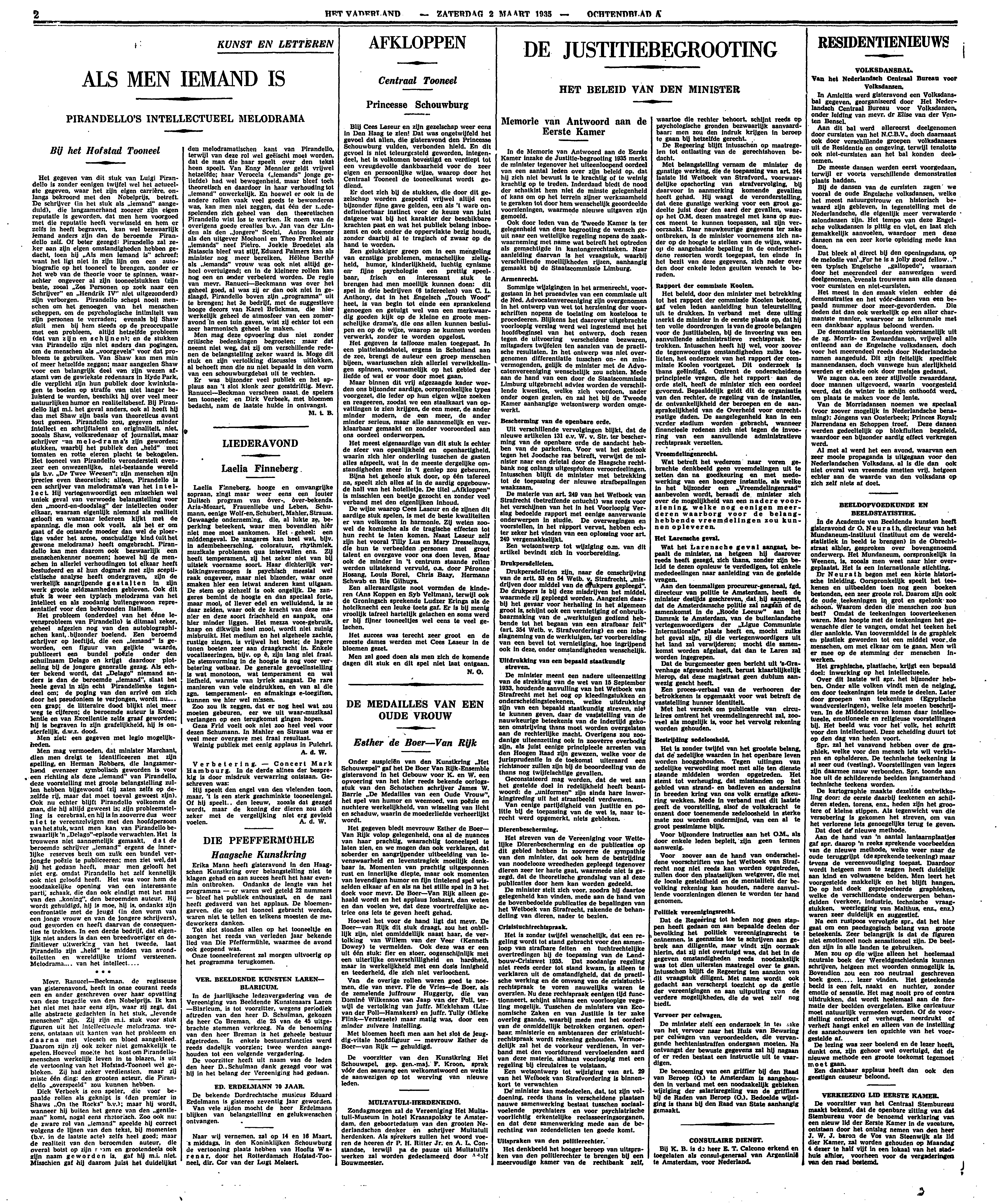 Dick Verbeek is een speler, die voor bepaalde rollen als geknipt is (den premier in Shaws ‘On the Rocks’ b.v.); maar hij wordt, wanneer hij buiten het genre van den ‘gentleman’ komt, nogal eens rhetorisch. Zoo ook nu: de zware rol van ‘iemand’ speelde hij correct volgens de lijnen van den tekst, bij momenten (b.v. in de laatste acte) zelfs heel goed; maar de realiteit van den beroemden auteur, die overal botst op zijn naam en grootendeels ook zijn naam geworden is, gaf hij m.i. niet. Misschien gaf hij daarom juist het duidelijkst den melodramatischen kant van Pirandello, terwijl van deze rol wel geëischt moet worden, dat de man die haar speelt over den tekst heen speelt. Van Enny Mennier geldt vrijwel hetzelfde; haar Veroccia (‘iemands’ jonge geliefde) had wel bewogenheid, maar bleef toch theoretisch en daardoor in haar verhouding tot ‘iemand’ onwerkelijk. En hoewel er ook in de andere rollen vaak veel goeds te bewonderen was, kan men niet zeggen, dat één der medespelenden zich geheel van den theoretischen Pirandello wist los te werken. Ik noem van de overigens goede creaties b.v. Jan van der Linden als den ‘jongere’ Scelzi, Anton Roemer als den uitgever Mochoni en Theo Frenkel als ‘iemands’ neef Pietro. Joekie Broedelet als Natascia bleef wat stijf, Eduard Palmers kan als minister nog meer bereiken, Hélène Berthé als ‘iemands’ vrouw was ook niet altijd geheel overtuigend; en in de kleinere rollen kan nog een en ander verbeterd worden. De regie van mevr. Ranucci - Beckmann was over het geheel goed, al was zij er dan ook niet in geslaagd, Pirandello boven zijn ‘programma’ uit te brengen; het 3e bedrijf, met de suggestieve hooge decors van Karel Brückman, die hier werkelijk geheel de atmosfeer van een zomeravond in een tuin gaven, wist zij echter tot een zeer harmonisch geheel te maken.