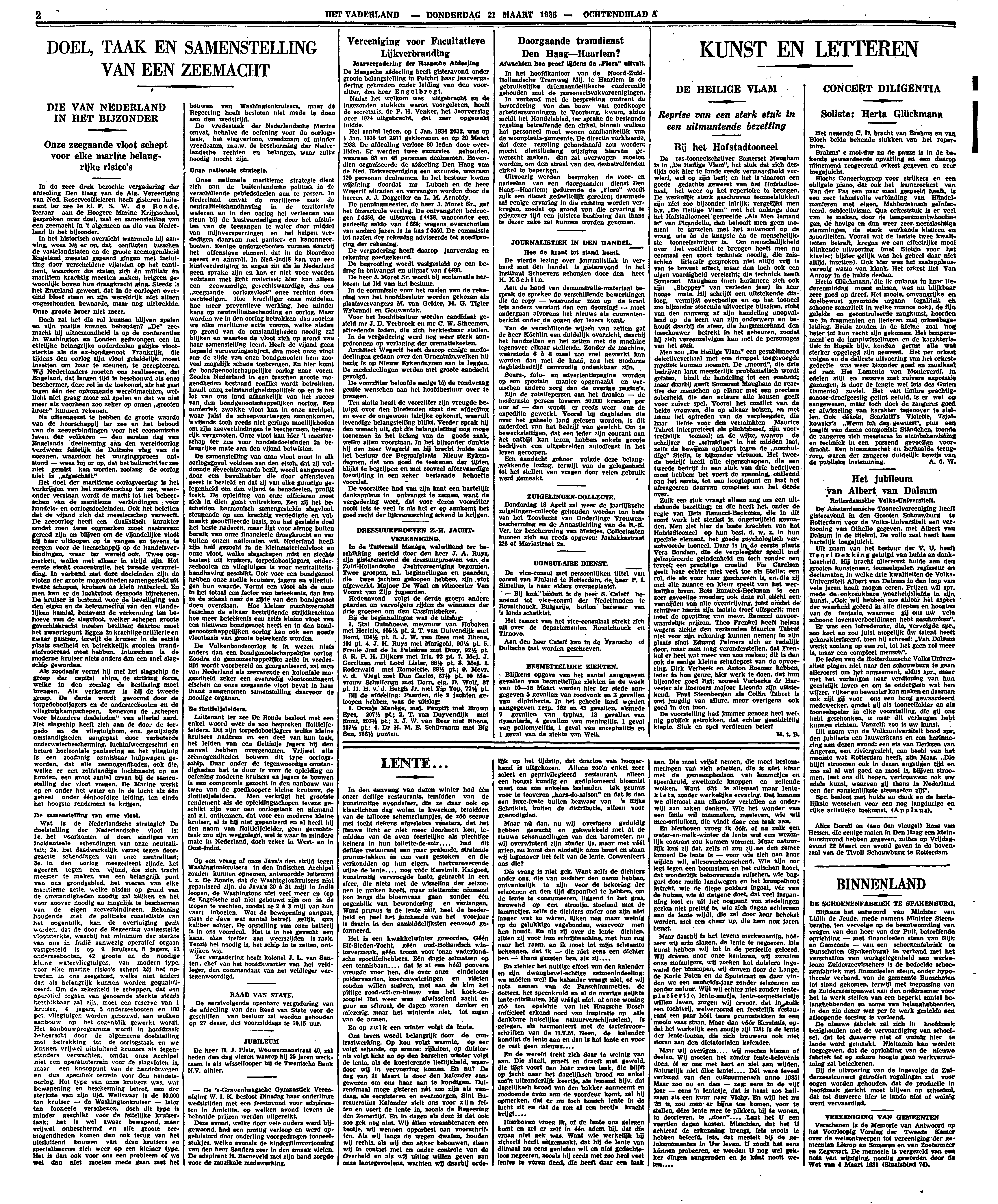 De ras-tooneelschrijver Somerset Maugham is in ‘De Heilige Vlam’, het stuk dat zich destijds ook hier te lande reeds vermaardheid verwierf, wel op zijn best; en het is daarom een goede gedachte geweest van het Hofstadtooneel, het weer op het repertoire te brengen. De werkelijk sterk geschreven tooneelstukken zijn niet zoo bijzonder talrijk; vergelijkt men b.v. ‘De Heilige Vlam’ met het onlangs door het Hofstadtooneel gespeelde ‘Als Men Iemand is’ van Pirandello, dan behoeft men geen moment te aarzelen met het antwoord op de vraag. wie èn de knapste èn de menschelijkste tooneelschrijver is. Om menschelijkheid over het voetlicht te brengen heeft men nu eenmaal een soort techniek noodig, die misschien litterair gesproken niet altijd vrij is van te bewust effect, maar dan toch ook een eigen vaardigheid vereischt; die techniek heeft Somerset Maugham (men herinnere zich ook zijn ‘Sheppey’ van verleden jaar) in zeer hooge mate. Hij schrijft een uitstekende dialoog, vermijdt overbodige en op het tooneel zoo bijzonder storende uitvoerige bijzaken, richt van den aanvang af zijn handeling onopvallend op de kern van zijn onderwerp en behoudt daarbij de sfeer, die langzamerhand den toeschouwer betrekt in het gebeuren, zoodat hij zich vereenzelvigen kan met de personages van het stuk.