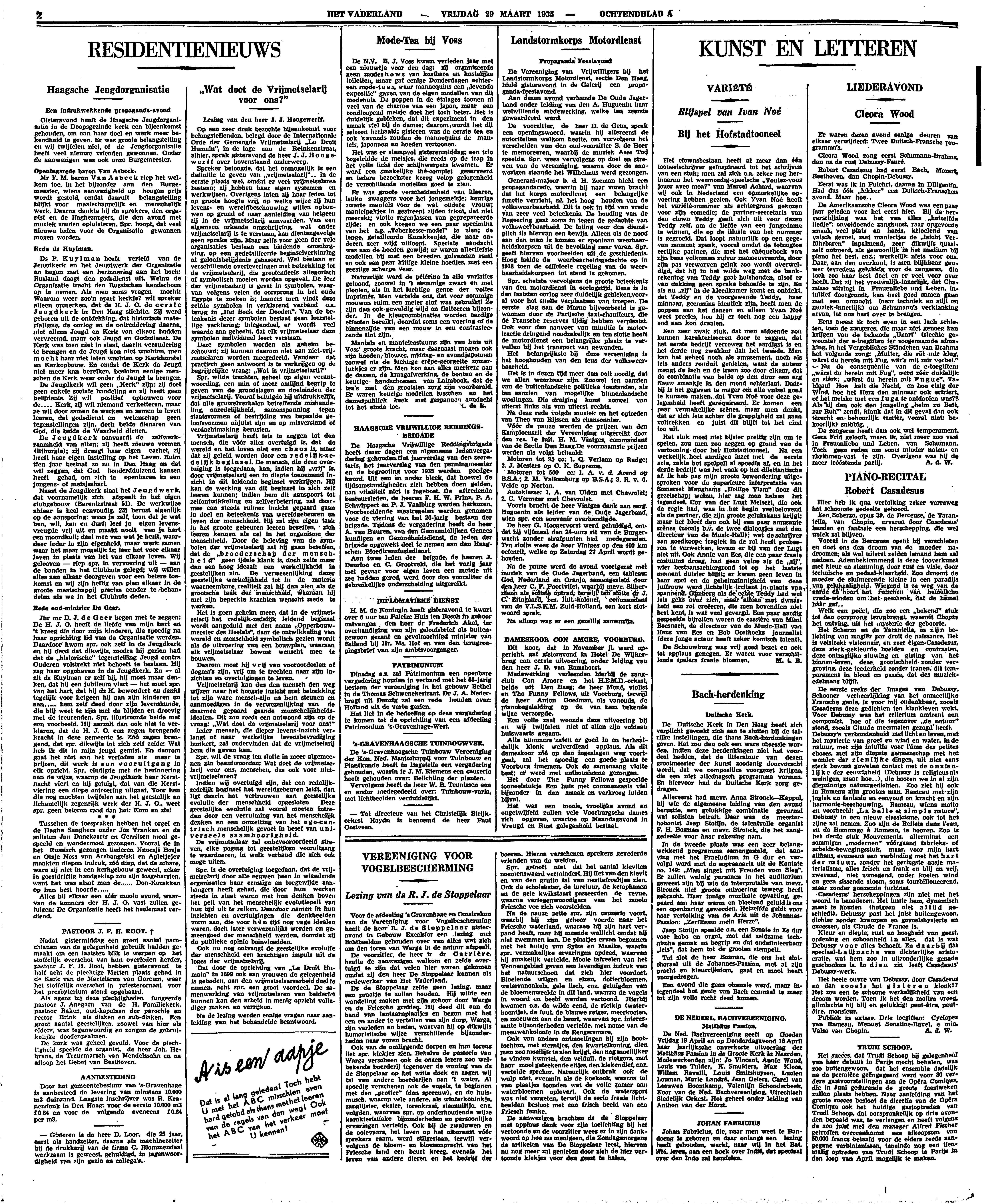 Het stuk moet niet bijster prettig zijn om te spelen, zou men zoo zeggen op grond van de vertooning door het Hofstadtooneel. Na een werkelijk heel aardigen inzet met de eerste acte, zakte het spelpeil al spoedig af, en in het derde bedrijf was het vaak op het dilettantische af. Ik heb pas mijn groote bewondering uitgesproken voor de superieure interpretatie van Somerset Maughams ‘Heilige Vlam’ door dit gezelschap; welnu, hier zag men helaas het tegendeel. Cor van der Lugt Melsert, die ook de regie had, was in het begin veelbelovend als de partner, die zijn groote gelukskans krijgt: maar het bleef dan ook bij een paar amusante scènes (zooals b.v. de twee dialoogjes met den directeur van de Music-Hall); wat de schrijver aan goedkoope tragiek in de rol heeft probeeren te verwerken, kwam er bij van der Lugt niet uit. Ook Annie van Ees, die een paar fraaie costuums droeg, had geen veine als de ‘zij’ wier bestaansachtergrond tot op het laatste moment duister blijft; er kwam geen leven in haar spel en de geheimzinnigheid van deze juffrouw werd lichtelijk irritant in plaats van spannend. Gimberg als de echte Teddy had wel iets geks over zich, maar alleen met dwaasheid een rol creëeren, die men bovendien niet best kent, is wat veel gevergd. Een paar aardig gespeelde bijrollen waren de cassière van Mimi Boesnach, de directeur van de Music-Hall van Hans van Ees en Bob Oosthoeks journalist (deze jonge acteur heeft zeker komisch talent).
