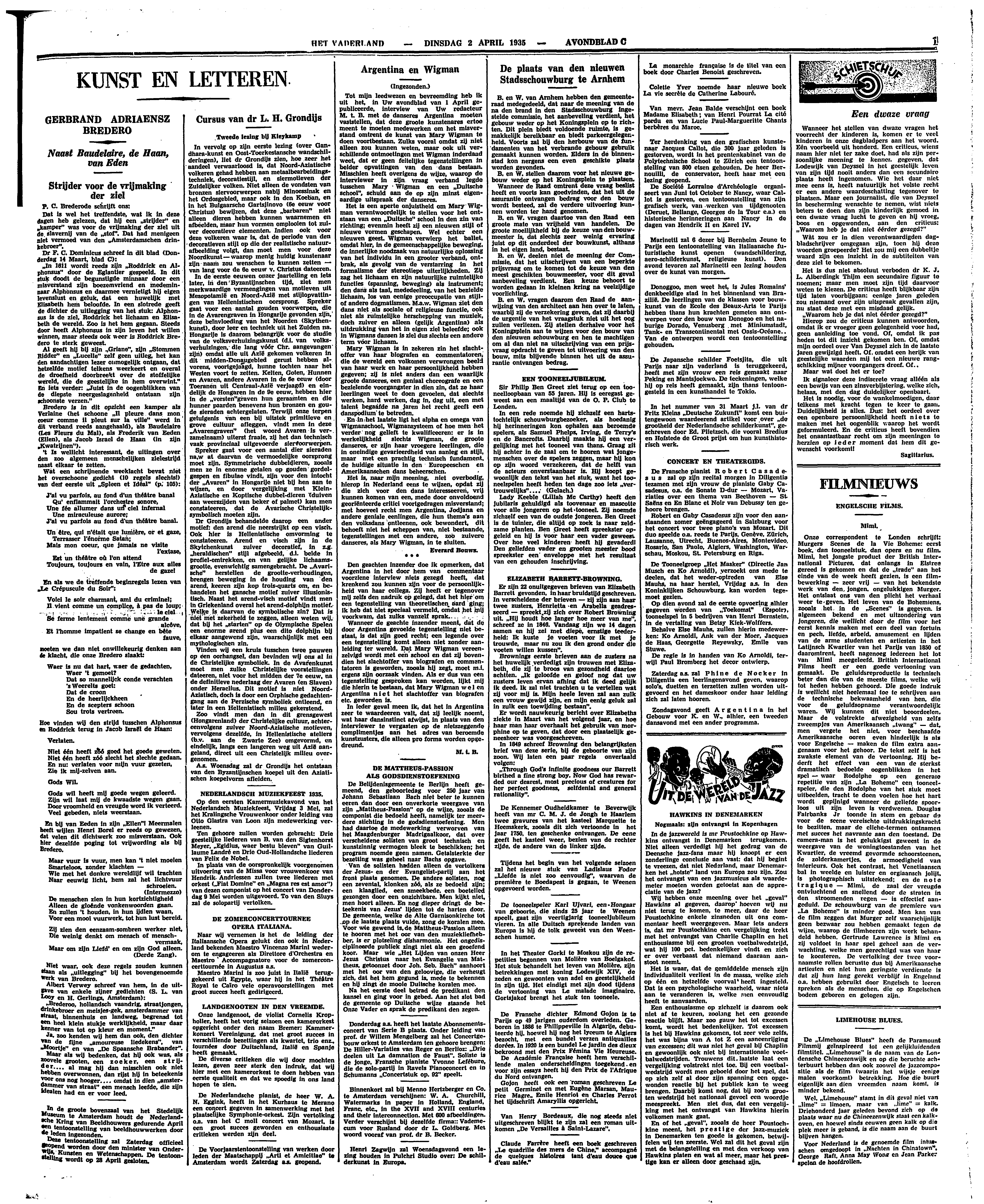 Tot mijn leedwezen en bevreemding heb ik uit het, in Uw avondblad van 1 April gepubliceerde, interview van Uw redacteur M.t.B. met de danseres Argentina moeten vaststellen, dat deze groote kunstenares ertoe meent te moeten medewerken om het misverstand omtrent de kunst van Mary Wigman te doen voortbestaan. Zulks vooral omdat zij niet alleen zou kunnen weten, maar ook uit verschillende ontmoetingen met Wigman inderdaad weet, dat er geen feitelijke tegenstellingen in beider opvattingen van den dans bestaan. Misschien heeft overigens de wijze, waarop de interviewer in zijn vraag verband legde tusschen Mary Wigman en een ‘Duitsche school’, schuld aan de op zijn minst eigenaardige uitspraak der danseres.
