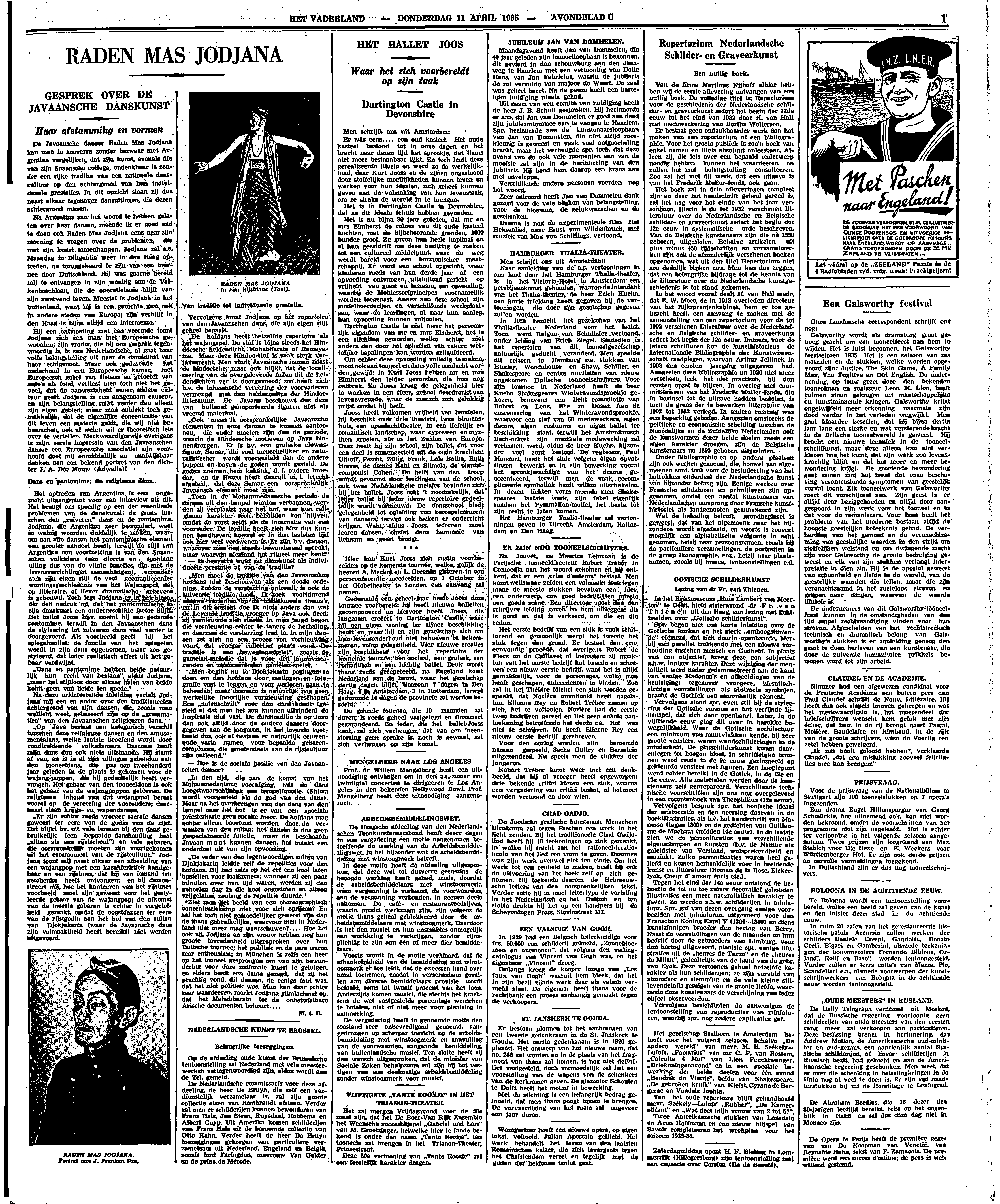 Na Argentina aan het woord te hebben gelaten over haar dansen, meende ik er goed aan te doen ook Raden Mas Jodjana eens naar zijn meening te vragen over de problemen, die met zijn kunst samenhangen. Jodjana zal a.s. Maandag in Diligentia weer in den Haag optreden, na teruggekeerd te zijn van een tournee door Duitschland. Hij was gaarne bereid mij te ontvangen in zijn woning aan de Valkenboschlaan, die de operatiebasis blijft van zijn zwervend leven. Meestal is Jodjana in het buitenland, want hij is een gezochte gast ook in andere steden van Europa; zijn verblijf in den Haag is bijna altijd een intermezzo.