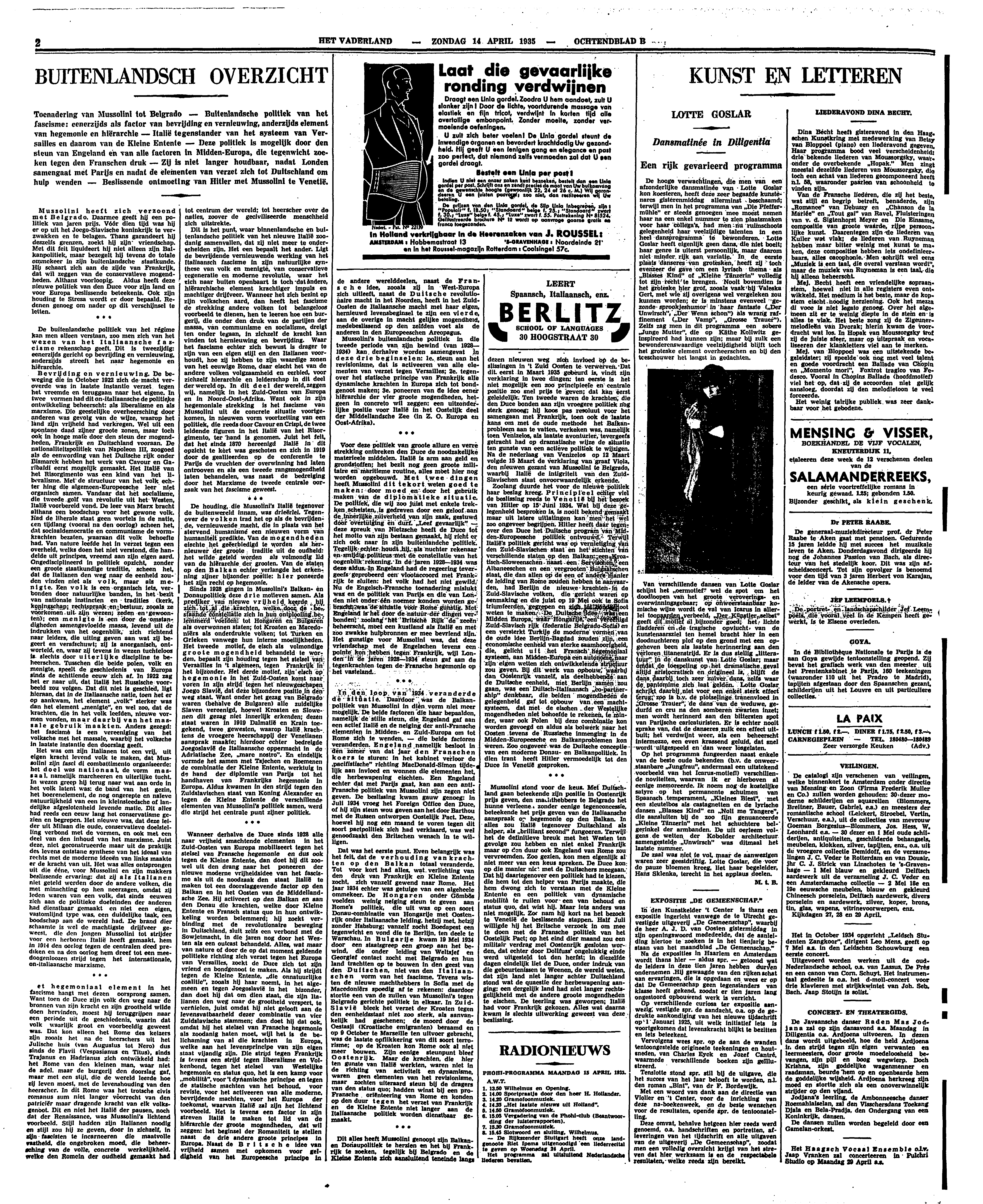 De hooge verwachtingen, die men van een afzonderlijke dansmatinée van Lotte Goslar kon koesteren, heeft deze zeer begaafde kunstenares gisterenmiddag allerminst beschaamd; terwijl men in het programma van ‘Die Pfeffermühle’ er steeds genoegen mee moest nemen haar na een enkel nummer te zien plaatsmaken voor haar collega's, had men nu ruimschoots gelegenheid haar veelzijdige talenten in een heel dansprogramma te bewonderen. Lotte Goslar heeft eigenlijk geen dans, die niet boeit; haar genre is uiterst persoonlijk, maar daarom niet minder rijk aan variatie. In de eerste plaats danseres van grotesken, heeft zij toch evenzeer de gave om een lyrisch thema als ‘Blasses Kind’ of ‘Kleine Tänzerin’ volledig tot zijn recht te brengen. Nooit bovendien is het groteske hier grof, zooals vaak bij Valeska Gert, met wie zij overigens wel vergeleken zou kunnen worden; er is minstens evenveel gezonde sprookjeshumor in haar fantasie (‘Der Unwirsch’, ‘Der Wenn schon’) als wrang raffinement (‘Der Vamp’, ‘Grosse Trauer’). Zelfs zag men in dit programma een sobere ‘Junge Mutter’, die op Käthe Kollwitz geinspireerd had kunnen zijn; maar bij zulk een bewonderenswaardige veelzijdigheid blijft toch het groteske element overheerschen en bij den toeschouwer het langst in gedachten.