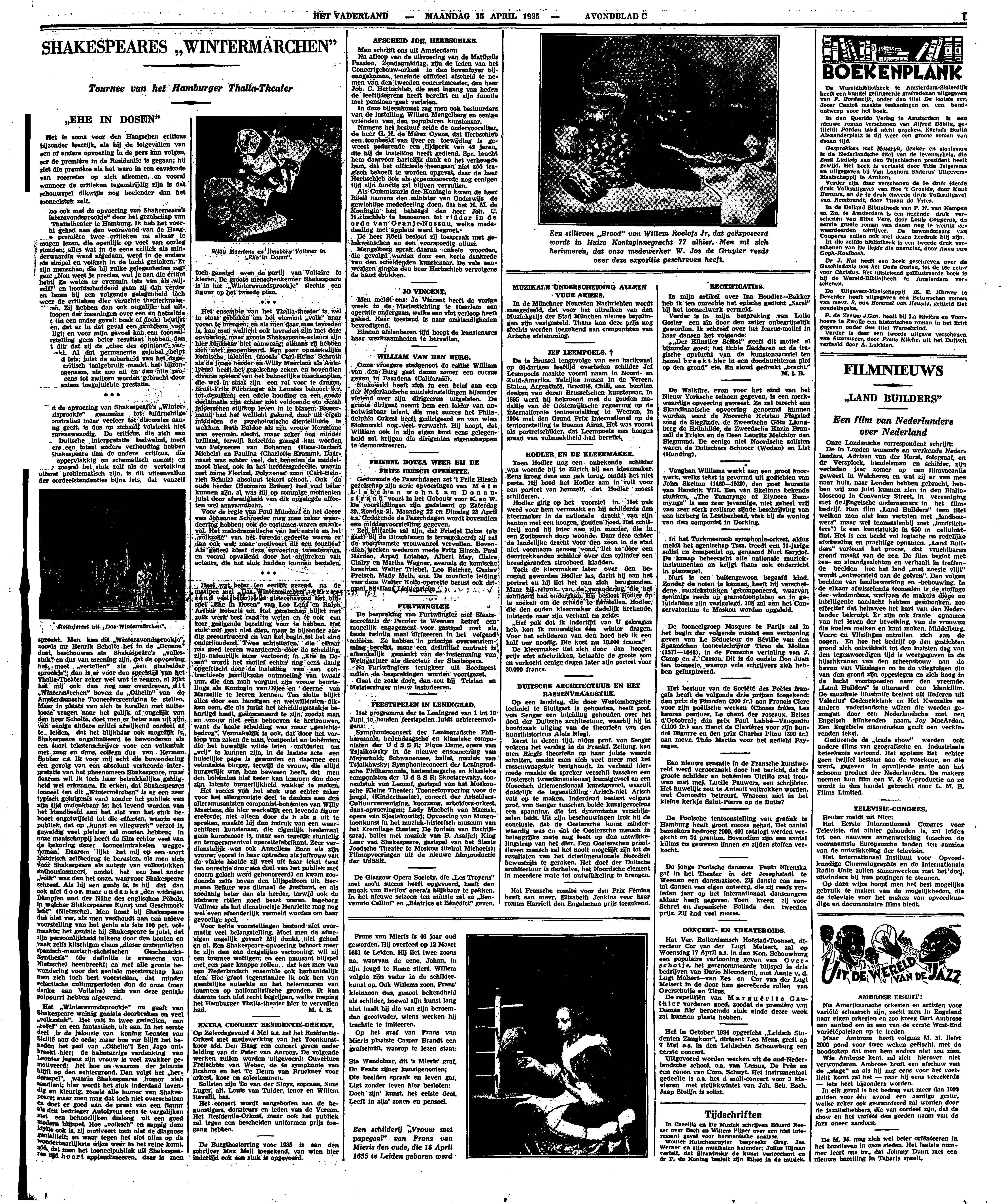 Het ensemble van het Thalia-theater is wel in staat gebleken om het element ‘volk’ naar voren te brengen; en als men daar mee tevreden is, kan men wellicht ook tevreden zijn met deze opvoering, maar groote Shakespeare-acteurs zijn hier blijkbaar niet aanwezig; althans zij hebben zich niet geopenbaard. Een paar opmerkelijke komische talenten (zooals Carl-Heinz Schroth als de jonge herder en Willy Maertens als Autolycus) heeft het gezelschap zeker, en bovendien diverse spelers van het behoorlijke tusschenplan, die wel in staat zijn een rol voor te dragen. Ernst-Fritz Fürbringer als Leontes behoort b.v. tot dezulken; een edele houding en een goede declamatie zijn echter niet voldoende om dezen jaloerschen stijfkop leven in te blazen; Bassermann had het wellicht gekund, door uit eigen middelen de psychologische diepteillusie te wekken. Ruth Baldor als zijn vrouw Hermione was evenmin slecht, maar zeker nog minder brillant, terwijl hetzelfde gezegd kan worden van Polyxenes van Bohemen (Hans-Herbert Michels) en Paulina (Charlotte Kramm). Daarnaast was echter veel, dat beneden de middelmoot bleef, ook in het herdersgedeelte, waarin met name Florizel, Polyxenes' zoon (Carl-Heinrich Schulz) absoluut tekort schoot. Ook de oude herder (Hermann Bräuer) had veel beter kunnen zijn, al was hij op sommige momenten juist door afwezigheid van dik opgelegde effecten wel aanvaardbaar.