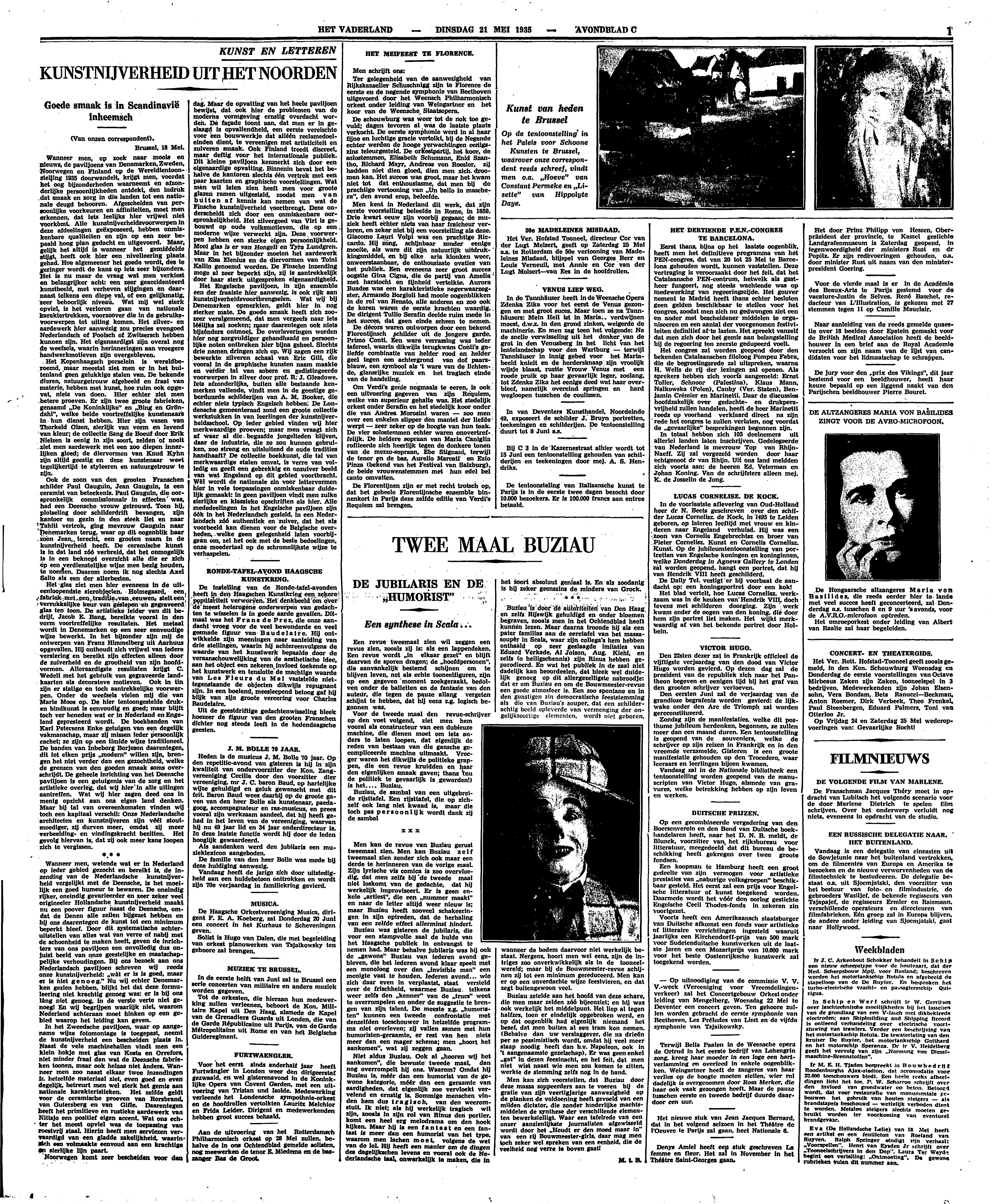 Buziau was gisteren de jubilaris, die voor een stampvolle zaal de hulde van het Haagsche publiek in ontvangst te nemen had. Maar behalve jubilaris was hij ook de ‘gewone’ Buziau van iederen avond gebleven, die het iederen avond klaar speelt met een monoloog over den ‘invisible man’ een menigte vast te houden. Iederen avond... wie zich daar even in verplaatst, staat versteld over de frischheid, waarmee Buziau, telkens weer zelfs den ‘kenner’ van de ‘trucs’ weet te overrompelen en onder de suggestie te brengen van zijn talent. De meeste z.g. ‘humoristen’ kunnen een tweede confrontatie met denzelfden toeschouwer in hetzelfde programma niet overleven; zij vallen samen met hun humoristen-geraamte, er rest van hen niets meer dan een mager schema; men ‘hoort het aankomen’, wat zij zeggen gaan.