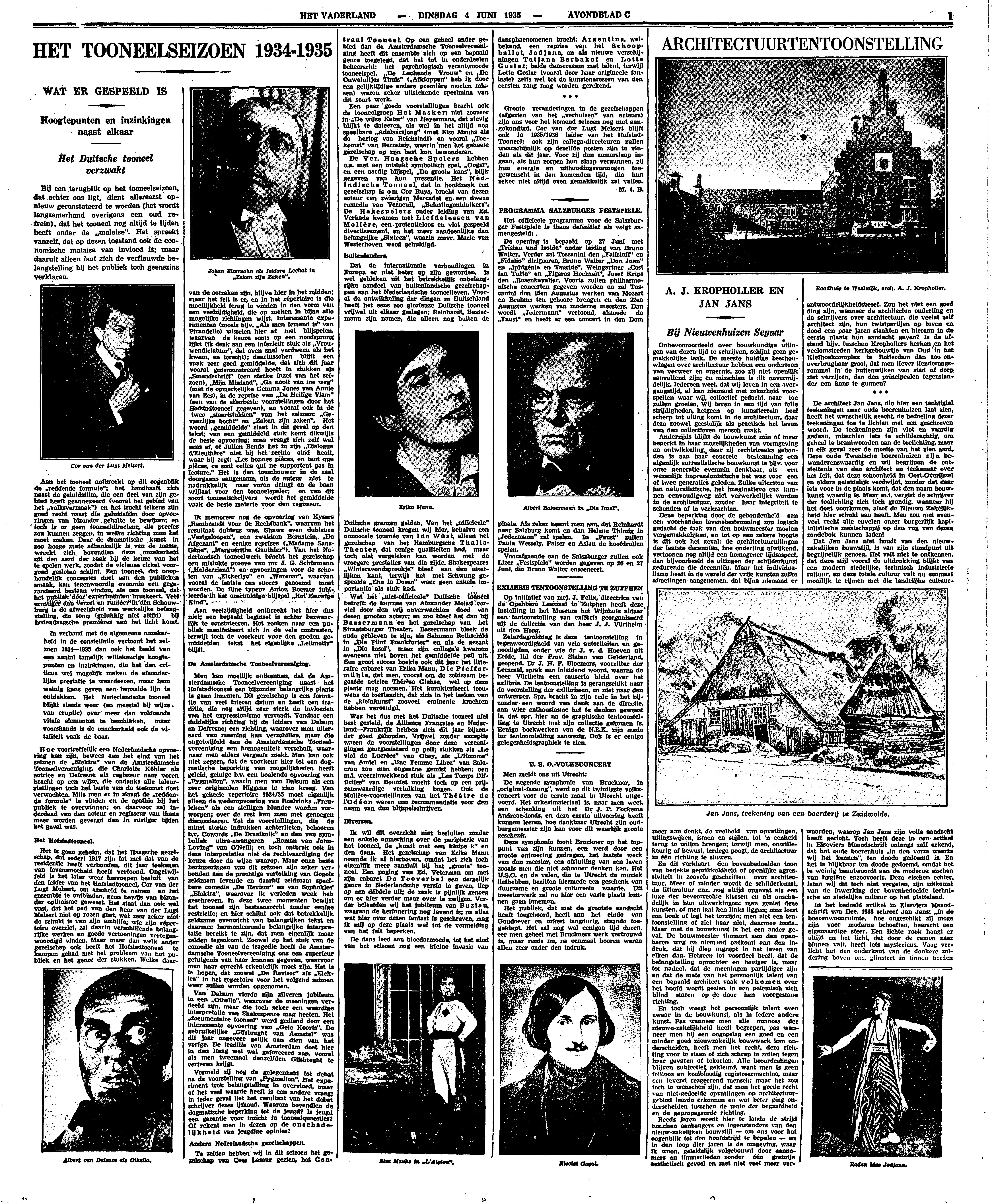 In verband met de algemeene onzekerheid in de constellatie vertoont het seizoen 1934-1935 dan ook het beeld van een aantal tamelijk willekeurige hoogtepunten en inzinkingen, die het den criticus wel mogelijk maken de afzonderlijke prestatie te waardeeren, maar hem weinig kans geven een bepaalde lijn te ontdekken. Het Nederlandsche tooneel blijkt steeds weer (en meestal bij wijze van eruptie) over meer dan voldoende vitale elementen te beschikken, maar voorshands is de onzekerheid ook de vitaliteit vaak de baas.
