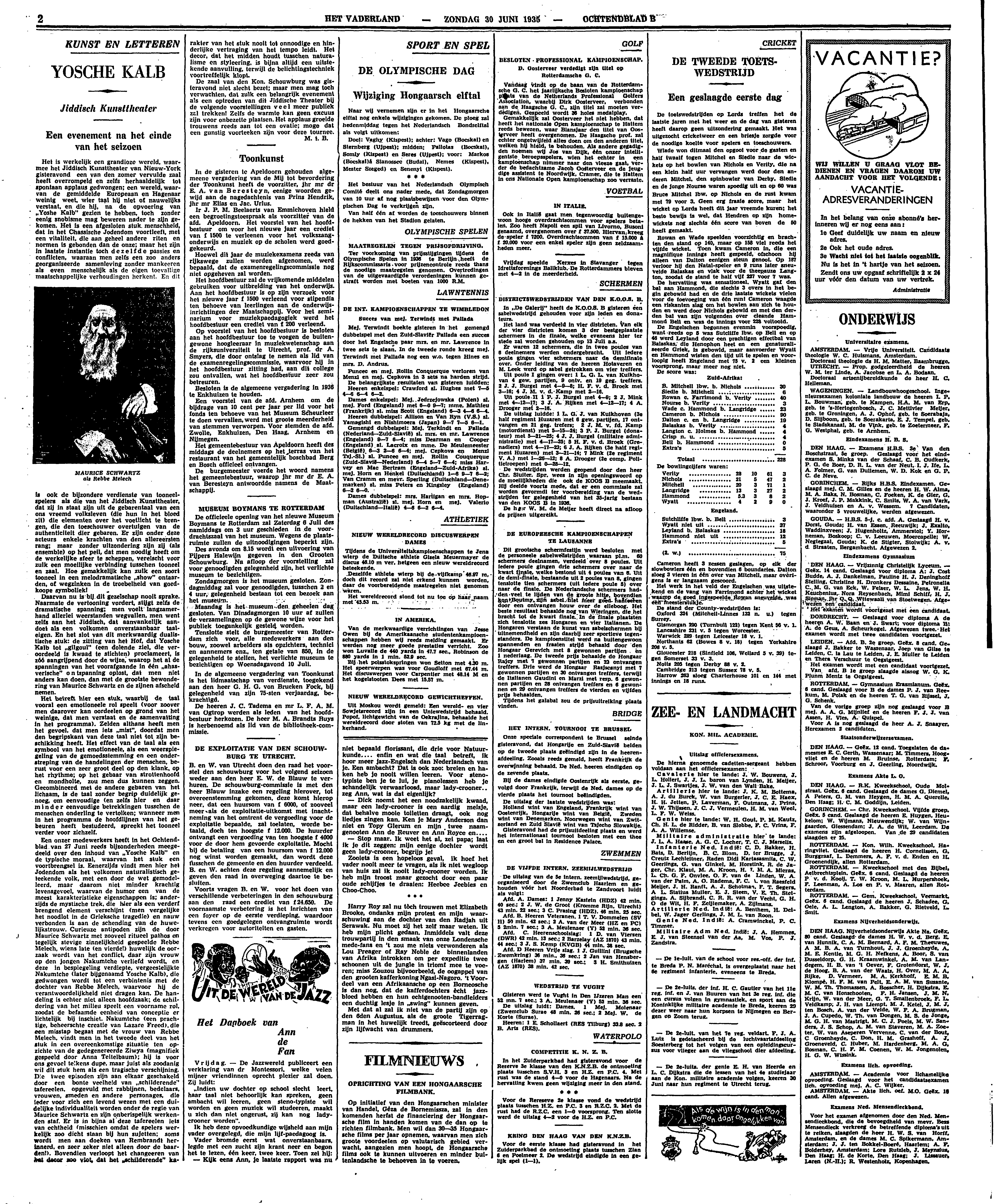 Het is werkelijk een grandioze wereld, waarmee het Jiddisch Kunsttheater van Nieuw-York gisteravond een van den zomer vervulde zaal heeft overrompeld en zelfs herhaaldelijk tot spontaan applaus gedwongen; een wereld, waarvan de gemiddelde Europeaan en Hagenaar weinig weet, wier taal hij niet of nauwelijks verstaat, en die hij, na de opvoering van ‘Yoshe Kalb’ gezien te hebben, toch zonder eenig snobisme mag beweren nader te zijn gekomen. Het is een afgesloten stuk menschheid, dat in het Chassische Jodendom voortleeft, met een vitaliteit, die aan geheel andere riten en normen is gebonden dan de onze; maar het zijn in laatste instantie toch dezelfde passies en conflicten, waaraan men zelfs een zoo anders georganiseerde samenleving zonder mankeeren als even menschelijk als de eigen toevallige maatschappelijke verhoudingen herkent. En dit is ook de bijzondere verdienste van tooneelspelers als die van het Jiddisch Kunsttheater, dat zij in staat zijn uit de gebarentaal van een ons vreemd volksleven (die hun in het bloed zit) die elementen over het voetlicht te brengen, die den toeschouwer overtuigen van de authenticiteit dier gebaren. Er zijn onder deze acteurs enkele krachten van den allereersten rang; maar zonder uitzondering zijn zij (als ensemble) op het peil, dat men noodig heeft om de werkelijke sfeer te scheppen, vereischt voor zulk een moeilijke verbinding tusschen tooneel en zaal. Hoe gemakkelijk kan zulk een soort tooneel in een melodramatische ‘show’ ontaarden, of wegzinken in de troebelheid van goedkoope symboliek!