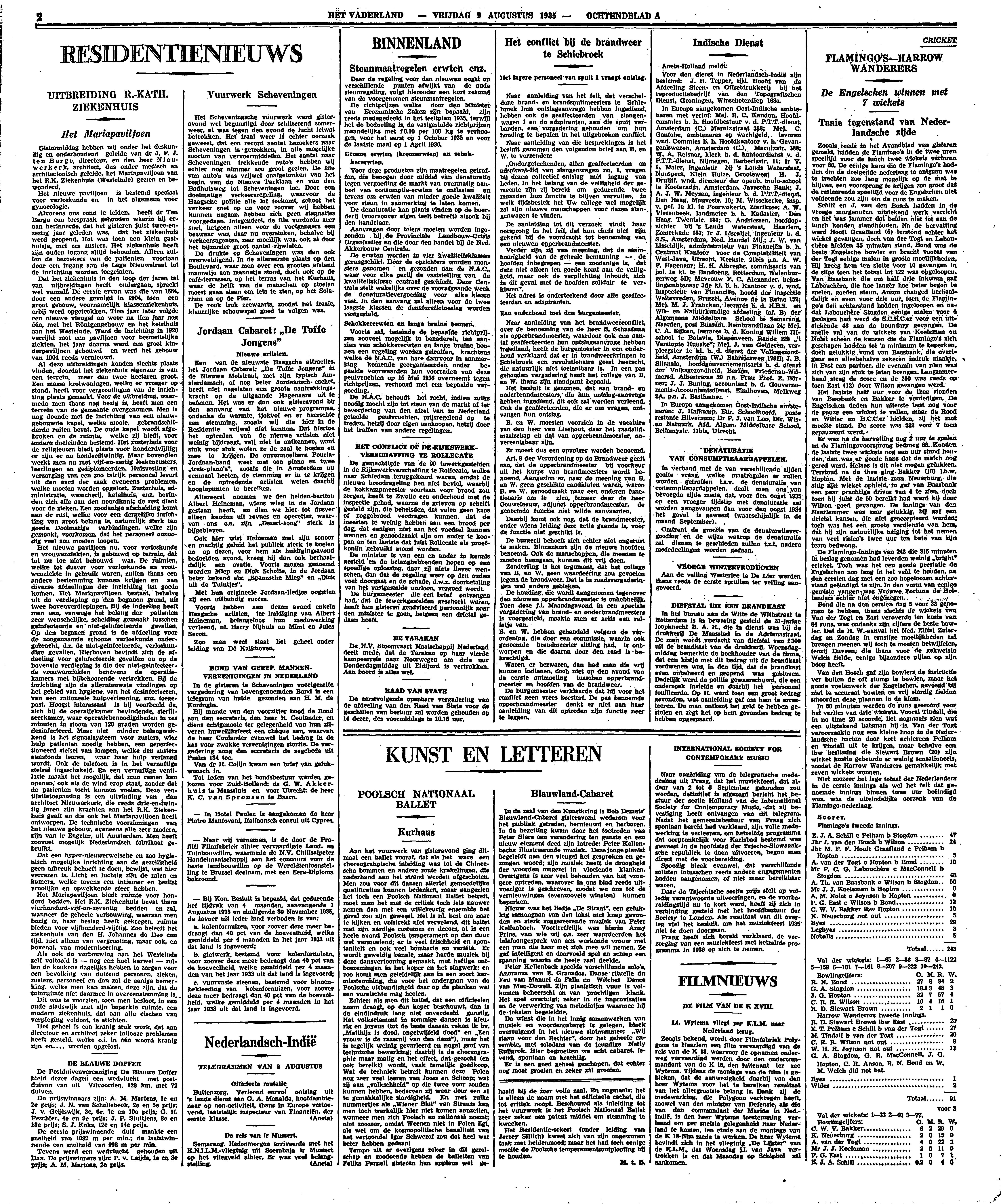 Aan het vuurwerk van gisteravond ging ditmaal een ballet vooraf, dat als het ware een choreographische inleiding was tot de Chineesche bommen en andere zoute krakelingen, die naderhand aan het strand werden afgeschoten. Men zou voor dit dansen allerlei gemoedelijke qualificaties kunnen bedenken, maar aangezien het toch een Poolsch Nationaal Ballet betreft, moet men het met de critiek toch iets nauwer nemen dan met een willekeurig ensemble het geval zou zijn geweest. Het is nl. best om naar te kijken en volstrekt niet vervelend, dit ballet met zijn aardige costumes en decors, al is een heele avond Poolsch temperament op den duur wel vermoeiend; er is veel frischheid en spontaniteit en ook veel bombarie en variété. Er wordt geweldig banale, maar harde muziek bij deze dansvertooning gemaakt, met heftige ontboezemingen in het koper en het slagwerk; en zoo komt men geleidelijk aan in een soort kermisstemming, die voor het ondergaan van de Poolsche uitbundigheid daar op de planken wel een vereischte mag heeten.