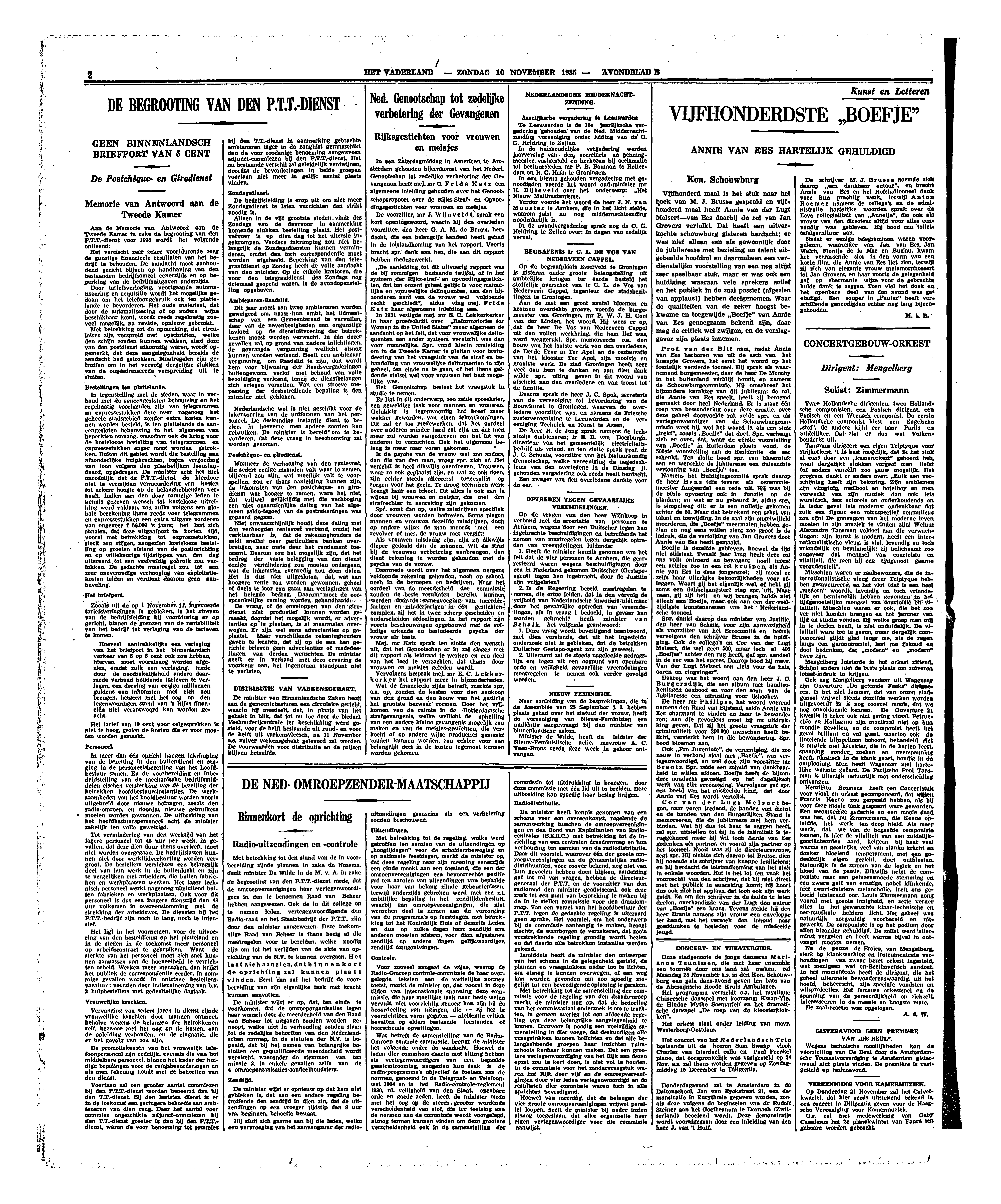 Spr. dankt daarop den minister van Justitie, den heer van Schank, voor zijn aanwezigheid als voorzitter van het Eerecomité en betrok vervolgens den schrijver Brusse in de huldiging. Ook de collega's en Cor van der Lugt Melsert, die wel geen 500, maar toch al 400 ‘Boefjes’ achter den rug heeft, gaf spr. aandeel in de eer van het succes. Daarop bood hij mevr. Van der Lugt Melsert aan ‘iets voor de hals, ooren en ringvinger’.
