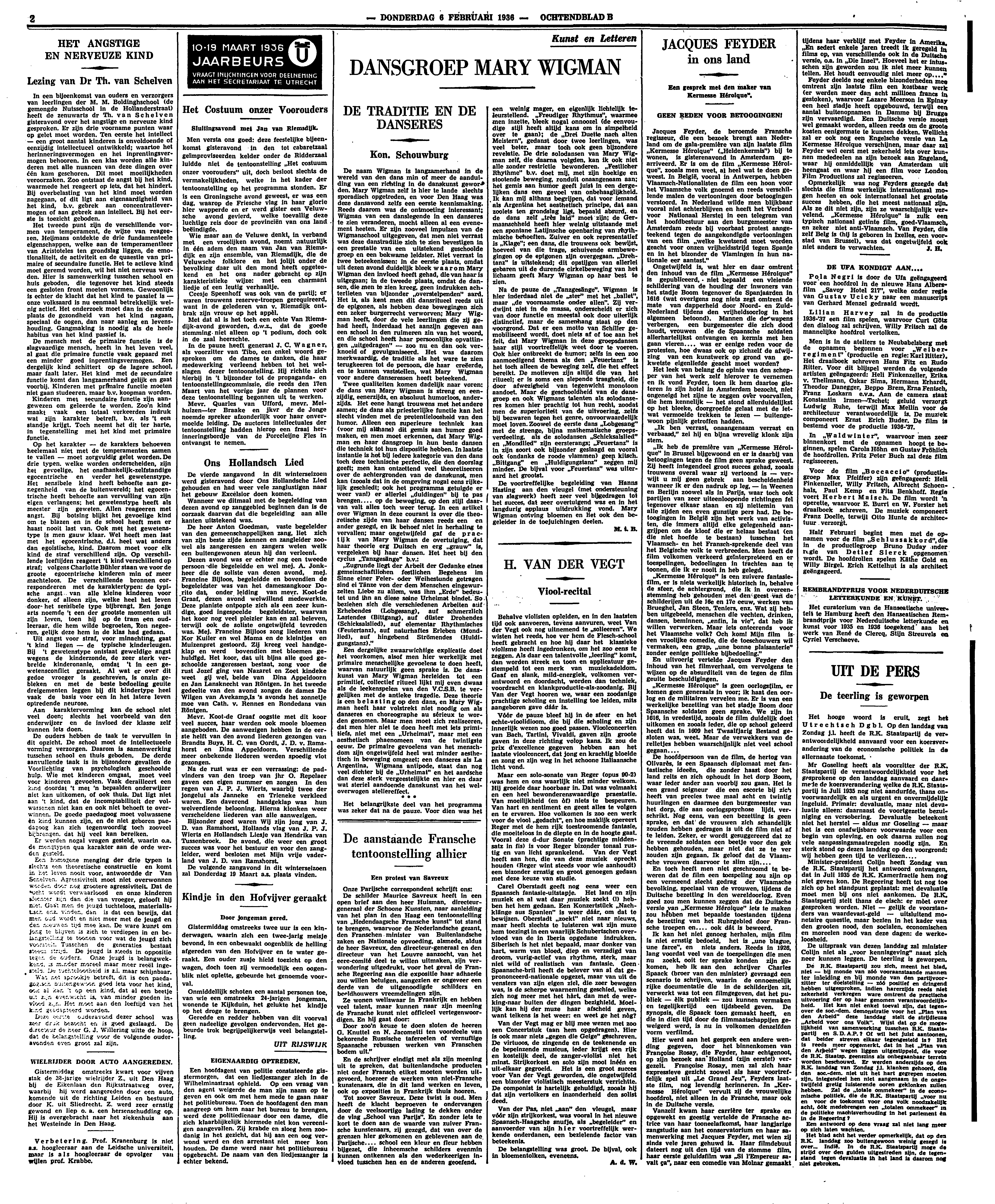 De naam Wigman is langzamerhand in de wereld van den dans min of meer de aanduiding van een richting in de danskunst geworden. Mary Wigman zelf is hier te lande slechts sporadisch opgetreden, en voor Den Haag was deze dansavond zelfs een eerste kennismaking. Reeds daarom was de ontmoeting interessant; Wigman van een danslegende in een danseres te zien veranderen, mocht alleen al een evenement heeten. Er zijn zooveel impulzen van de Wigmanschool uitgegeven, dat men niet verrast was deze danstraditie zich te zien bevestigen in een prestatie van een uitstekend geschoolde groep en een bekwame leidster. Niet verrast in twee beteekenissen: in de eerste plaats, omdat uit dezen avond duidelijk bleek waarom Mary Wigman den invloed heeft gehad, die van haar is uitgegaan; in de tweede plaats, omdat de dansen, die men te zien kreeg, geen indrukken achterlieten van bijzonder ‘overstelpenden’ aard. Het is, als kent men dit dansritueel reeds uit de epigonen, als hebben deze bewegingen zich een zeker burgerrecht verworven; Mary Wigman heeft, door de vele leerlingen die zij gehad heeft, inderdaad het aanzijn gegeven aan een school in den ruimeren zin van het woord, en die school heeft haar persoonlijke opvattingen ‘uitgedragen’ - zoo nu en dan ook verknoeid of gevulganiseerd. Het was daarom merkwaardig, de traditie als het ware te zien terugkeeren tot de persoon, die haar creëerde, en te kunnen vaststellen, wat Mary Wigman voor andere danseressen heeft beteekend.