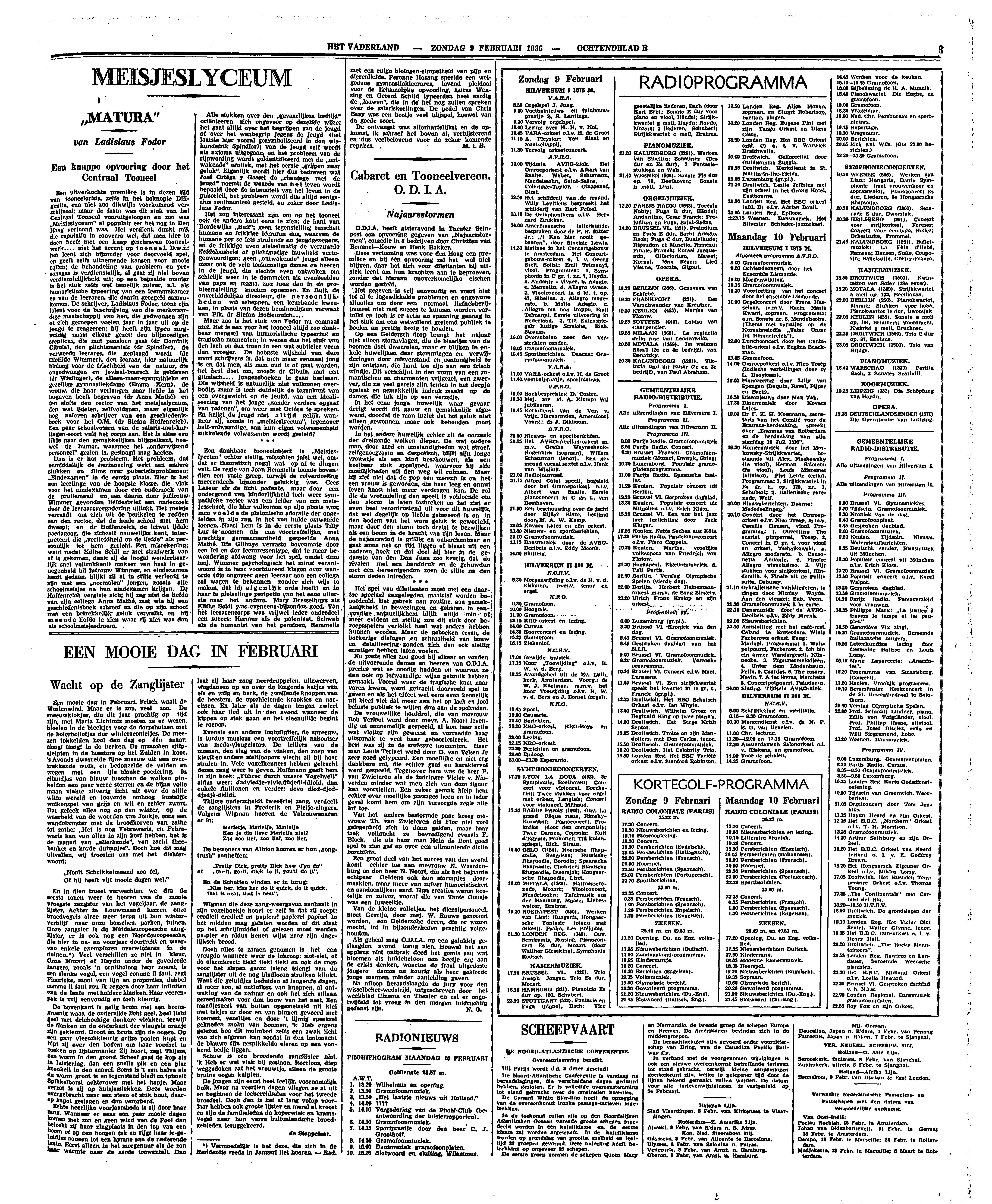 Een uitverkochte première is in dezen tijd van tooneelcrisis, zelfs in het beknopte Diligentia, een niet zoo dikwijls voorkomend verschijnsel; maar de faam was dit stuk van het Centraal Tooneel vooruitgeloopen en zoo was ‘Meisjeslyceum’ al populair eer het nog in Den Haag vertoond was. Het verdient, dunkt mij, die reputatie in zooverre wel, dat men hier te doen heeft met een knap geschreven tooneelwerk.... met het accent op tooneel. D.w.z: het leent zich bijzonder voor doorvoeld spel, en geeft zelfs uitnemende kansen voor mooie rollen; de behandeling van probleem en personages is verdienstelijk, al gaat zij niet boven verdienstelijkheid uit; op een bepaalde manier is het stuk zelfs wel tamelijk zuiver, n.l. als humoristische typeering van een leeraarskamer en van de leeraren, die daarin geregeld samenkomen. De schrijver, Ladislaus Fodor, toont zijn talent voor de beschrijving van die merkwaardige maatschappij van hen, die gedwongen zijn of zich geroepen voelen jaar in jaar uit op de jeugd te reageeren; hij heeft zijn typen zorgvuldig naast elkaar gezet: den blijmoedigen scepticus, die met pensioen gaat (dr Dominik Cibula), den plichtsmaniak (dr Spindler), de verwoede leerares, die geplaagd wordt (dr Clotilde Wimmer), den leeraar, hier natuurlijk bioloog voor de frischheid van de natuur, die ongedwongen en joviaal-boersch is gebleven (dr Wiefinger), de alleen-maar-sympathieke en gezellige gymnastiekdame (Emma Kern), de vrouw, die haar verlangen naar liefde in het lesgeven heeft begraven (dr Anna Mathé) en ten slotte den rector van het meisjeslyceum, den wat ijdelen, zelfvoldanen, maar eigenlijk nog naïeven schrijver van een geschiedenisboek voor het O.M. (dr Stefan Hoffenreich). Een paar schoolvossen van de salaris-met-kortingen-soort vult het corps aan. Het is alles een tikje naar den gemakkelijken blijspelkant, hoewel de humor, waarmee het ‘onderwijzend personeel’ gezien is, geslaagd mag heeten.