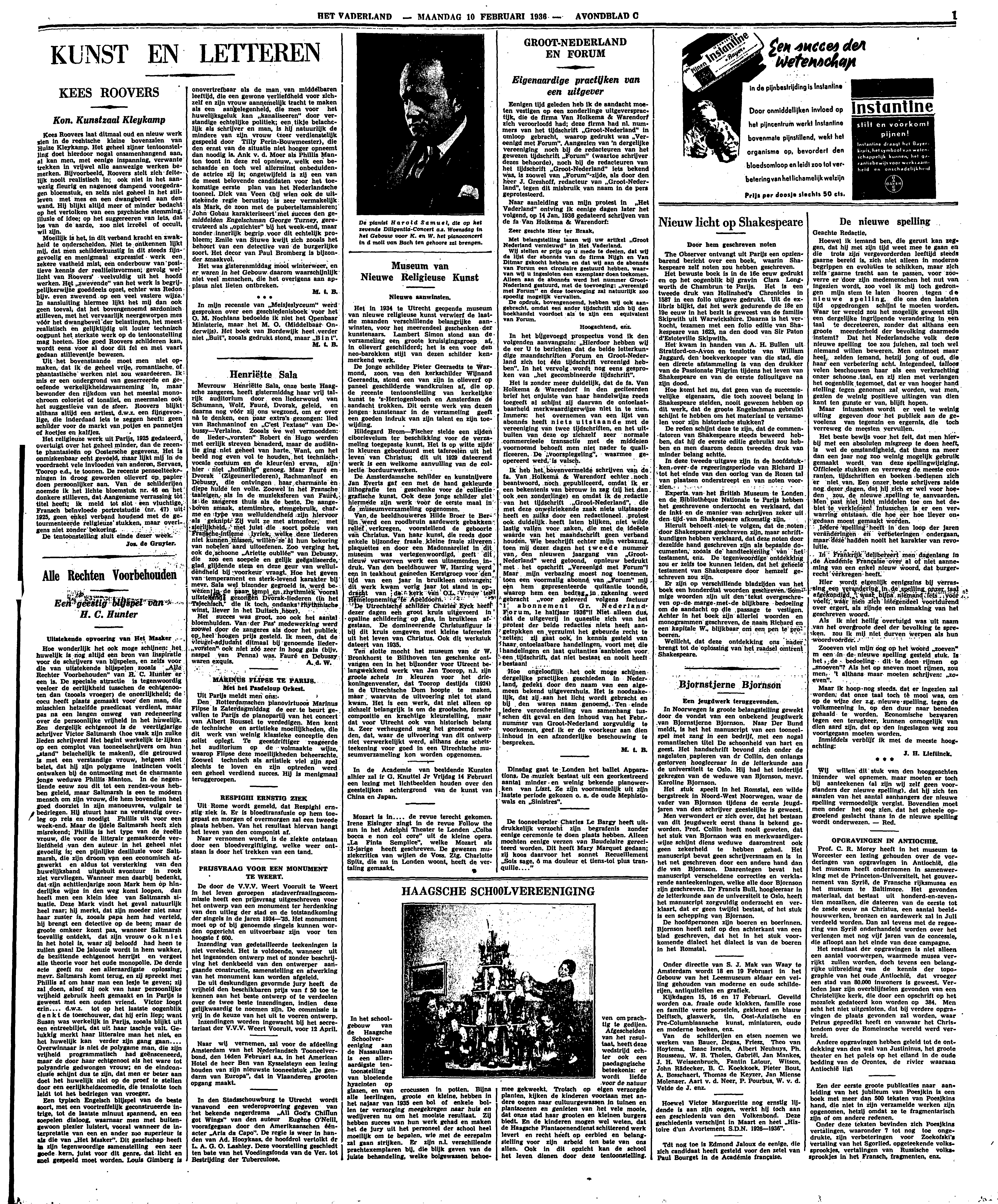 Een typisch Engelsch blijspel van de beste soort, met een voortreffelijk geconstrueerde intrige, tot de laatste minuut spannend, en een soepelen dialoog, waarnaar men met buitengewoon plezier luistert, vooral wanneer de interpretatie van een en ander zoo superieur is als die van ‘Het Masker’. Dit gezelschap heeft in zijn tegenwoordige samenstelling een zeer goede kern, juist voor dit genre, dat licht en snel gespeeld moet worden. Louis Gimberg is onovertrefbaar als de man van middelbaren leeftijd, die een gewone verliefdheid voor zichzelf en zijn vrouw aannemelijk tracht te maken als een aangelegenheid, die men voor het huwelijksgeluk kan ‘kanaliseeren’ door verstandige echtelijke politiek; een tikje belachelijk als schrijver en man, is hij natuurlijk de mindere van zijn vrouw (zeer verdienstelijk gespeeld door Tilly Perin-Bouwmeester), die den ernst van de situatie niet hooger opneemt dan noodig is. Ank v.d. Moer als Phillis Manton toont in deze rol opnieuw, welk een beschaafde en toch wel allerminst onbeduidende actrice zij is; ongetwijfeld is zij een van de meest belovende candidaten voor het toekomstige eerste plan van het Nederlandsche tooneel. Dick van Veen (bij wien ook de uitstekende regie berustte) is zeer vermakelijk als Mark, de zoon met de puberteitsmanieren; John Gobau karakteriseert met succes den gemiddelden Engelschman George Turney, gerecruteerd als ‘opzichter’ bij het week-end, maar zonder innerlijk begrip voor dit echtelijk probleem; Emile van Stuwe kwijt zich zooals het behoort van een detective van de burgerlijke soort. Het decor van Paul Bromberg is bijzonder smaakvol.