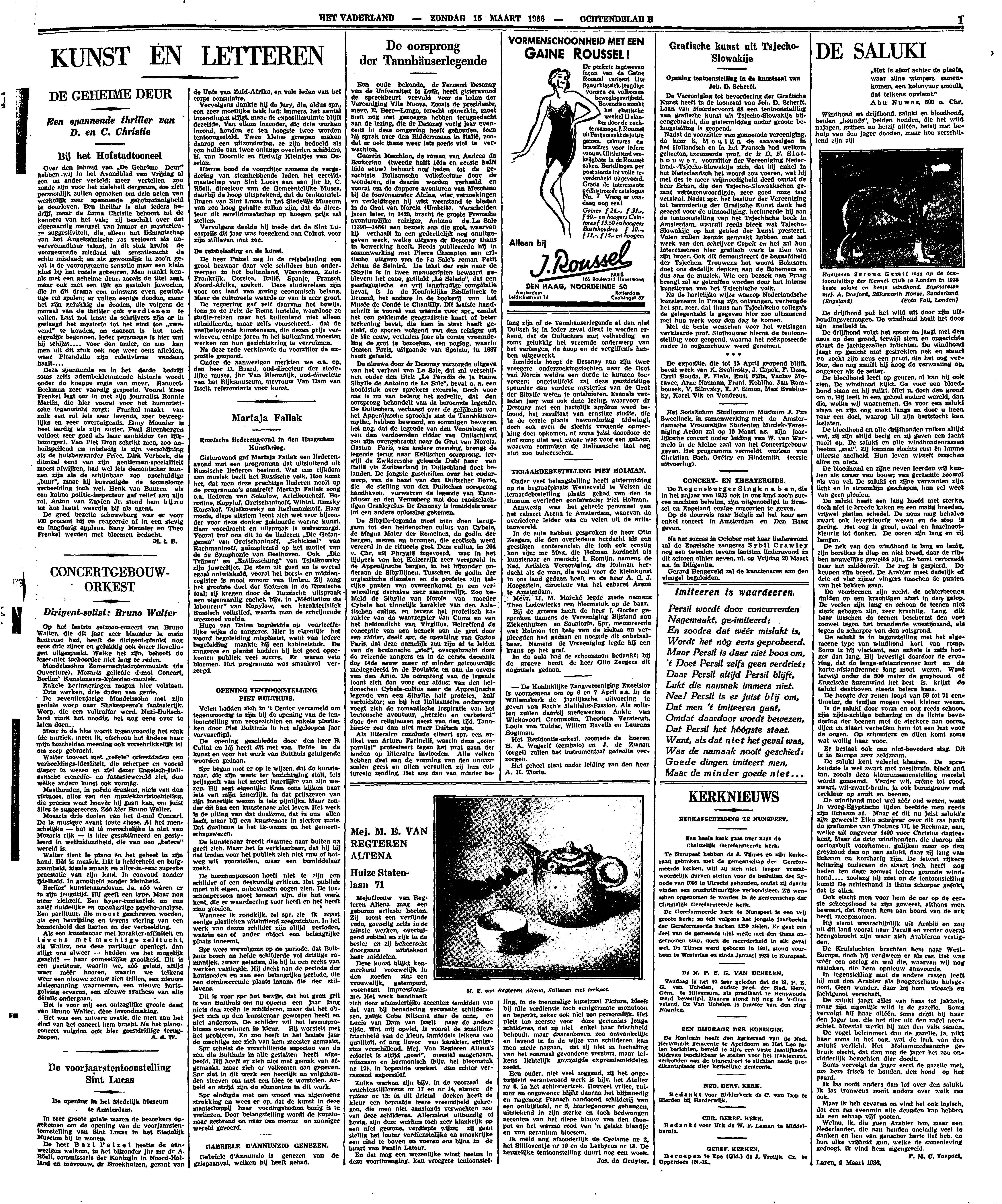 Over den inhoud van ‘De Geheime Deur’ hebben wij in het Avondblad van Vrijdag al een en ander verteld; meer vertellen zou zonde zijn voor het zieleheil dergenen, die zich persoonlijk zullen opmaken om drie acten van werkelijk zeer spannende geheimzinnigheid te doorleven. Een thriller is niet ieders bedrijf, maar de firma Christie behoort tot de kenners van het vak; zij beschikt over dat eigenaardig mengsel van humor en mysterieuze suggestiviteit, die alleen het lidmaatschap van het Angelsaksische ras verleent als onvervreemdbaar talent. In dit stuk kruist de voorgewende misdaad uit sensatiezucht de echte misdaad; en als gewoonlijk in zoo'n geval is de vooropgezette sensatie maar een klein kind bij het reëele gebeuren. Men maakt kennis met een geheime deur, zooals de titel zegt, maar ook met een lijk en gestolen juweelen, die in dit drama een minstens even gewichtige rol spelen; er vallen eenige dooden, maar het zijn gelukkig de dooden, die volgens de moraal van de thriller ook verdienen te vallen. Last not least: de schrijvers zijn er in geslaagd het mysterie tot het eind toe ‘zwevend’ te houden, en daarom is het toch eigenlijk begonnen. Ieder personage is hier wat hij schijnt.... voor den ander, en zoo kan men uit dit stuk ook nog weer eens afleiden, waar Pirandello zijn relativisme vandaan haalt....