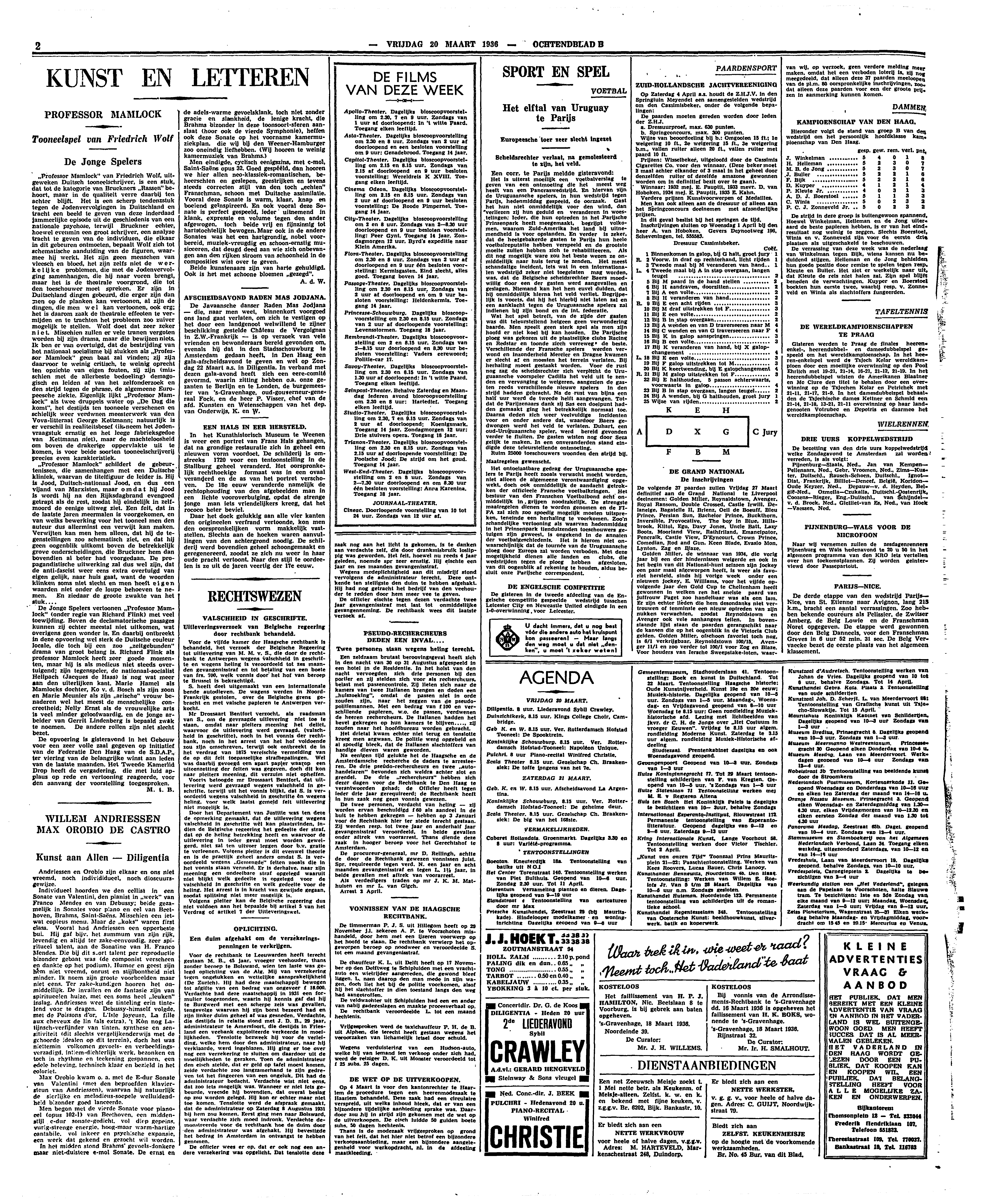 ‘Professor Mamlock’ van Friedrich Wolf, uitgeweken Duitsch tooneelschrijver, is een stuk, dat tot de kategorie van Bruckners ‘Rassen’ behoort, maar in de qualiteit verre daarbij ten achter blijft. Het is een scherp tendenzstuk tegen de Jodenvervolgingen in Duitschland en tracht een beeld te geven van deze inderdaad jammerlijke episode uit de geschiedenis van een nationale psychose, terwijl Bruckner echter, hoewel evenmin een groot schrijver, een analyse tracht te geven van de individuen, die elkaar in dit gebeuren ontmoeten, bepaalt Wolf zich tot schematische aanduiding van de figuren, waarmee hij werkt. Het zijn geen menschen van vleesch en bloed, het zijn zelfs niet de werkelijke problemen, die met de Jodenvervolging samenhangen, die hij naar voren brengt, maar het is de theatrale voorgrond, die tot den toeschouwer moet spreken. Er zijn in Duitschland dingen gebeurd, die erger zijn dan men op de planken kan vertoonen, al zijn de dingen, die men wel kan vertoonen, ook erg; het is daarom zaak de theatrale effecten te vermijden en te trachten het probleem zoo zuiver mogelijk te stellen. Wolf doet dat zeer zeker niet. Misschien zullen er vele tranen vergoten worden bij zijn drama, maar die bewijzen niets. Ik ben er van overtuigd, dat de bestrijding van het nationaal socialisme bij stukken als ‘Professor Mamlock’ geen baat zal vinden; zij zijn daarvoor te weinig critisch, te weinig oprecht ten opzichte van eigen fouten, zij zijn (misschien met de allerbeste bedoeling) demagogisch en leiden af van het zelfonderzoek en den strijd tegen de phrase, de algemeene Europeesche ziekte. Eigenlijk lijkt ‘Professor Mamlock’ als twee druppels water op ‘De Dag die komt’, het destijds ten tooneele verschenen en schielijk weer verdwenen meesterwerk van den Vova-litteraat George Kettmann; natuurlijk is er verschil in realiteitsbesef (ik neem het Jodenvraagstuk ernstig en het leege fabrieksgedoe van Kettmann niet), maar de machteloosheid om boven de drakerige oppervlakte uit te komen, is voor beide soorten tooneelschrijverij precies even karakteristiek.