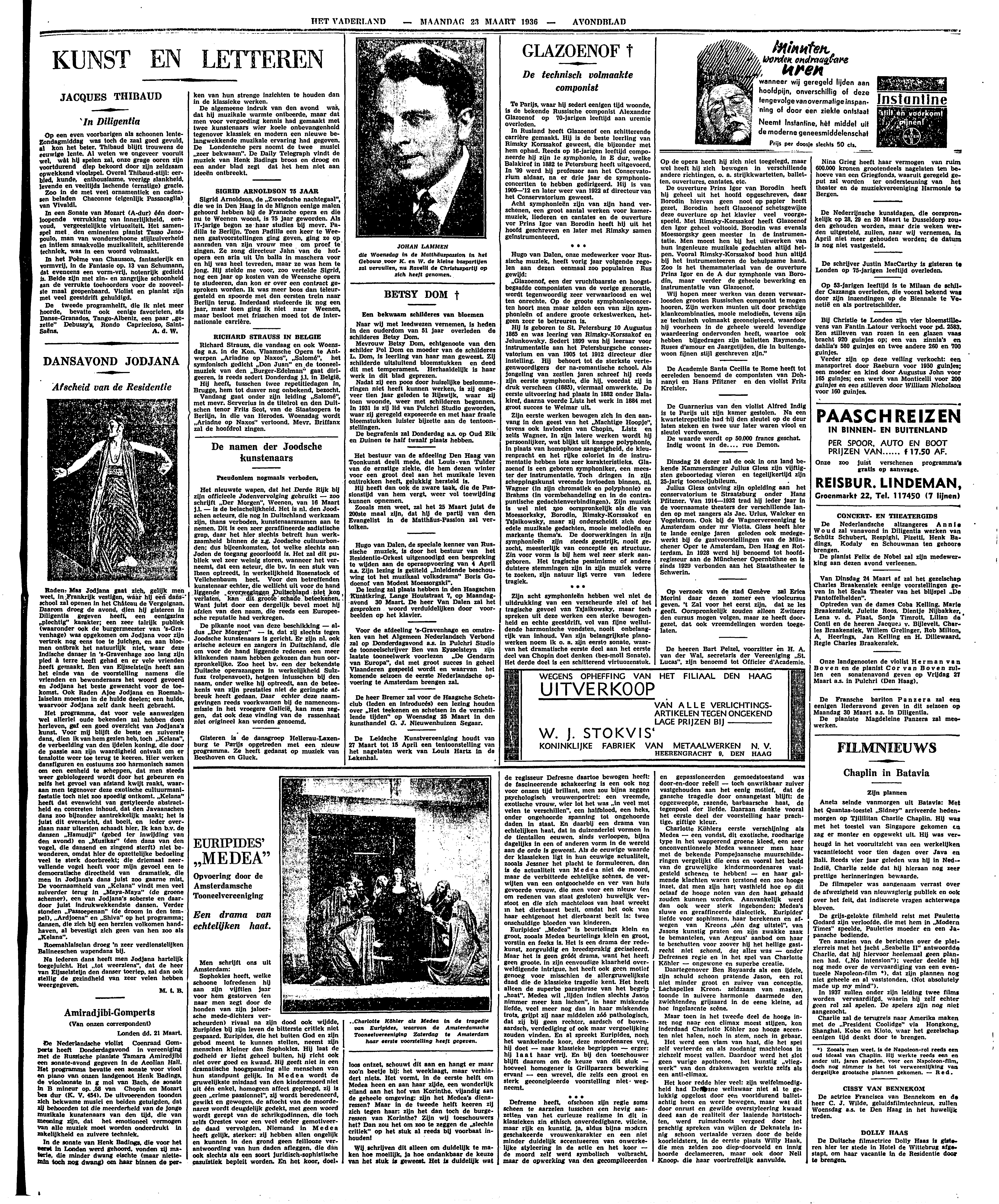 Raden Mas Jodjana gaat zich, gelijk men weet, in Frankrijk vestigen, waar hij een dansschool zal openen in het Château de Vergoignan. Daarom droeg de avond, dien hij gisteren in Diligentia gegeven heeft, een eenigszins ‘plechtig’ karakter; een zeer talrijk publiek (waaronder ook de burgermeester van 's-Gravenhage) was opgekomen om Jodjana voor zijn vertrek nog eens toe te juichen, en aan bloemen ontbrak het natuurlijk niet, waar deze Indische danser in 's-Gravenhage zoo lang zijn pied à terre heeft gehad en er vele vrienden heeft gemaakt. Ben van Eijsselsteijn heeft aan het einde van de voorstelling namens die vrienden en bewonderaars het woord gevoerd en Jodjana het beste gewenscht voor de toekomst. Ook Raden Ajoe Jodjana en Roemahlaiselan moesten in de hulde deelen; een hulde, waarvoor Jodjana zelf dank heeft gebracht.