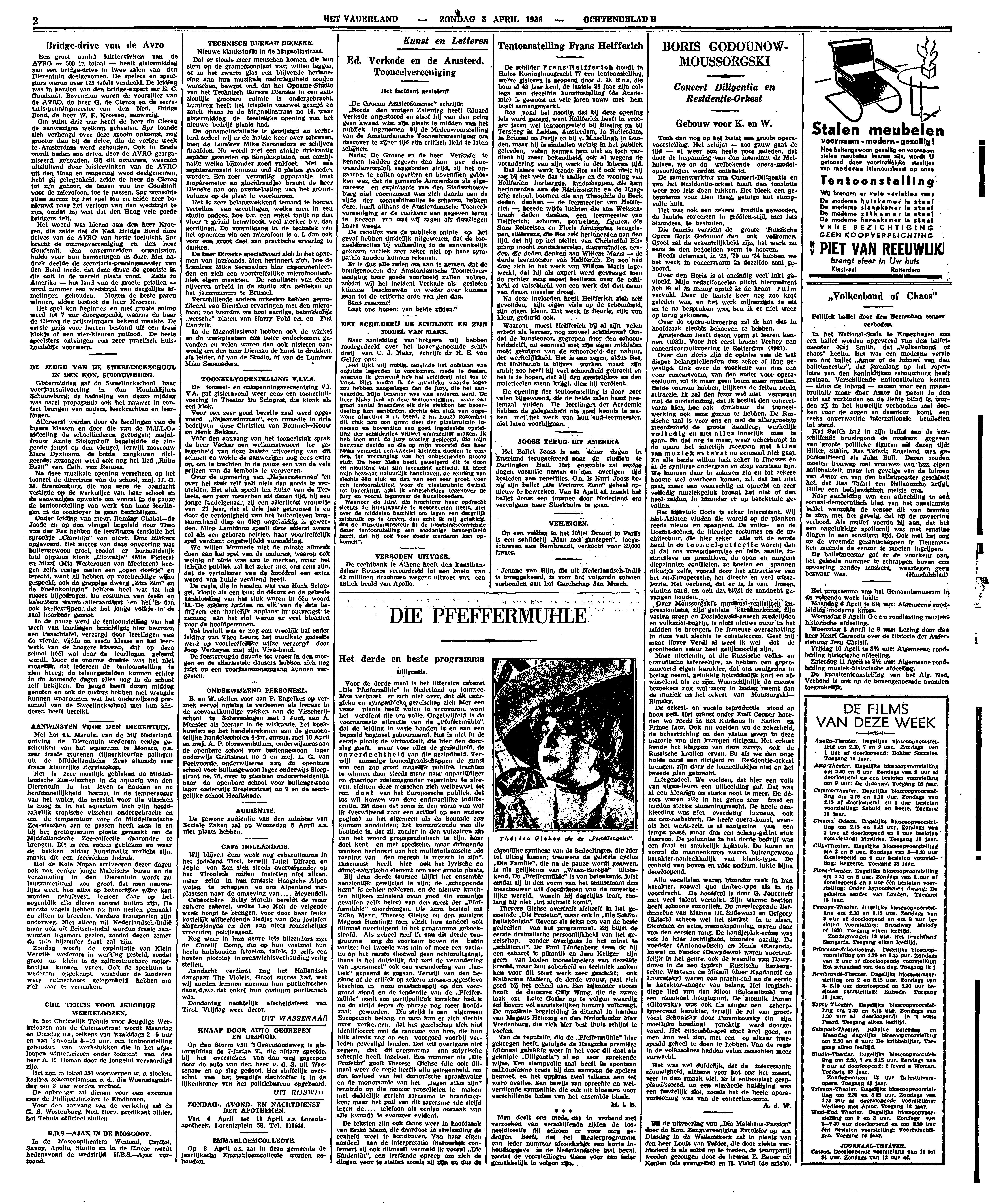 Van de reputatie, die de ‘Pfeffermühle’ hier gekregen heeft, getuigde de Haagsche première (ditmaal gelukkig weer in het voor dit doel als geknipte ‘Diligentia’) al op zeer sprekende wijze. Een stampvolle zaal heeft in spontaan enthousiasme reeds bij den aanvang de spelers begroet, en het applaus zwol telkens aan tot ware ovaties. Een bewijs van oprechte en welverdiende sympathie, die ook uit bloemen voor verschillende leden van het ensemble bleek.