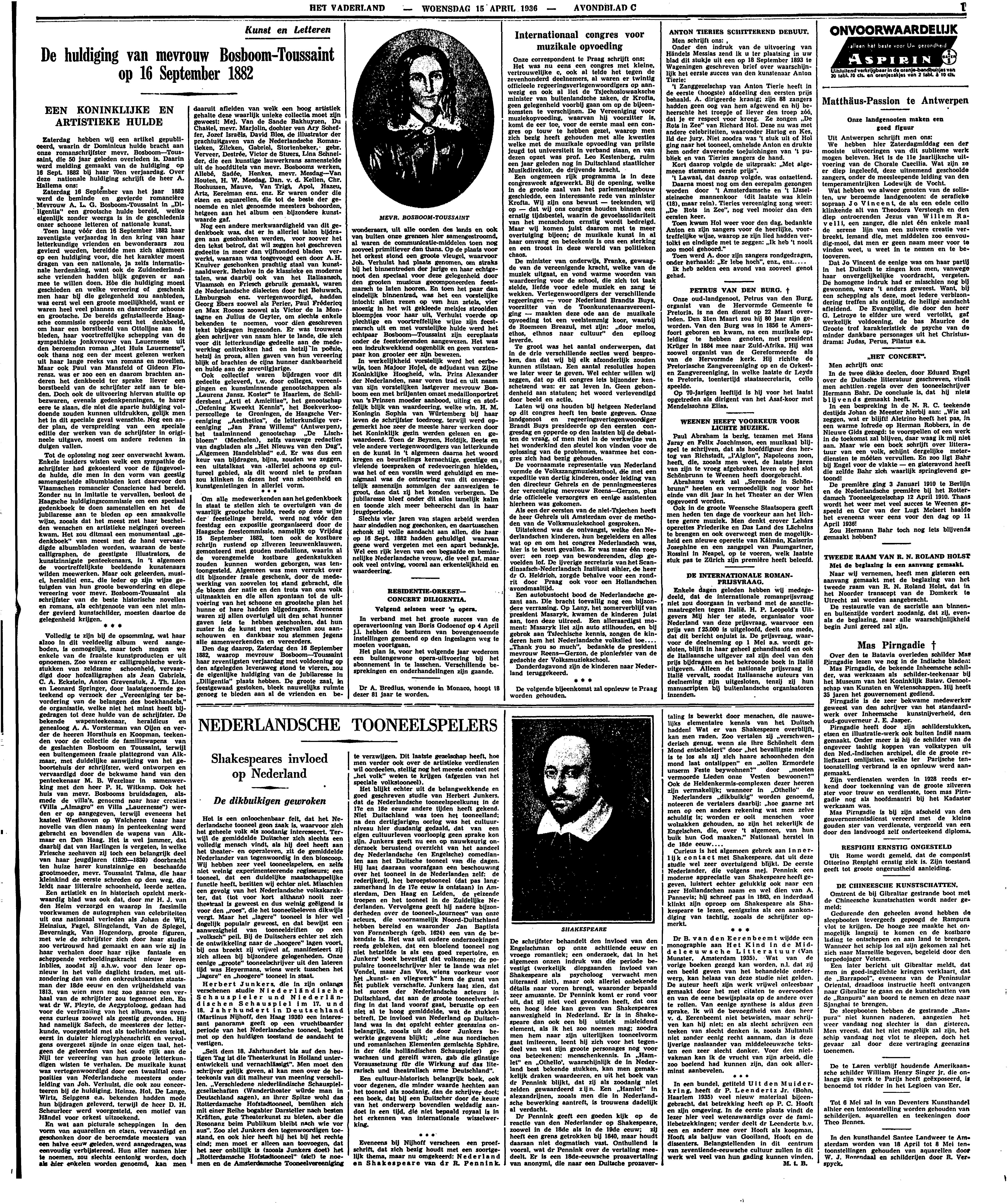 Herbert Junkers, die in zijn onlangs verschenen studie Niederländische Schauspieler und Niederländischen Schauspiel im 17. und 18. Jahrhundert in Deutschland (Martinus Nijhoff, den Haag 1936) een interessant panorama geeft op een vruchtbaarder periode van het Nederlandsche tooneel, begint met op den huidigen toestand de aandacht te vestigen.