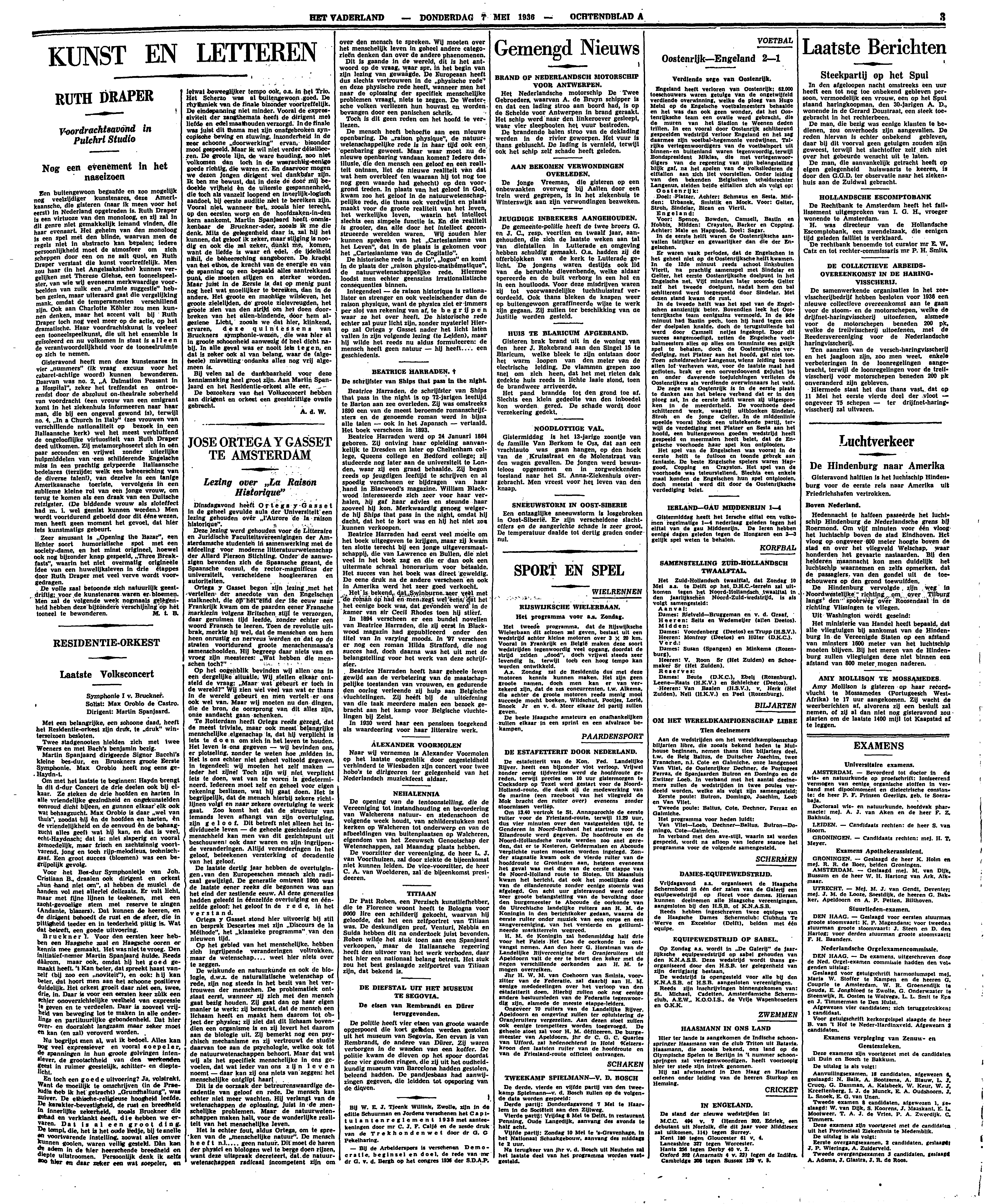 Een buitengewoon begaafde en zoo mogelijk nog veelzijdiger kunstenares, deze Amerikaansche, die gisteren (naar ik meen voor het eerst) in Nederland opgetreden is. Ruth Draper is een virtuoze van den monoloog, en zij zal in dit genre niet gemakkelijk iemand vinden, die haar evenaart. Het geheim van den monoloog is een spel met den blinde, waarvan men de regels niet in abstracto kan bepalen; iedere persoonlijkheid moet de atmosfeer om zich scheppen door een on ne sait quoi, en Ruth Draper verstaat die kunst voortreffelijk. Men zou haar (in het Angelsaksische) kunnen vergelijken met Therese Giehse, een tooneelspeelster, van wie wij eveneens merkwaardige voorbeelden van zulk een ‘ruimte suggestie’ hebben gezien, maar uiteraard gaat die vergelijking mank, omdat de temperamenten verschillend zijn. Ook aan Charlotte Köhler zou men kunnen denken, maar het accent valt bij Ruth Draper toch nog veel meer op de actie, op het dramatische. Haar voordrachtskunst is veeleer een tooneelspeelkunst, die uit het ensemble is geïsoleerd en nu volkomen in staat is alleen de verantwoordelijkheid voor de tooneelruimte op zich te nemen.