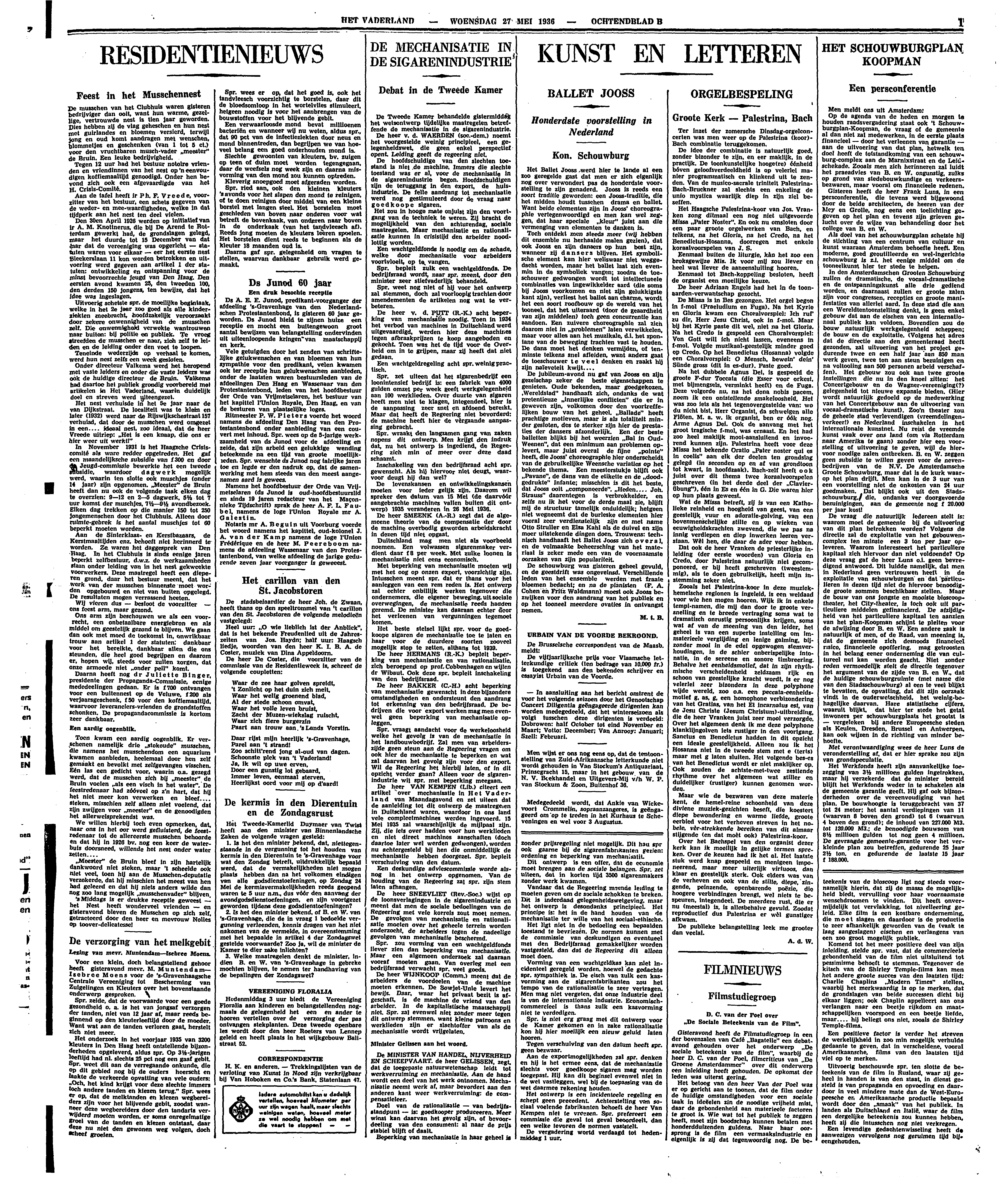 De schouwburg was gisteren geheel gevuld, en de geestdrift was ongeveinsd. Verschillende leden van het ensemble werden met fraaie bloemen bedacht; en na de pianisten (F.A. Cohen en Fritz Waldmann) moest ook Jooss bezwijken voor den aandrang van het publiek en op het tooneel meerdere ovaties in ontvangst nemen.