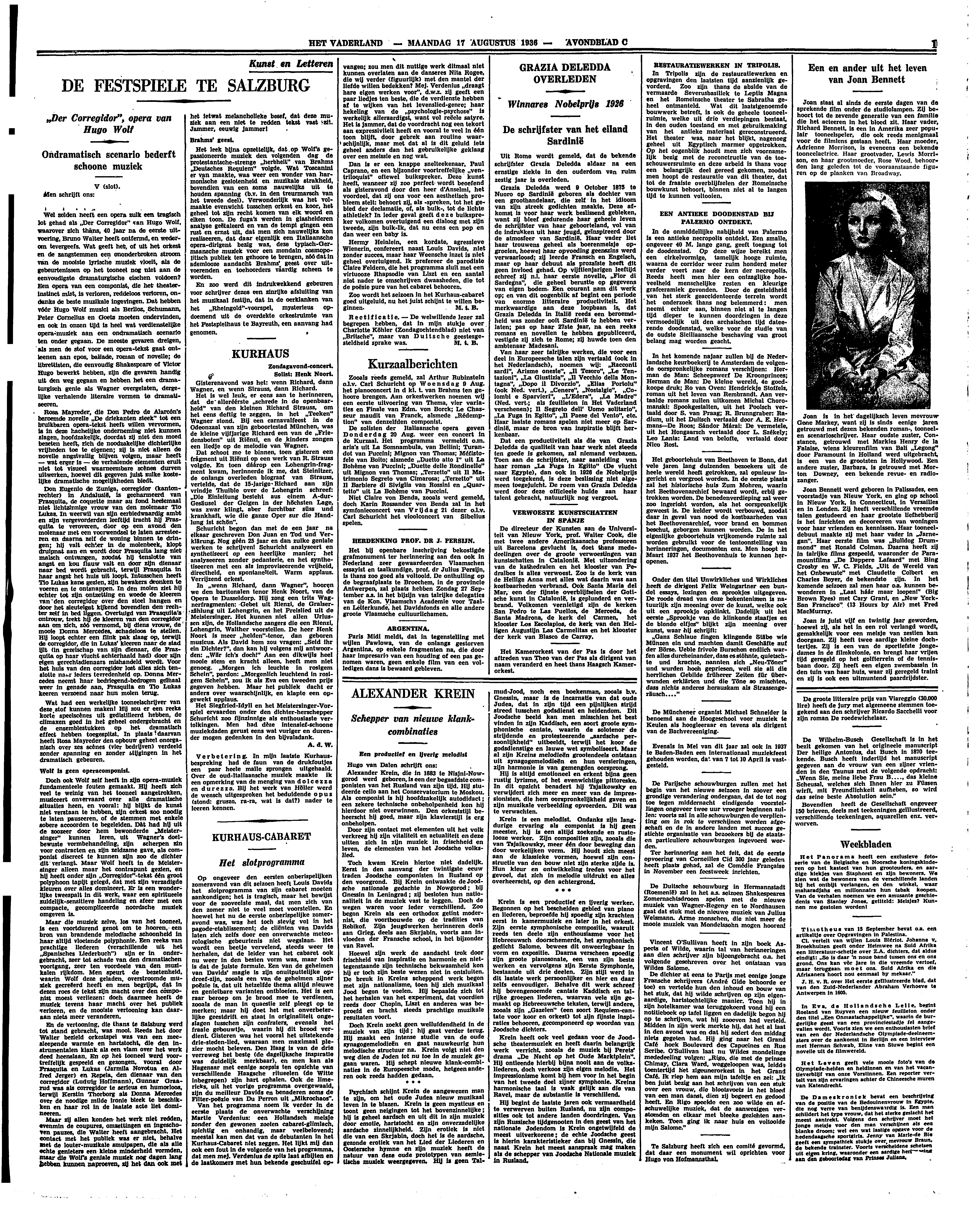 Van het programma noem ik verder in de eerste plaats de onverwachte verschijning Martie Verdenius: een Hollandsch meisje zonder den gewonen zoeten cabaret-glimlach, spichtig en onhandig, maar veelbelovend; meestal kan men dat van de debutanten in het Kurhaus-Cabaret niet zeggen. Het lijkt mij dan ook een fout in de volgorde van het programma, dat men mej. Verdenius de spits laat afbijten en de laatkomers met hun bekende geschuifel opvangen; zou men dit nuttige werk ditmaal niet kunnen overlaten aan de danseres Nita Rogee, die wij verder (figuurlijk) met den mantel der liefde willen bedekken? Mej. Verdenius ‘draagt hare eigen werken voor’, d.w.z. zij geeft een paar liedjes ten beste, die de verdienste hebben af te wijken van het levenslied-genre; haar hekeling van de ‘psychologie-psychose’ is werkelijk alleraardigst, want vol reëele satyre. Het is jammer, dat de voordracht nog een tekort aan expressiviteit heeft en vooral te veel in één toon blijft, door gebrek aan routine waarschijnlijk, maar met dat al is dit geluid iets geheel anders dan het gebruikelijke geklaag over een meissie en nog wat.