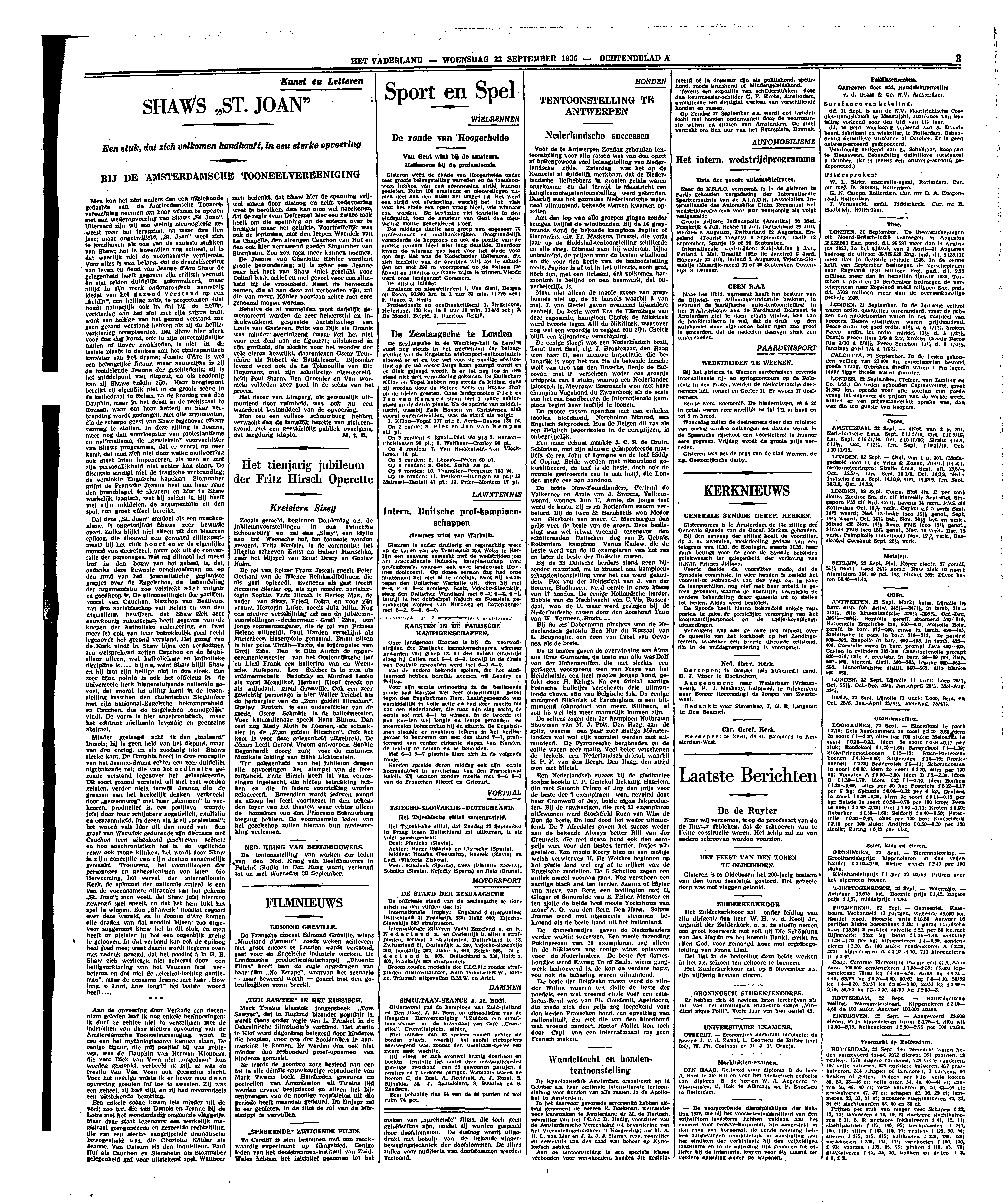 Men kan het niet anders dan een uitstekende gedachte van de Amsterdamsche Tooneelvereeniging noemen om haar seizoen te openen met een wederopvoering van Shaws ‘St. Joan’. Uiteraard zijn wij een weinig nieuwsgierig geweest naar het terugzien, na meer dan tien jaar; maar ongetwijfeld, ‘St. Joan’ weet zich te handhaven als een van de sterkste stukken van Shaw; het is bovendien nog actueel, al is dat waarlijk niet de voornaamste verdienste. Voor alles is van belang, dat de dramatiseering van leven en dood van Jeanne d'Arc Shaw de gelegenheid heeft gegeven zijn critisch vernuft èn zijn zelden duidelijk geformuleerd, maar altijd in zijn werk ondergrondsch aanwezig ideaal van het gezond verstand op een ‘heldin’, een heilige zelfs, te projecteeren (dat houdt natuurlijk ook in, dat hij de heiligverklaring aan het slot met zijn satyre treft, want een heilige van het gezond verstand zou geen gezond verstand hebben als zij de heiligverklaring accepteerde). Dat Shaw hier sterk voor den dag komt, ook in zijn onvermijdelijke fouten of liever zwakheden, is niet in de laatste plaats te danken aan het contrapuntisch karakter van het drama; Jeanne d'Arc is wel een belangrijke figuur, maar nauwelijks is zij de handelende Jeanne der geschiedenis; zij is het middelpunt van dispuut, en als zoodanig kan zij Shaws heldin zijn. Haar hoogtepunt bereikt zij eigenlijk niet in de groote scène in de kathedraal te Reims, na de kroning van den Dauphin, maar in het debat in de rechtszaal te Rouaan, waar om haar ketterij en haar verbranding wordt gedongen, met alle argumenten, die de scherpe geest van Shaw tegenover elkaar vermag te stellen. In deze zitting is Jeanne, meer nog dan voorloopster van protestantisme en nationalisme, de ‘gewiekste’ voorvechtster van Shaws programma, dat er vooral op neer komt, dat men zich niet door welke motiveering ook moet laten imponeeren, als men er met zijn persoonlijkheid niet achter kan staan. De discussie eindigt met de tragische verbranding; de verstokte Engelsche kapelaan Stogumber grijpt de Fransche Jeanne beet om haar naar den brandstapel te sleuren; en hier is Shaw werkelijk tragisch, wat hij zelden is. Hij heeft met zijn middelen, de argumentatic en den spot, een groot effect bereikt.