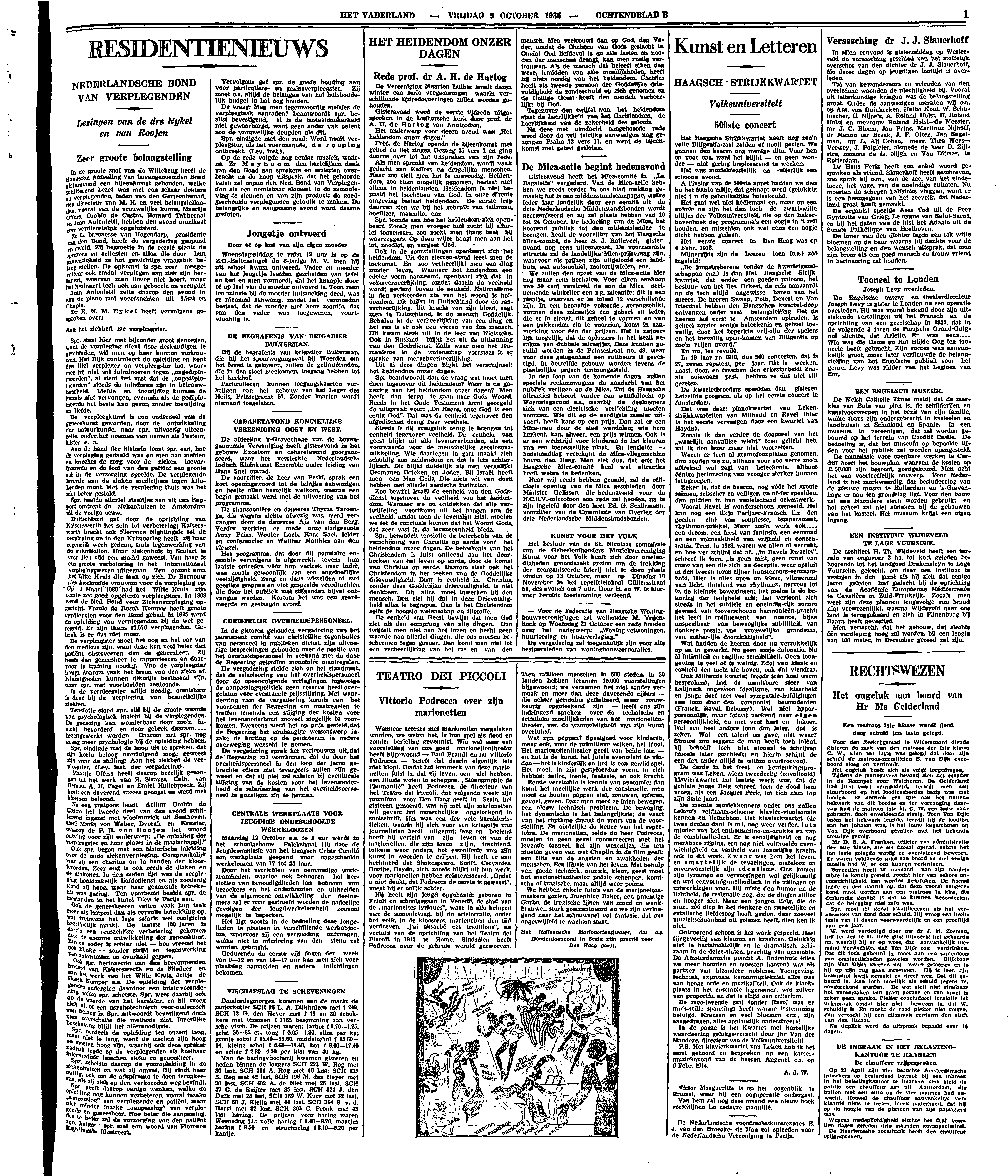 Wanneer acteurs met marionetten vergeleken worden, we weten het, is hun spel als dood en zonder bezieling gevonnist. Wie wel eens een voorstelling van een goed marionettentheater heeft bijgewoond - Paul Brandt en nu Vittorio Podrecca - beseft dat daarin eigenlijk iets niet klopt. Omdat het kenmerk van deze marionetten juist is, dat zij leven, een ziel hebben, een illusie weten te scheppen. ‘Sténographie de l'humanité’ heeft Podrecca, de directeur van het Teatro dei Piccoli, dat volgende week zijn première voor Den Haag geeft in Scala, het gisteren genoemd, wat hij met zijn marionetten wil geven: het menschelijke opgeteekend in snelschrift. Het was een der vele karakteristieken, waarin hij zich voor een kringetje van journalisten heeft uitgeput; lang en boeiend heeft hij verteld van zijn leven en van de marionetten, die zijn leven zijn, trachtend, telkens weer anders, het essentieele van zijn kunst in woorden te grijpen. Hij heeft er aan herinnerd dat Shakespeare, Swift, Cervantes, Goethe, Haydn, zich, zooals blijkt uit hun werk, voor marionetten hebben geïnteresseerd. ‘Opdat u niet denkt, dat Podrecca de eerste is geweest’, voegt hij er oolijk achter.