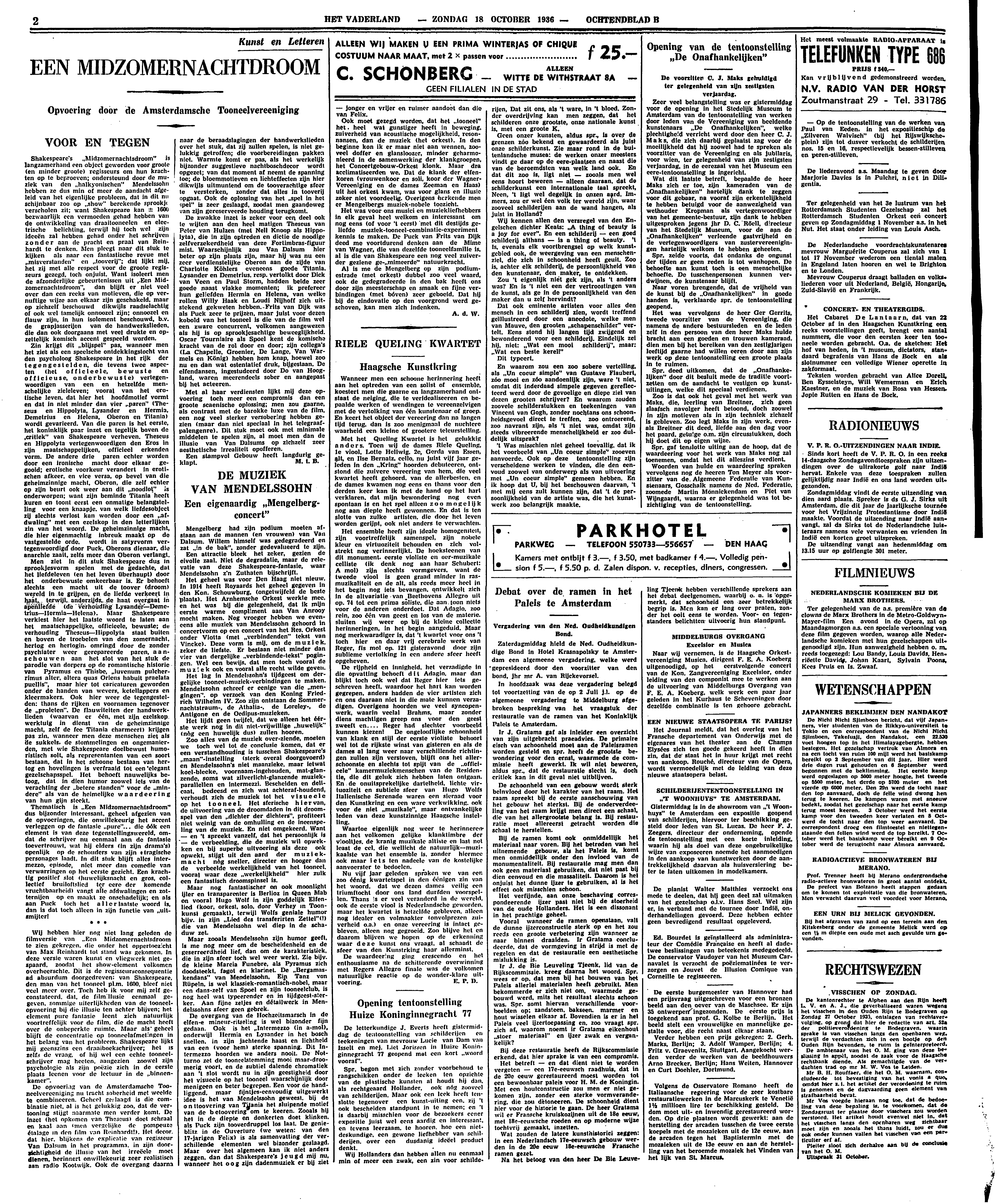 Shakespeare's ‘Midzomernachtsdroom’ is langzamerhand een object geworden voor groote (en minder groote) regisseurs om hun krachten op te beproeven; ondersteund door de muziek van den ‘halkyonischen’ Mendelssohn hebben ze dus min of meer de aandacht afgeleid van het eigenlijke probleem, dat in dit nu schijnbaar zoo op ‘show’ berekende sprookje verscholen zit; want Shakespeare kan ± 1600 bezwaarlijk een vermoeden gehad hebben van de ontwikkeling van draaitooneelen en electrische belichting, terwijl hij toch wel zijn ideeën zal hebben gehad onder het schrijven zonder aan de pracht en praal van Reinhardt te denken. Men pleegt naar dit stuk te kijken als naar een fantastische revue met ‘misverstanden’ en ‘tooverij’; dat lijkt mij, het zij met alle respect voor de groote regisseurs gezegd, toch onjuist. Want isoleert men de afzonderlijke gebeurtenissen uit ‘Een Midzomernachtsdroom’, dan blijft er niet veel over dan een reeks van motieven, die op vernuftige wijze aan elkaar zijn geschakeld, maar op zichzelf beschouwd dikwijls raadselachtig of ook wel tamelijk onnoozel zijn; onnoozel en flauw zijn, in hun isolement beschouwd, b.v. de grapjasserijen van de handwerkslieden, die dan ook doorgaans met veel drukte en opzettelijk komisch accent gespeeld worden.