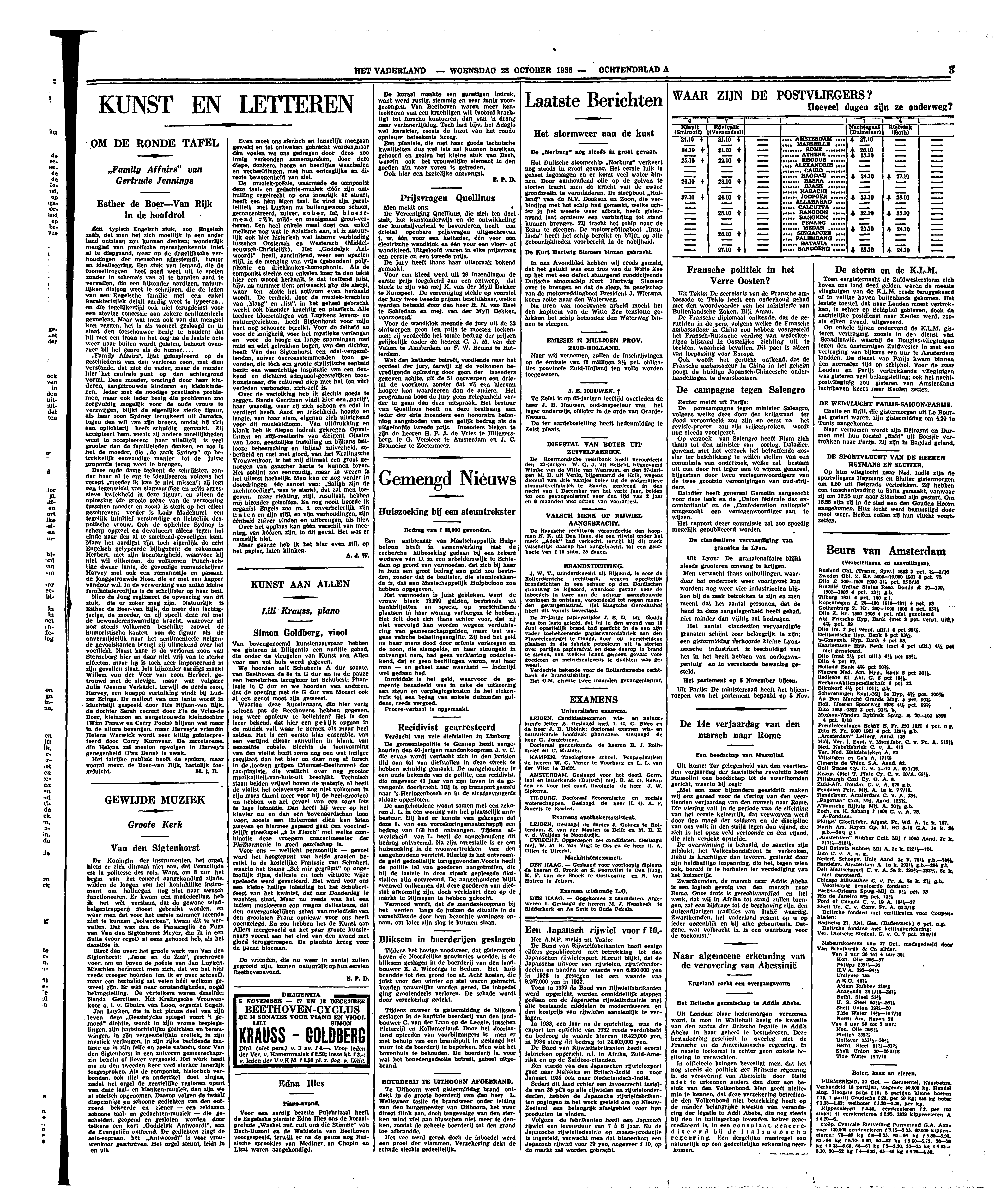 ‘Family Affairs’, lijkt geïnspireerd op de geschiedenis van den verloren zoon, met dien verstande, dat niet de vader, maar de moeder hier het centrale punt op den achtergrond vormt. Deze moeder, omringd door haar kinderen, aangetrouwde kinderen en kleinkinderen, ieder met de noodige practische problemen, maar ook ieder bezig die problemen zoo zorgvuldig mogelijk voor de oude vrouw te verzwijgen, blijkt de eigenlijke sterke figuur, als haar zoon Sydney terugkeert uit Jamaica, tegen den wil van zijn broers, omdat hij zich aan oplichterij heeft schuldig gemaakt. Zij accepteert hem, zooals zij andere moeilijkheden weet te accepteeren; haar vitaliteit is veel grooter dan de familieleden denken, en zoo is het de moeder, die ‘de zaak Sydney’ op betrekkelijk eenvoudige manier tot de juiste proportie terug weet te brengen.