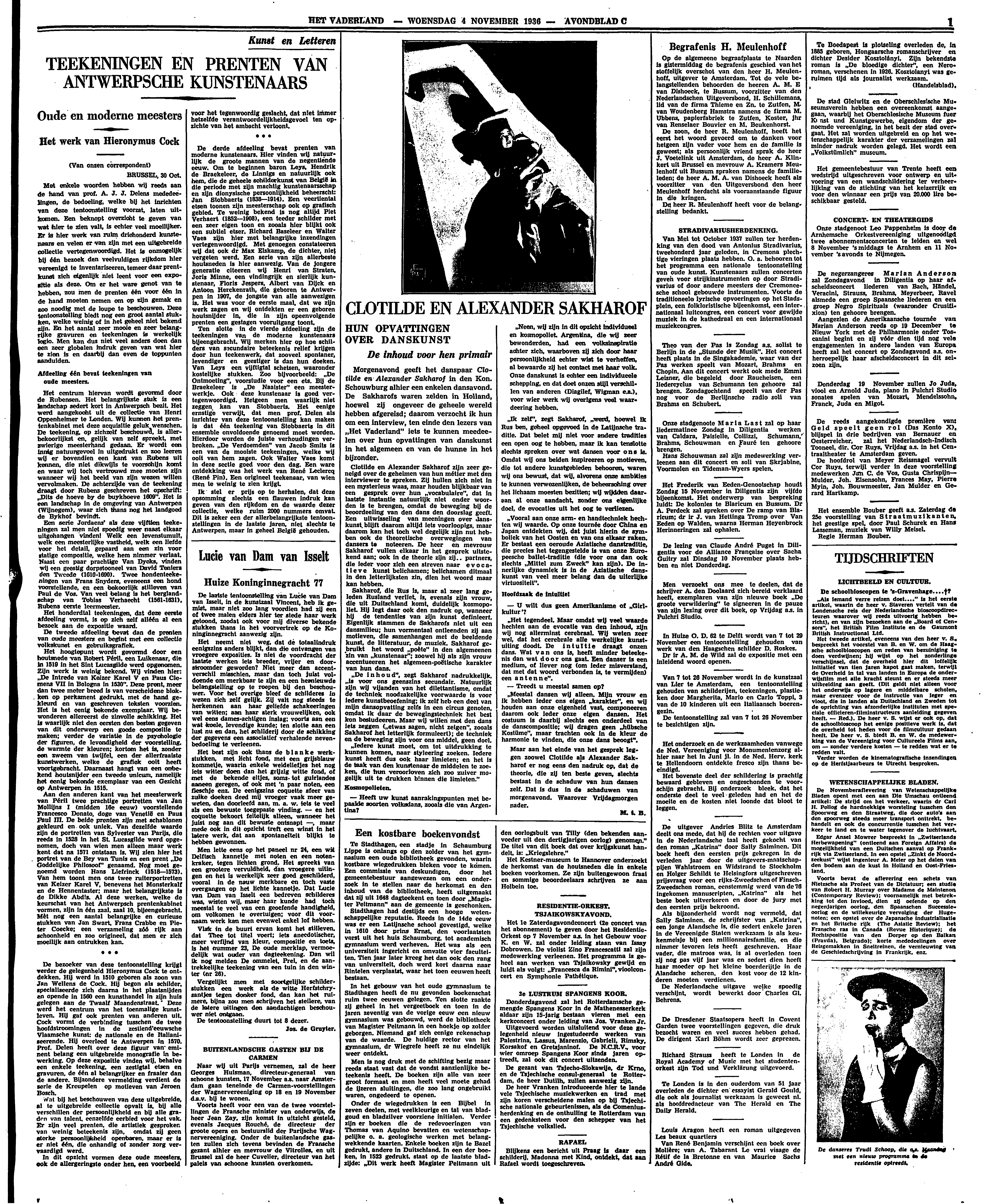 Morgenavond geeft het danspaar Clotilde en Alexander Sakharof in den Kon. Schouwburg alhier een enkelen dansavond. De Sakharofs waren zelden in Holland, hoewel zij ongeveer de geheele wereld hebben afgereisd; daarom verzocht ik hun om een interview, ten einde den lezers van ‘Het Vaderland’ iets te kunnen meedeelen over hun opvattingen van danskunst in het algemeen en van de hunne in het bijzonder.