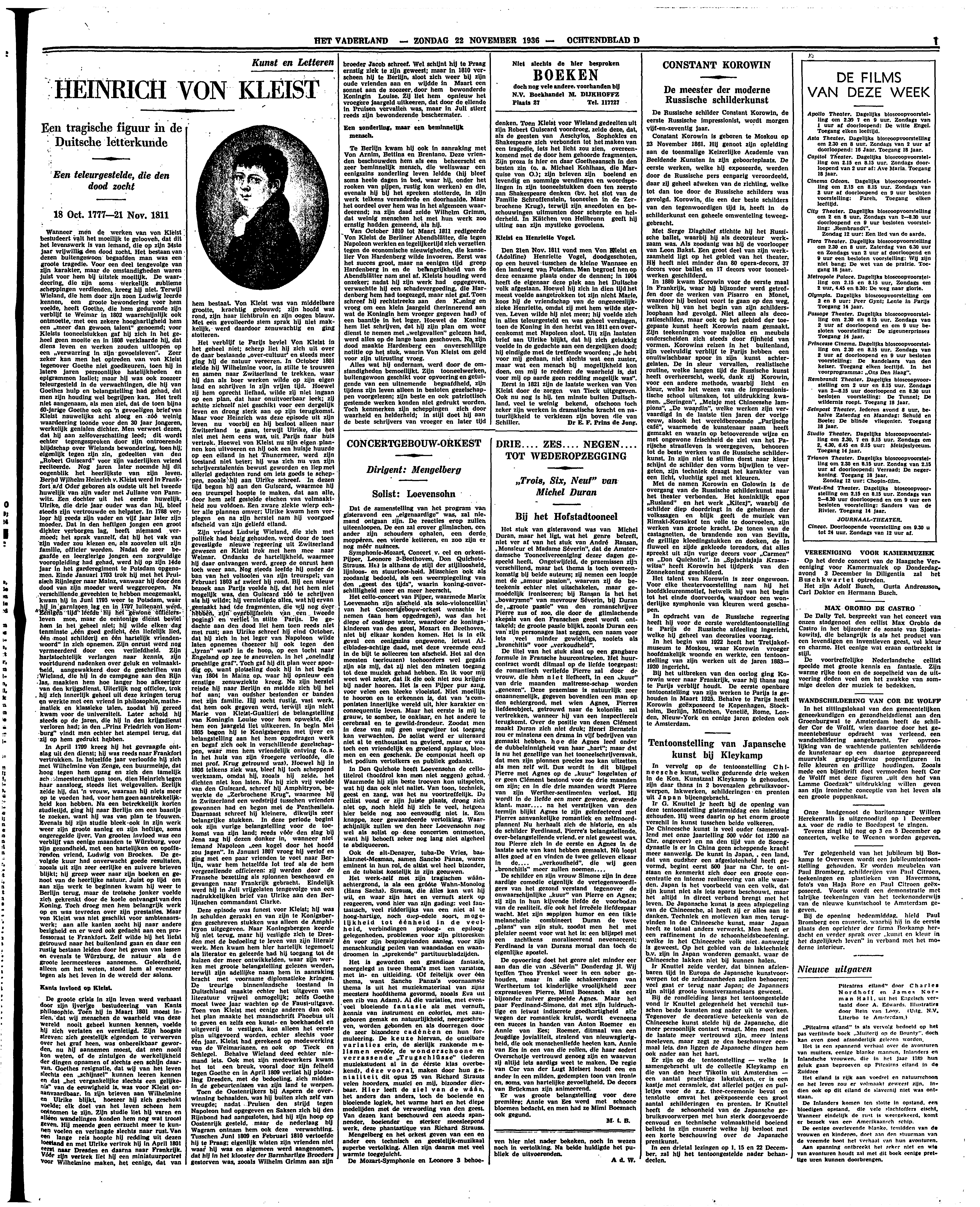 Het stuk van gisteravond was van Michel Duran, maar het ligt, wat het genre betreft, niet ver af van het stuk van André Ransan, ‘Monsieur et Madame Séverin’, dat de Amsterdamsche Tooneelvereeniging dezer dagen gespeeld heeft. Ongetwijfeld, de praemissen zijn verschillend, maar het thema is toch overeenkomstig bij beide auteurs; zij nemen een loopje met de ‘amour passion’, waarvan zij de beteekenis echter niet uitschakelen, maar gemoedelijk ironiseeren; bij Ransan is het het ‘bovarysme’ van mevrouw Séverin, bij Duran de ‘groote passie’ van den romanschrijver Pierre zus of zoo, die door de glimlachende skepsis van den Franschen geest wordt onttakeld; de groote passie blijkt, zooals Duran een van zijn personages laat zeggen, een naam voor iets veel minder gewichtigs, zooiets als ‘bronchitis’ voor ‘verkoudheid’.