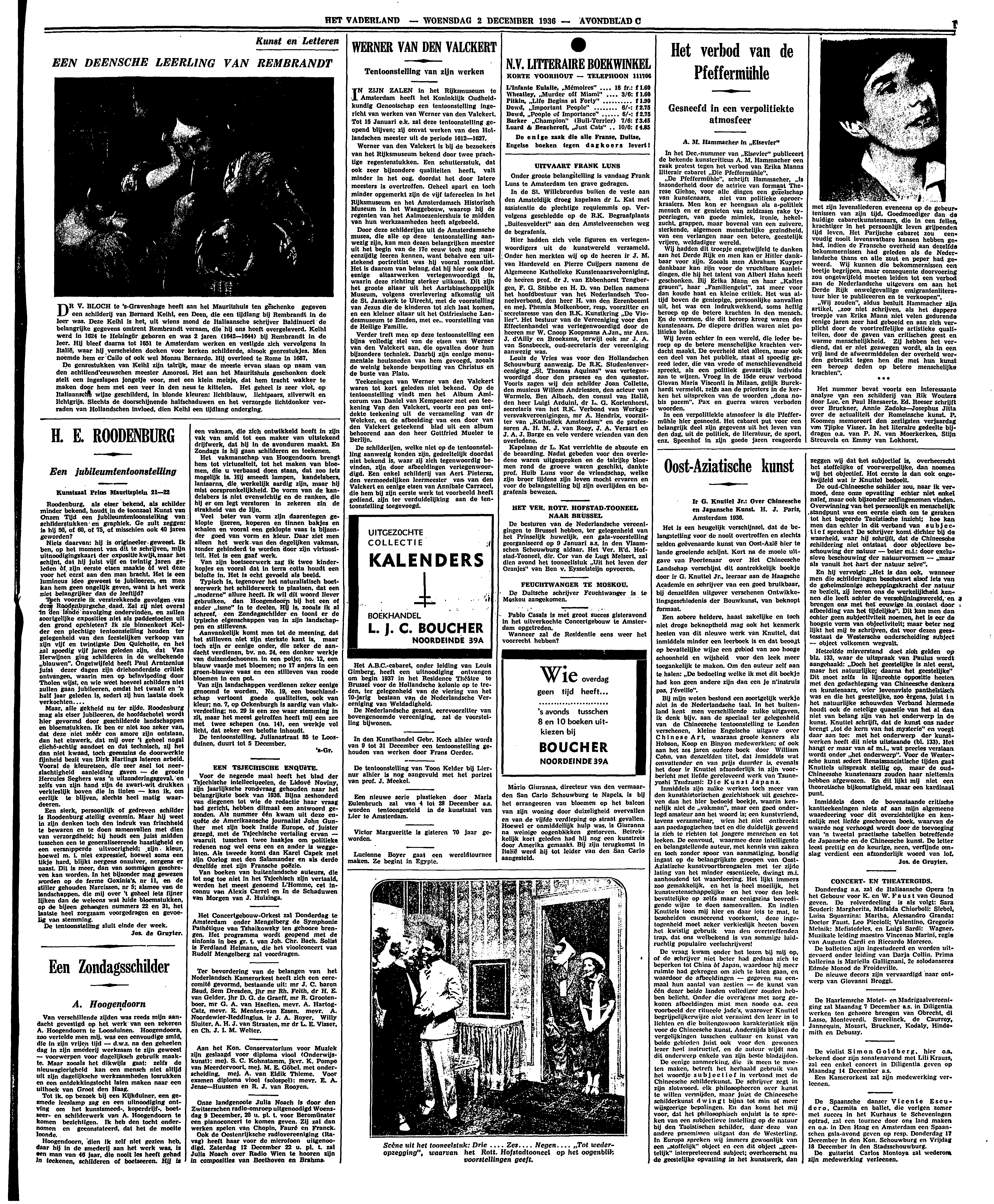 In een verpolitiekte atmosfeer is die Pfeffermühle hier gesneefd. Het cabaret put voor een belangrijk deel zijn gegevens uit het leven van den dag, uit de politiek, de literatuur, de sport, enz. Speenhof in zijn goede jaren reageerde met zijn levensliederen eveneens op de gebeurtenissen van zijn tijd. Goedmoediger dan de huidige cabaretkunstenaars, die in een feller, krachtiger in het persoonlijk leven grijpenden tijd leven. Het Parijsche cabaret zou eenvoudig nooit levensvatbare kansen hebben gehad, indien de Fransche overheid aan dezelfde bekommernissen had geleden als de Nederlandsche thans en alle zout en peper had geweerd. Wij kunnen die bekommernissen een beetje begrijpen, maar consequente doorvoering zou ongetwijfeld moeten leiden tot een verbod aan de Nederlandsche uitgevers om aan het Derde Rijk onwelgevallige emigrantenliteratuur hier te publiceeren en te verkoopen’.