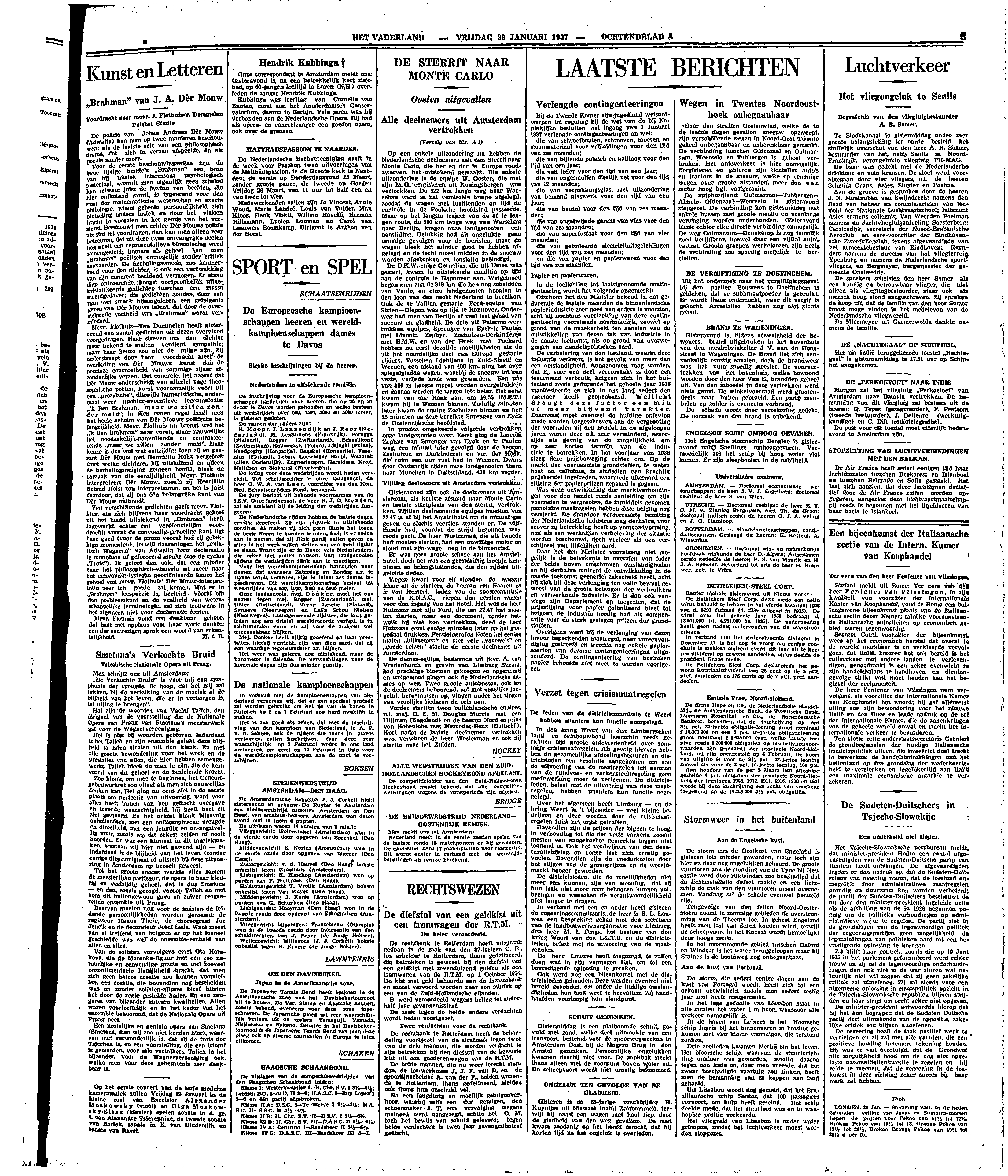 Van verschillende gedichten geeft mevr. Flothuis, die zich blijkens haar voordracht geheel uit het hoofd uitstekend in ‘Brahman’ heeft ingewerkt, echter een verdienstelijke voordracht; vooral de eenvoudig-gevoelige kant ligt haar goed (voor de pauze vooral had zij gelukkige momenten), terwijl daarentegen het ‘extatisch Wagnern’ van Adwaita haar declamatie te monotoon of geforceerd maakt (zoo de cyclus ‘Trots’). Ik geloof dan ook, dat een minder naar het philosophisch-visueele en meer naar het eenvoudig-lyrische georiënteerde keuze het geheel van mevr. Flothuis' Dèr Mouw-interpretatie zeer ten goede zal komen. Wat er in ‘Brahman’ leespoëzie is, boeiend vooral om den probleemkant en de veelheid van wetenschappelijke terminologie, zal zich trouwens in het algemeen niet voor declamatie leenen.