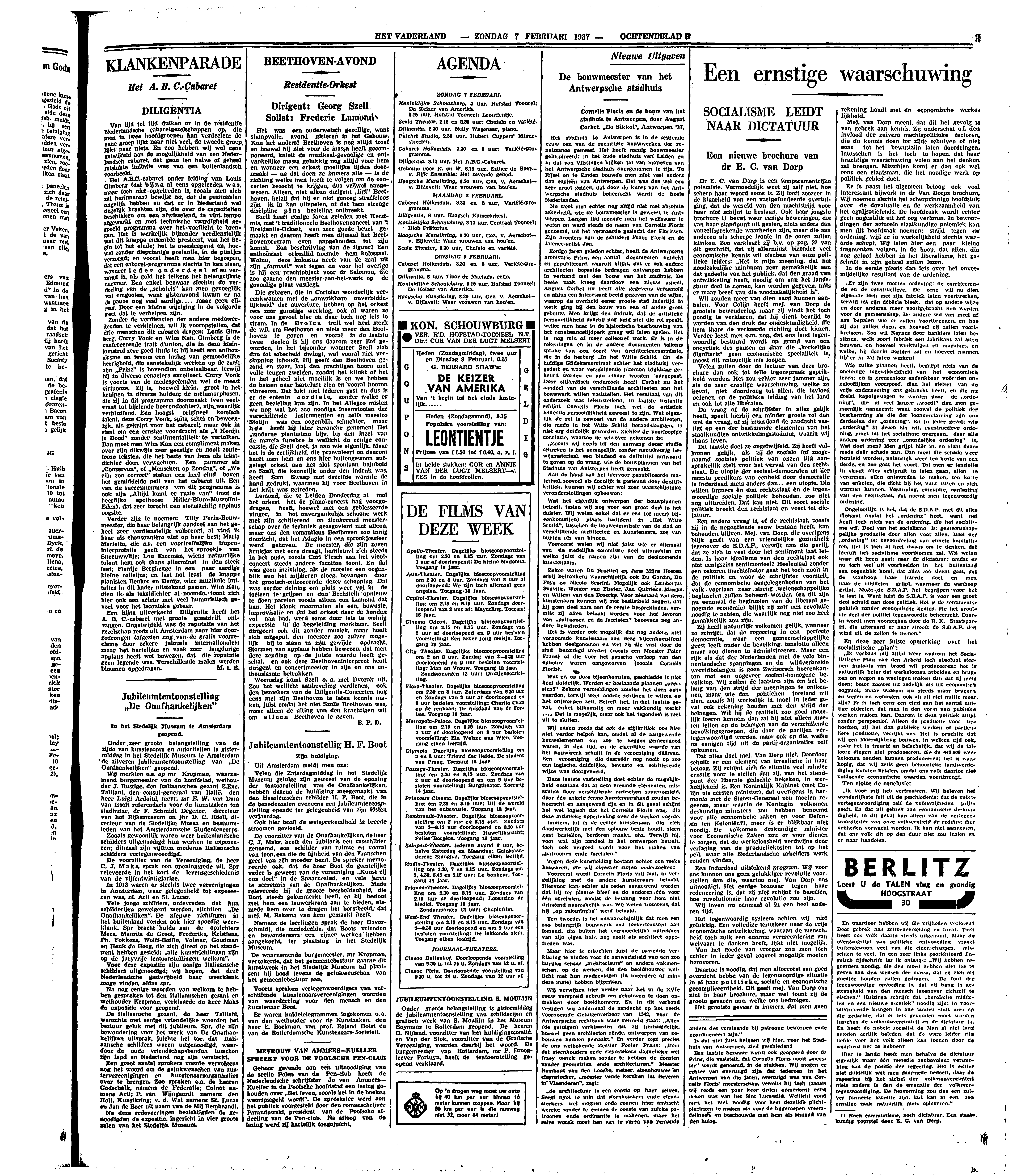 Het A.B.C.-cabaret onder leiding van Louis Gimberg (dat bijna al eens opgetreden was, maar toch niet-opgetreden is, zooals men zich zal herinneren) bewijst nu, dat de pessimisten ongelijk hebben en dat er in Nederland wel degelijk krachten zijn, die over de capaciteiten beschikken om een afwisselend, in vlot tempo afgewerkt en met technische vaardigheid gespeeld programma over het voetlicht te brengen. Het is werkelijk bijzonder verdienstelijk wat dit knappe ensemble presteert, van het begin tot het einde; het is meesleepend en, hoewel zonder diepzinnige pretentie, in de puntjes verzorgd; en vooral heeft men hier begrepen, dat een cabaret-programma slechts in kan slaan, wanneer ieder onderdeel af en verzorgd is, als gold het telkens het belangrijkste nummer. Een enkel bezwaar slechts: de verdeeling van de ‘schotels’ kan men gevoeglijk wat omgooien, want gisteravond kwam er na de pauze nog veel aardigs.... maar geen climax. Door een kleine wijziging in de volgorde moet dat te verhelpen zijn.