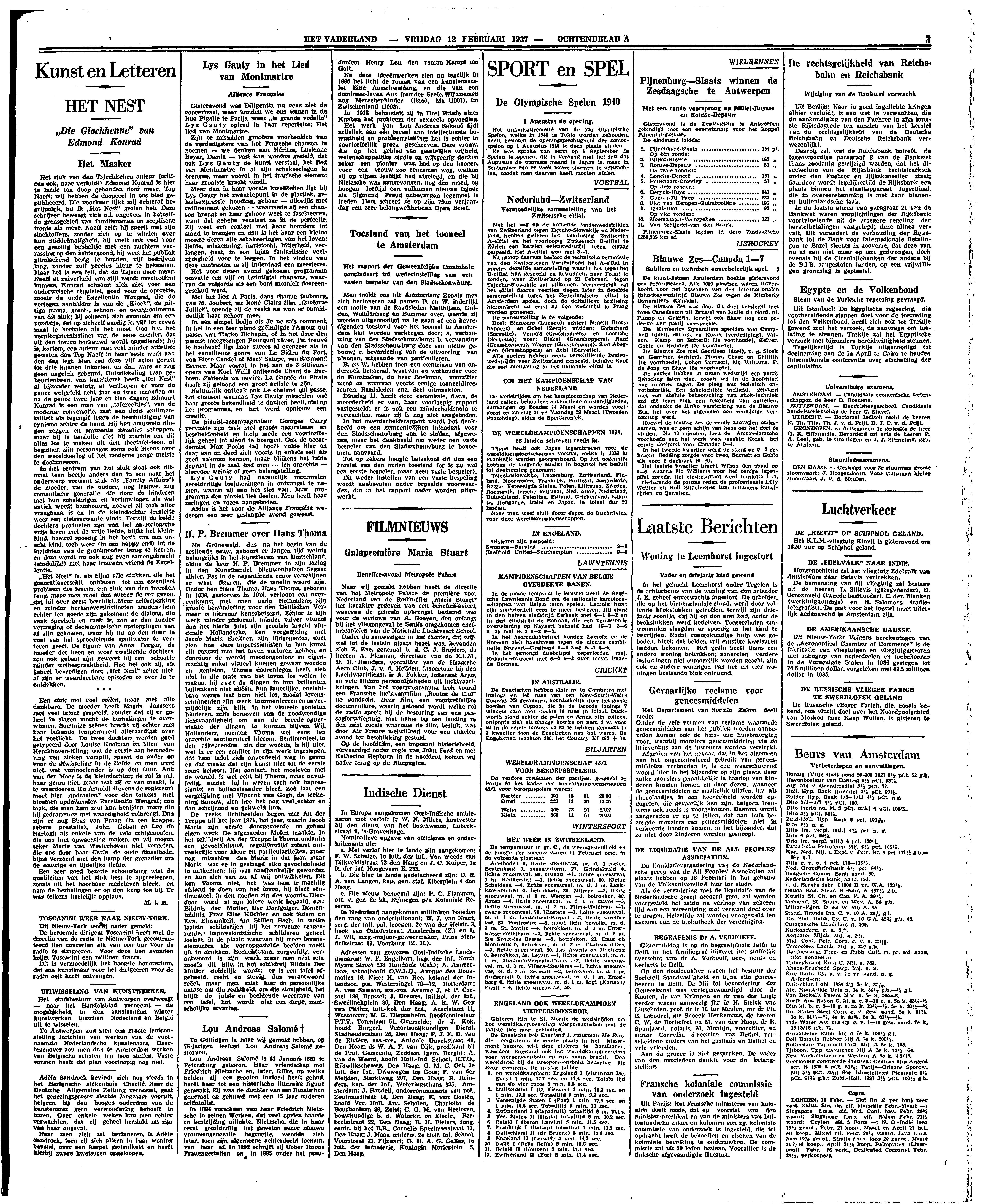 Het stuk van den Tsjechischen auteur (criticus ook, naar verluidt) Edmond Konrad is hier te lande ten doop gehouden door mevr. Top Naeff; wij hebben de doopceel in ons blad gepubliceerd. Die voorkeur lijkt mij achteraf begrijpelijk, nu ik ‘Het Nest’ gezien heb. Deze schrijver beweegt zich n.l. ongeveer in hetzelfde grensgebied van familieroman en sceptische ironie als mevr. Naeff zelf; hij speelt met zijn slachtoffers, zonder zich op te winden over hun middelmatigheid, hij voelt ook veel voor een gezellig babbeltje met een nuchtere verrassing op den achtergrond, hij weet het publiek glimlachend bezig te houden, vijf bedrijven lang, zonder zelf precies kleur te bekennen. Maar het is een feit, dat de Tsjech door mevr. Naeff in zuiverheid van stijl wordt overtroffen; immers, Konrad schaamt zich niet voor een ouderwetsche requisiet, goed voor de operette, zooals de oude Excellentie Wengraf, die de verlegen aanbidder is van de ‘Kloek’, de pittige mama, groot-, schoon- en overgrootmama van dit stuk; hij schaamt zich evenmin om een vondstje, dat op zichzelf aardig is, vijf tot zeven maal te herhalen als het moet (zoo b.v. het verpleegstersinstinct van de eene dochter, dat uit den treure herkauwd wordt opgediend); hij is, kortom, een auteur met veel minder artistiek geweten dan Top Naeff in haar beste werk aan den dag legt. Men zou deze vijf acten gerust tot drie kunnen inkorten, en dan ware er nog geen ongeluk gebeurd. Ontwikkeling (van gebeurtenissen, van karakters) heeft ‘Het Nest’ al bijzonder weinig, al verloopen er voor de pauze welgeteld acht jaar en twee maanden en na de pauze twee jaar en tien dagen; Edmond Konrad is een man van ‘tafereeltjes’, van de moderne conversatie, met een dosis sentimentaliteit als tegengif tegen de beschuldiging van cynisme achter de hand. Hij kan amusante dingen zeggen en amusante situaties scheppen, maar hij is tenslotte niet bij machte om dit alles los te maken uit den theetafel-toon, al beginnen zijn personages soms ook ineens over den wereldoorlog of het moderne jonge meisje te declameeren.