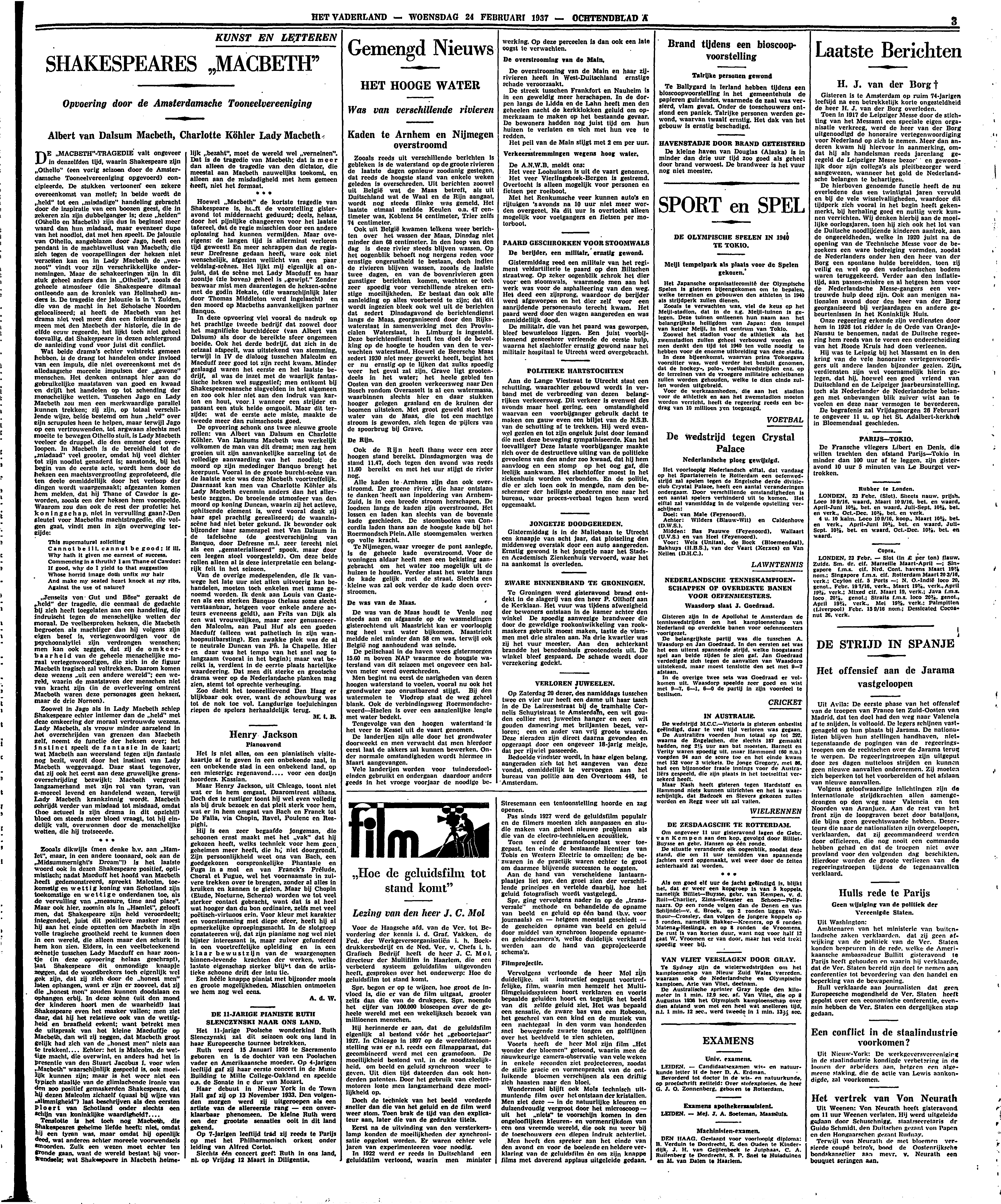 Hoewel ‘Macbeth’ de kortste tragedie van Shakespeare is, heeft de voorstelling gisteravond tot middernacht geduurd; deels, helaas, door het pijnlijke changeeren voor het laatste tafereel, dat de regie misschien door een andere oplossing had kunnen vermijden. Maar overigens: de langen tijd is allerminst verloren tijd geweest! En meer schrappen dan de regisseur Drefresne gedaan heeft, ware ook niet wenschelijk, afgezien wellicht van een paar veldslag-scènes. Het lijkt mij eigenlijk al onjuist, dat de scène met Lady Macduff en haar zoontje (zie boven) geheel is ‘gewipt.’ Zonder bezwaar mist men daarentegen de heksen-scène met de godin Hekate, (die waarschijnlijk later door Thomas Middleton werd ingelascht) en den moord op Macbeths aanvankelijken partner Banquo.