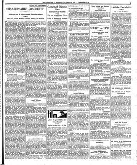 In deze opvoering viel vooral de nadruk op het prachtige tweede bedrijf dat zoowel door het magnifieke burchtdécor (van Albert van Dalsum) als door de bereikte sfeer ongemeen boeide. Ook het derde bedrijf, dat zich in de eetzaal afspeelt, was uitstekend van stemming, terwijl in IV de dialoog tusschen Malcolm en Macduff zeer goed tot zijn recht kwam. Minder geslaagd waren het eerste en het laatste bedrijf, al was de inzet met de waarlijk fantastische heksen wel suggestief; men ontkomt bij Shakespeareaansche slagvelden in het algemeen en zoo ook hier niet aan den indruk van karton en hout, vooral wanneer een strijder en passant een stuk heide omgooit. Maar dit terzijde: wat de eerste acte miste, maakte de tweede meer dan ruimschoots goed.