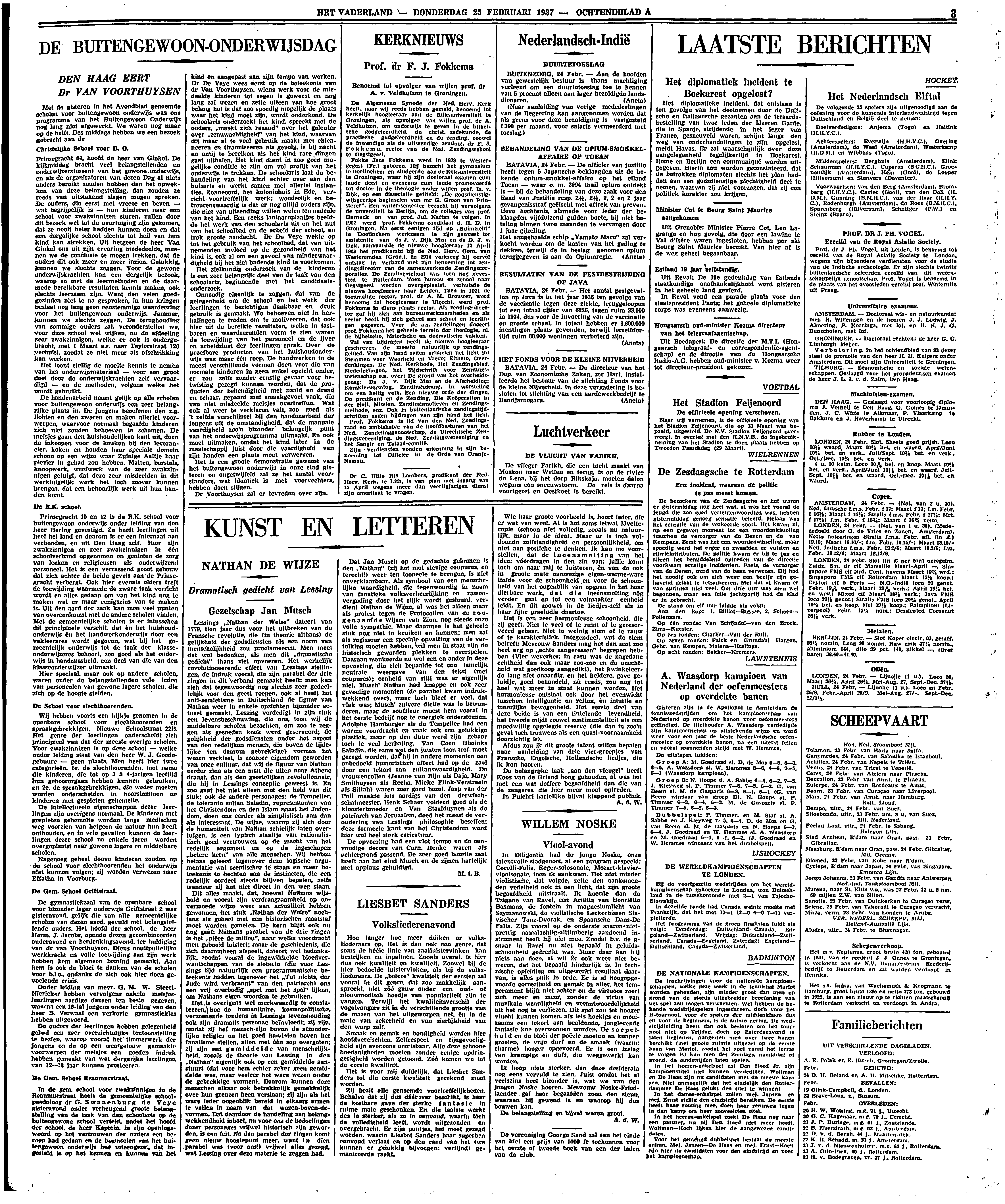 Dat Jan Musch op de gedachte gekomen is den ‘Nathan’ (zij het met stevige coupures, en terecht!) weer ten tooneele te brengen, is niet onverklaarbaar. Als symbool van een menschelijke waardigheid, die tegenwoordig in naam van fanatieke volksverheerlijking en rassenvergoding door het slijk wordt gesleurd, verdient Nathan de Wijze, al was het alleen maar als protest tegen de Protocollen van de zoogenaamde Wijzen van Zion. nog steeds onze volle sympathie. Maar daarmee is het geheele stuk nog niet in kruiken en kannen; men zal als regisseur een speciale opvatting van de vertolking moeten hebben, wil men in staat zijn de historisch geworden plekken te overspelen. Daaraan mankeerde nu wel een en ander in deze opvoering, die zich bepaalde tot een tamelijk neutrale weergave van den tekst (met coupures); eenheid van stijl was er eigenlijk niet. Musch' Nathan had knappe en ook zeer gevoelige momenten (de parabel kwam indrukwekkend over), maar toch bleef er veel, dat vlak was; Musch' zuivere dictie was te bewonderen, maar de souffleur moest hem vooral in het eerste bedrijf nog te energiek ondersteunen. Adolphe Hamburger als de Tempelier had een warme voordracht en vaak ook een gelukkige plastiek, maar op den duur werd zijn gebaar toch te veel herhaling. Van Coen Hissinks Saladin, die soms wel den juisten toon trof, moet gezegd worden, dat hij in andere momenten een onbedoeld humoristisch effect had op de zaal door een tekort aan sultanwaardigheid. De vrouwenrollen (Jeanne van Rijn als Daja, Mary Smithuysen als Recha, Mieke Flink-Verstraete als Sittah) waren zeer goed bezet. Jaap van der Poll maakte iets aardigs van den derwischschatmeester. Henk Schaer voldeed goed als de kloosterbroeder en Van Staalduynen als de patriarch van Jeruzalem, deed het meest de veroudering van Lessings philosophie beseffen; deze formeele kant van het Christendom werd hier wel heel sterk caricatuur.