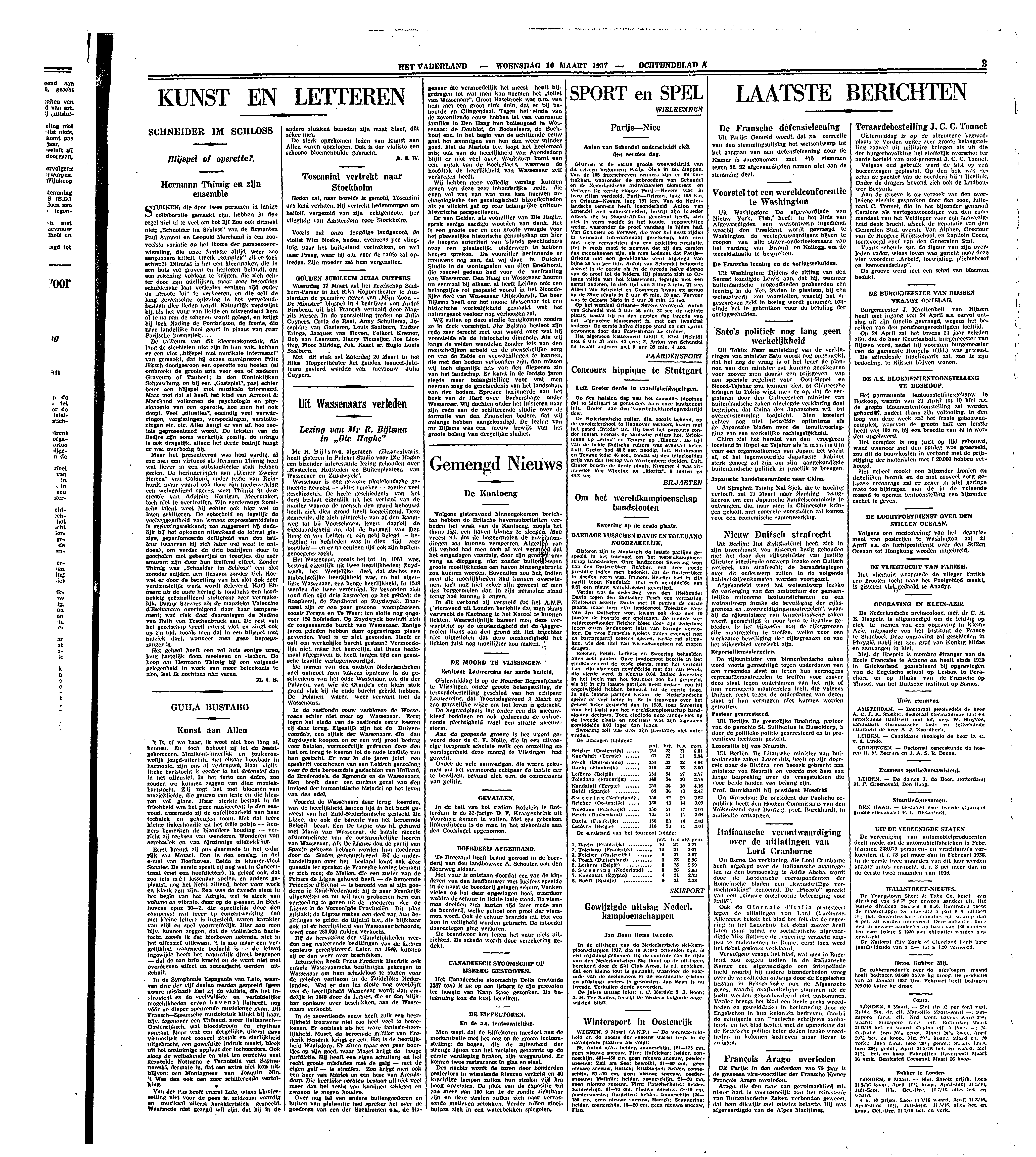 Maar het presenteeren was heel aardig, al zou men een virtuoos als Hermann Thimig heel wat liever in een substantieeler stuk hebben gezien. De herinneringen aan ‘Diener Zweier Herren’ van Goldoni, onder regie van Reinhardt, maar vooral ook door zijn medewerking een welverdiend succes, weet Thimig in deze creatie van Adolphe Hortigan, kleermaker, toch niet te overtreffen. Zijn eersterangs komische talent weet hij echter ook hier wel te laten schitteren. De soberheid en tegelijk de veelzeggendheid van 's mans expressiemiddelen is verbazingwekkend; zoo suggereert hij dadelijk bij het opkomen uitstekend de ietwat glazige, geparfumeerde deftigheid van den tailleur (waarvan hij zich later wel weet te ontdoen), om verder de drie bedrijven door te goochelen met gebaartjes en toontjes, die zeer amusant zijn door hun treffend effect. Zonder Thimig was ‘Schneider im Schloss’ een slot zonder snijder, een lichaam zonder ziel. Hoewel er door de bezetting van het slot ook zeer verdienstelijk werk wordt geleverd. Karl Ehmann als de oude hertog is (ondanks een hardnekkig geëxpoliteerd stotteren) zeer vermakelijk, Dagny Servaes als de manzieke Valentine d'Eschamare overtuigend door haar temperament; wat vlak doet daarentegen de Nadine van Ruth von Teschenbruck aan. De rest van het gezelschap speelt uiterst vlot, en zingt ook op z'n tijd, zooals men dat in een blijspel met muziek doet, wanneer men geen beroepszanger is.