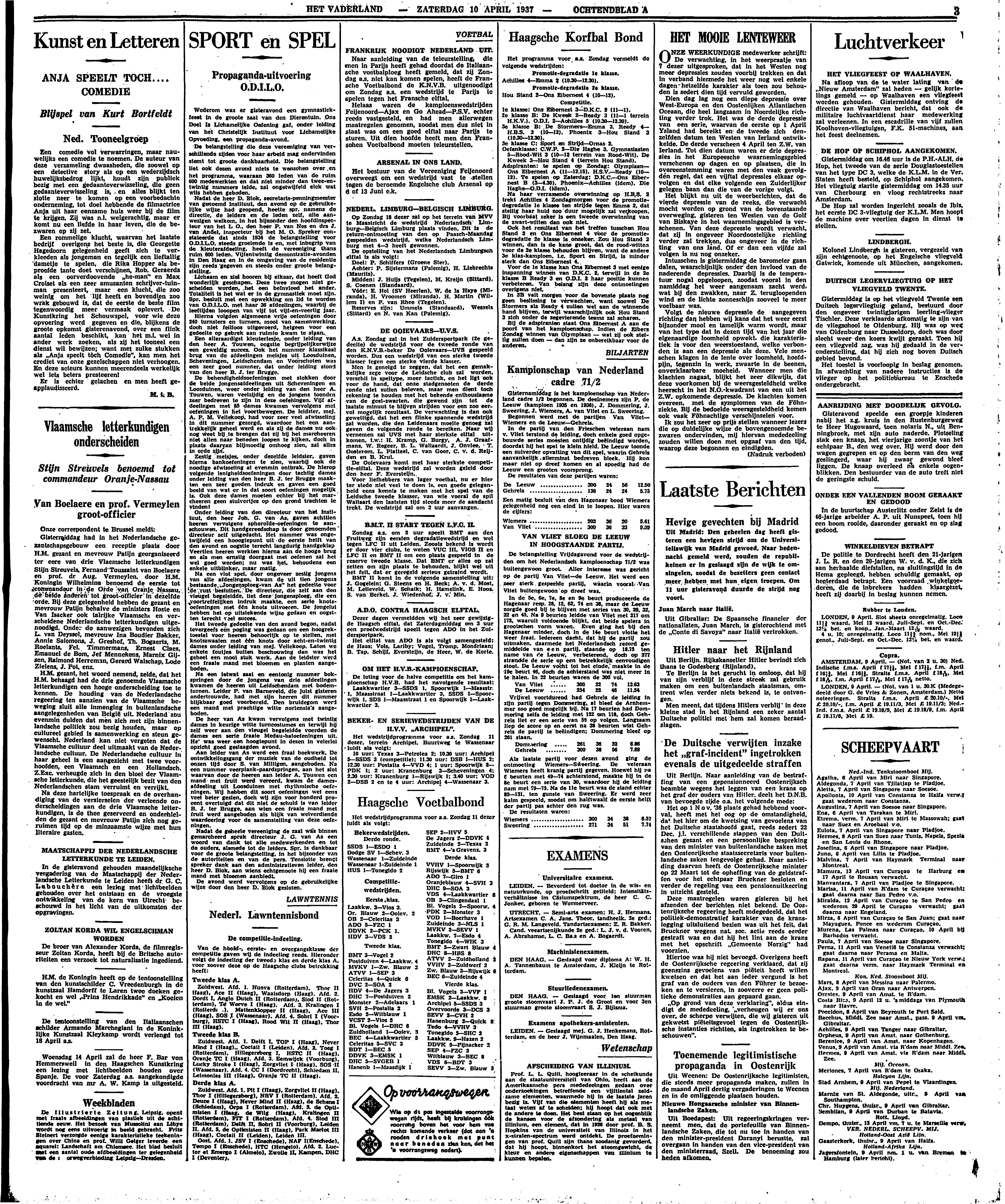 Een rommelige klucht, waarvan het laatste bedrijf overigens het beste is, die Georgette Hagedoorn gelegenheid geeft zich te verkleeden als jongeman en tegelijk een lieftallig dametje te spelen, die Rika Hopper als beproefde tante doet verschijnen, Rob. Geraerds als een oorverdoovende ‘he-man’ en Max Croiset als een zeer amusanten schrijver-tuinman presenteert, maar een klucht, die zoo weinig om het lijf heeft en bovendien zoo wrak gebouwd is, dat de eerste de beste film tegenwoordig meer vermaak oplevert. De Kunstkring het Schouwspel, voor wie deze opvoering werd gegeven en die, blijkens de groote opkomst gisterenavond, over een flink aantal leden beschikt, kan het m.i. wel in ander werk zoeken, als zij het tooneel een dienst wil bewijzen; want met zulke stukken als ‘Anja speelt tòch Comedie’, kan men het crediet van onze gezelschappen niet verhoogen. En deze acteurs kunnen meerendeels werkelijk wel iets beters presteeren!