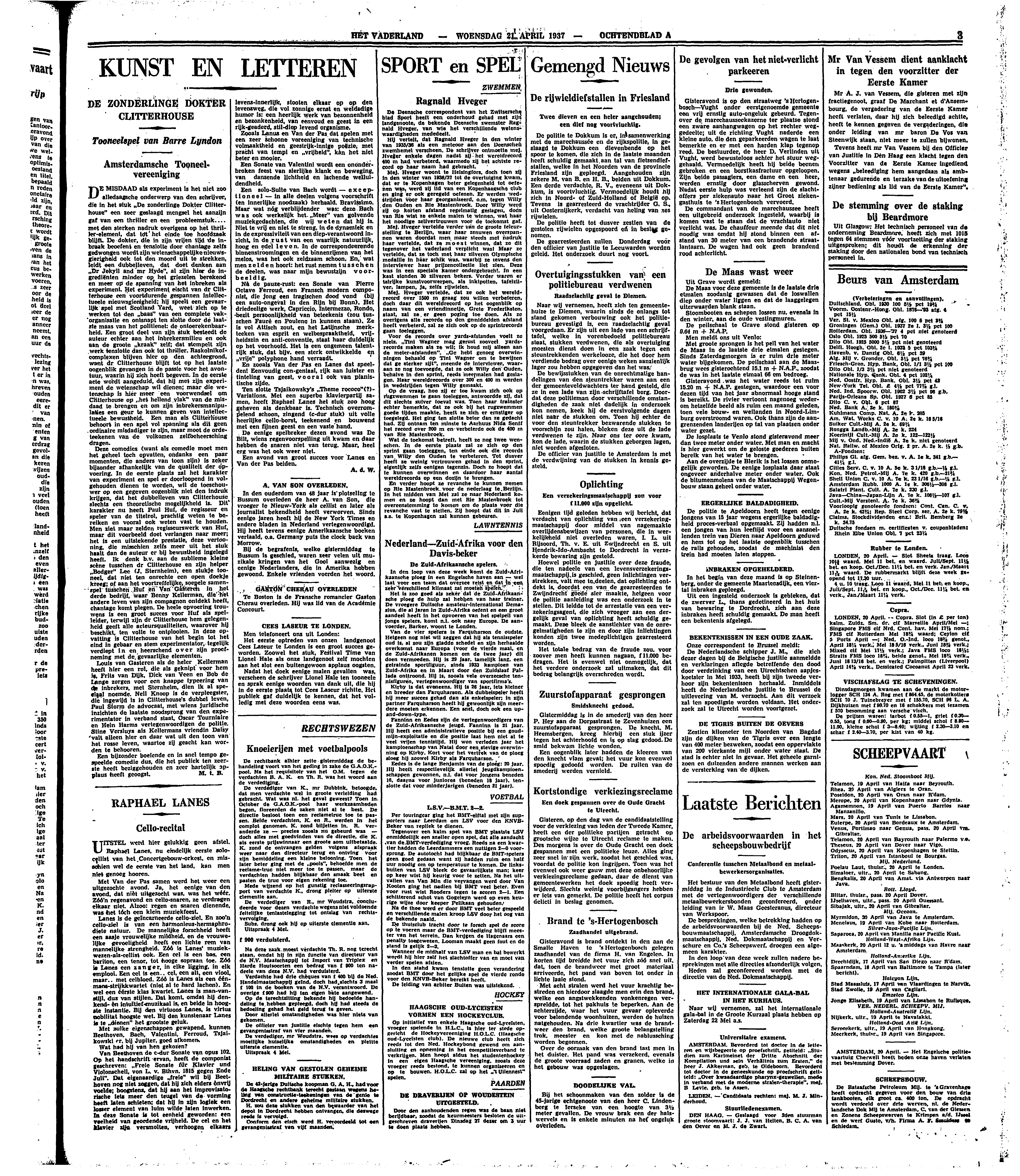 DE MISDAAD als experiment is het niet zoo alledaagsche onderwerp van den schrijver, die in het stuk ‘De zonderlinge Dokter Clitterhouse’ een zeer geslaagd mengsel het aanzijn gaf van een thriller en een probleemstuk.... met den sterken nadruk overigens op het thriller-element, dat tot het einde toe hoofdzaak blijft. De dokter, die in zijn vrijen tijd de inbraak beoefent en tenslotte door chantage zelfs gedwongen wordt zijn wetenschappelijke nieuwsgierigheid ook tot den moord uit te strekken, leidt een dubbelleven, dat doet denken aan ‘Dr Jekyll and mr Hyde’, al zijn hier de ingrediënten minder op het griezelen berekend en meer op de spanning van het inbreken als experiment. Het experiment eischt van dr Clitterhouse een voortdurende gespannen intellectueele nieuwsgierigheid; hij speelt een gevaarlijk spel met Scotland Yard, weet zich op te werken tot den ‘baas’ van een complete vakorganisatie en ontsnapt ten slotte door de laatste maas van het politienet: de ontoerekenbaarheid. Een groot deel van zijn stuk besteedt de auteur echter aan het inbrekersmilieu en ook aan de groote ‘kraak’ zelf; dat stempelt zijn werk tenslotte dan ook tot thriller. Raskolnikofcomplexen blijven hier op den achtergrond, want dr Clitterhouse blijft tot op het laatste oogenblik gevangen in de passie voor het avontuur, waarin hij zich heeft begeven. In de eerste acte wordt aangeduid, dat hij met zijn experiment de wetenschap wil dienen; maar die wetenschap is hier meer een voorwendsel om Clitterhouse op ‘het hellend vlak’ van de misdaad te brengen en om zijn inbrekersmanipulaties een geur te kunnen geven van intellectueele bewustheid. Een man als Clitterhouse behoort in een spel vol spanning als dit geen ordinaire misdadiger te zijn, maar moet de ordeteekenen van de volkomen zelfbeheersching dragen.