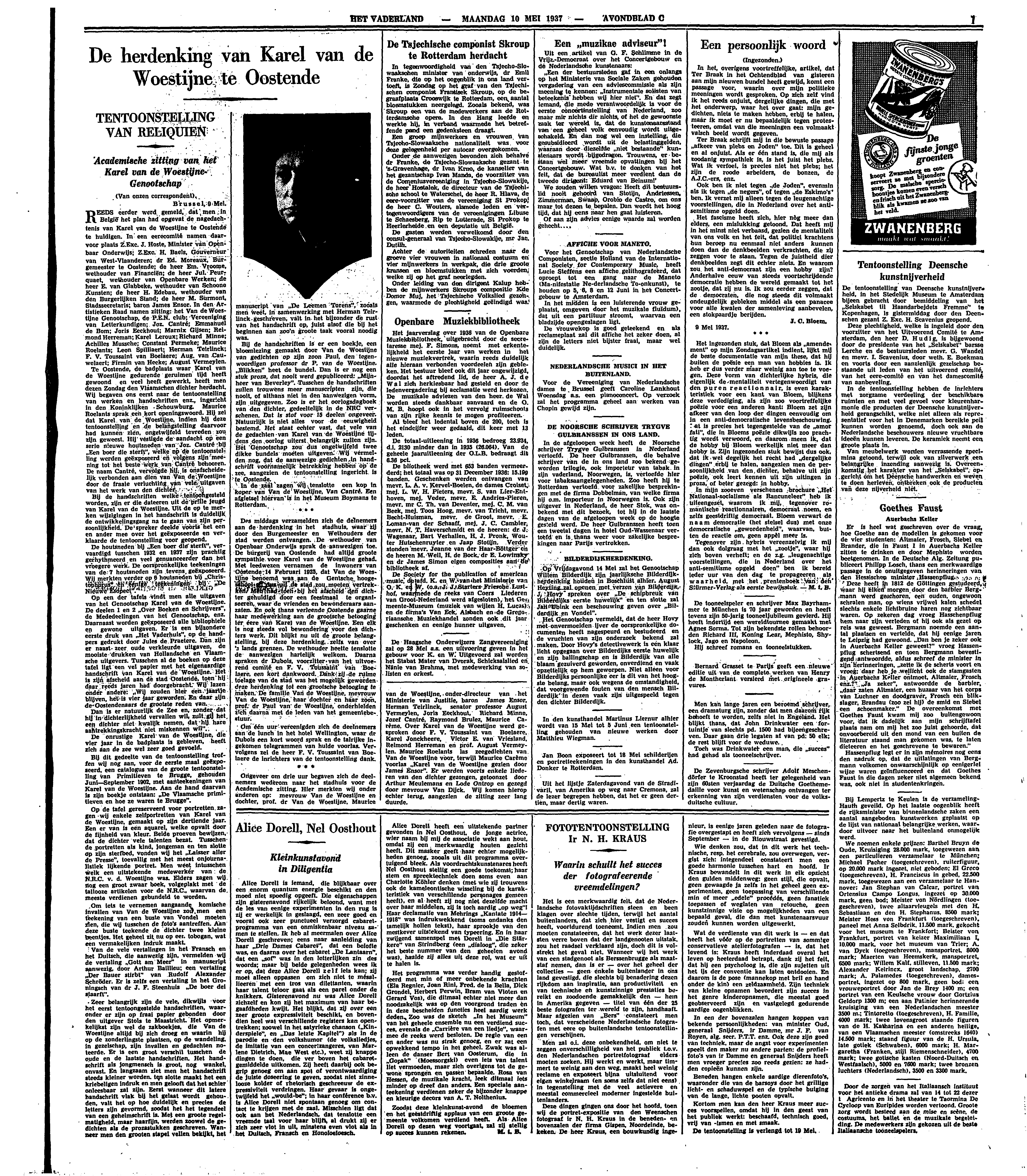 Alice Dorell heeft een uitstekende partner gevonden in Nel Oosthout, de jonge actrice, wier naam bij mij de associatie wekt aan hout, omdat zij een merkwaardig houten gezicht heeft. Dit masker geeft haar echter mogelijkheden genoeg, zooals uit dit programma overtuigend bleek. Als voordrachtskunstenares heeft Nel Oosthout stellig een goede toekomst; haar stem en spreektechniek doen soms even aan Charlotte Köhler denken (met wie zij trouwens ook de kameleontische wisseling bij de karakteristiek van verschillende personages gemeen heeft), en al heeft zij nog niet dezelfde macht over haar middelen, zij is toch aardig ‘op weg’! Haar declamatie van Mehrings ‘Kantate 1914-1918’ was indrukwekkend (soms ondanks den tamelijk hollen tekst), haar sprookje van den mestkever uitstekend van typeering. En in haar zwijgend samenspel met Dorell in ‘Die Stärkere’ van Strindberg (een ‘dialoog’, die zeker het beste nummer van den geheelen avond was), haalde zij alles uit deze rol, wat er uit te halen is.