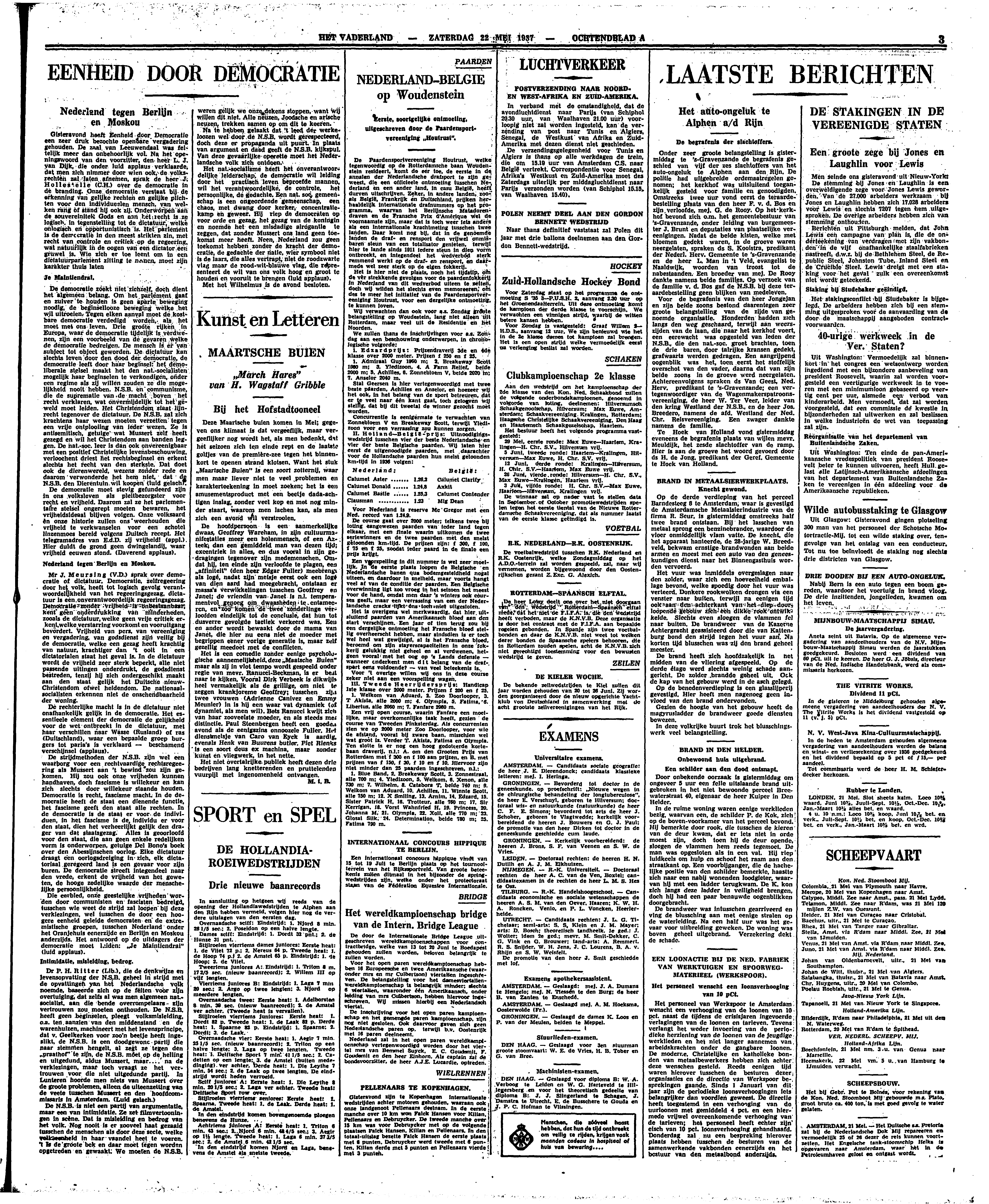 Deze Maartsche buien komen in Mei; gegeven ons klimaat is dat vergeeflijk, maar vergeeflijker nog wordt het, als men bedenkt, dat het seizoen zich ten einde rept en de laatste golfjes van de première-zee tegen het binnenkort te openen strand klotsen. Want het stuk ‘Maartsche Buien’ is een soort zotternij, waar men maar liever niet te veel problemen en karakterteekening in moet zoeken; het is een amusementsproduct met een beetje dada-achtigen inslag, zonder veel kop en met nog minder staart, waarom men lachen kan, als men zich een avond wil verstrooien.