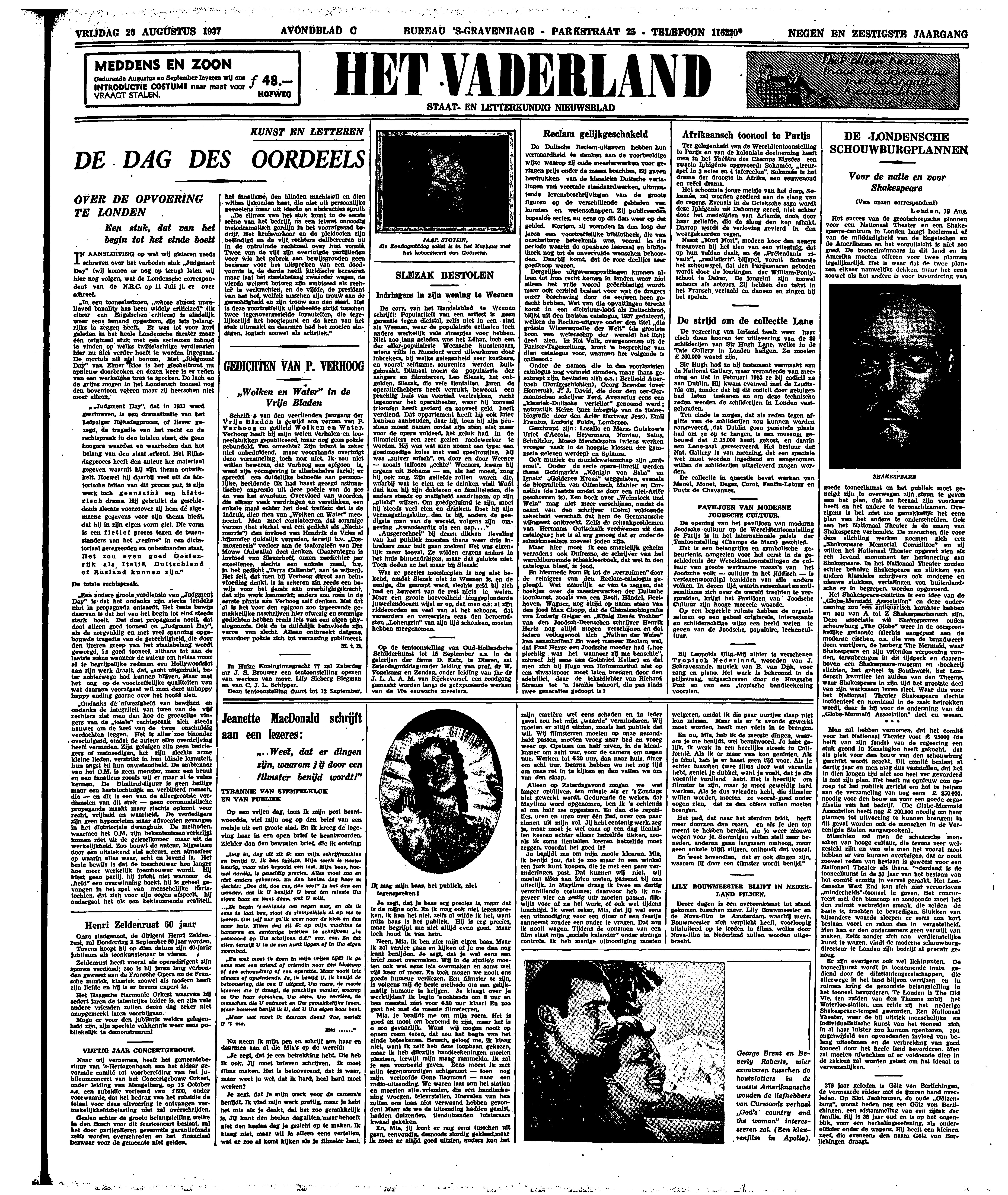 ‘In een tooneelseizoen, ‘whose almoest unrelieved banality has been widely criticized’ (ik citeer een Engelschen criticus) is eindelijk weer eens iemand opgestaan, die iets belangrijks te zeggen heeft. Er was tot voor kort geleden in het heele Londensche theater maar één origineel stuk met een serieuzen inhoud te vinden op welks twijfelachtige verdiensten hier nu niet verder hoeft te worden ingegaan. De mortuls nil nisi bonum. Met ‘Judgment Day’ van Elmer Rice is het giechelfront nu opnieuw doorbroken en dezen keer is er reden van een werkelijke bres te spreken. De lach en de grijns mogen in het Londensch tooneel nog den boventoon voeren maar zij heerschen niet meer alleen.