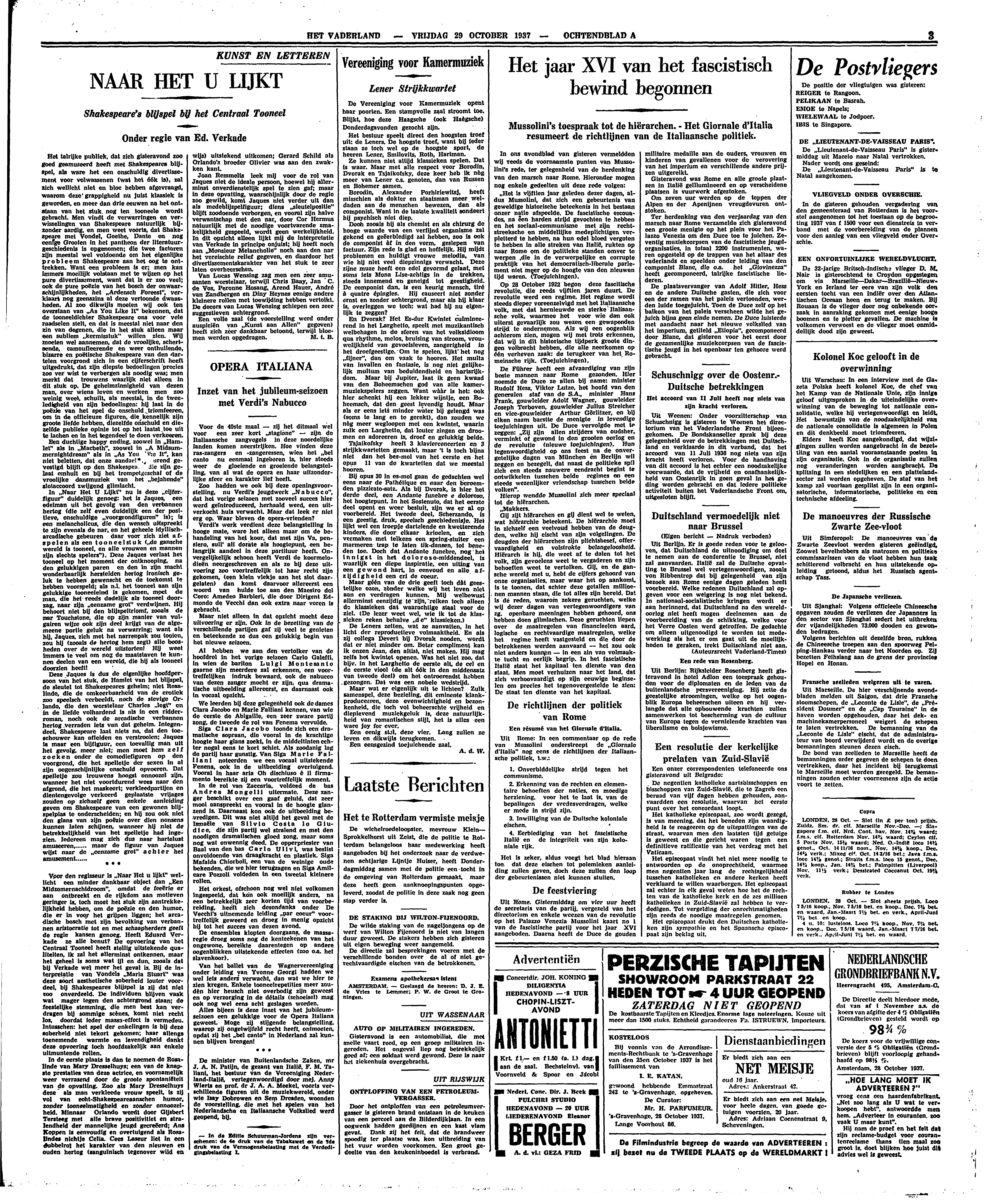 Het talrijke publiek, dat zich gisteravond zoo goed geamuseerd heeft met Shakespeares blijspel, als ware het een onschuldig divertissement voor volwassenen (wat het óók is), zal zich wellicht niet en bloc hebben afgevraagd, waarom deze grappigheid nu juist klassiek is geworden, en meer dan drie eeuwen na het ontstaan van het stuk nog ten tooneele wordt gebracht. Men vindt de verwarringen en verwisselingen van Shakespeare natuurlijk bijzonder aardig, en men weet voorts, dat Shakespeare met Vondel, Goethe, Dante en nog eenige Grooten in het pantheon der literatuurgeschiedenis is opgenomen; die twee factoren zijn meestal wel voldoende om het eigenlijke probleem Shakespeare aan het oog te onttrekken. Want een probleem is er; men kan immers moeilijk volstaan met te wijzen op het pure divertissement, want dat is er zoo veel; ook de pure poëzie van het bosch der onwaarschijnlijkheden, het ‘Ardensch Foreest’, verklaart nog geenszins al deze vertoonde dwaasheden. Al zoo dikwijls moeten wij ook ten overstaan van ‘As You Like It’ bekennen, dat de tooneeldichter Shakespeare ons voor vele raadselen stelt, en dat is meestal niet naar den zin van degenen, die in het stuk alleen maar een subliem ‘kermisstuk’ willen zien. Wij moeten wel aannemen, dat de vroolijke, schertsende, camoufleerende en weer onthullende, bizarre en poëtische Shakespeare van den dartelen voorgrond zich in een cijferschrift heeft uitgedrukt, dat zijn diepste bedoelingen precies zoo ver wist te verbergen als noodig was; men merkt dat trouwens waarlijk niet alleen in dit stuk op. De geheimzinnigheid van dezen man, over wiens leven en werken men zoo weinig weet, schuilt, als meestal, in de tweeledigheid van zijn bedoelingen: hij laat in de poëzie van het spel de onschuld triomfeeren, om in de officieuze figuren, die kennelijk zijn groote liefde hebben, diezelfde onschuld en diezelfde publieke opinie tot op het laatst toe uit te lachen en in het tegendeel te doen verkeeren.